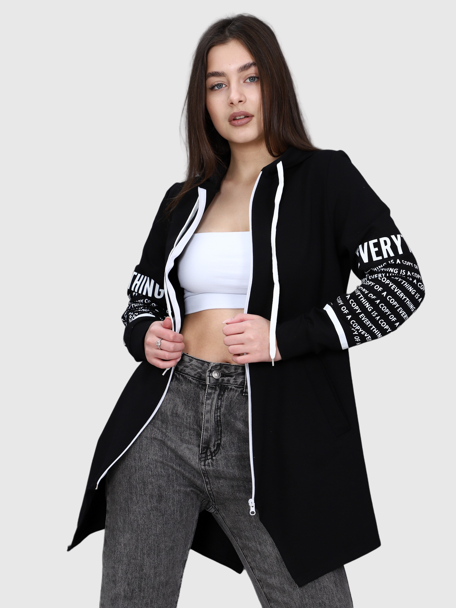 Женская толстовка выполнена из трикотажного полотна "футер вискозный". Удлинённая толстовка А-образного силуэта с капюшоном, на передних частях толстовки карманы с листочкой, рукав втачной на манжете, низ толстовки разноуровневый, на спинке разрез в форме галочки. Так же на спинке и рукавах имеется принт, молния и шнур капюшона в цвет принта.