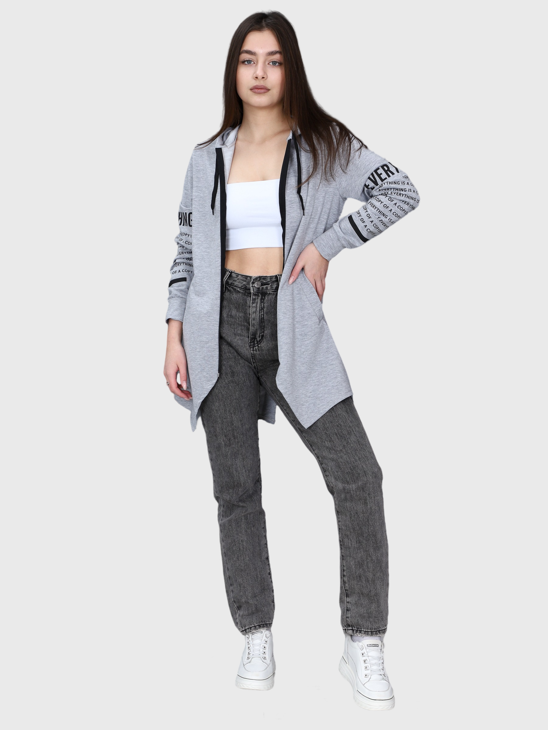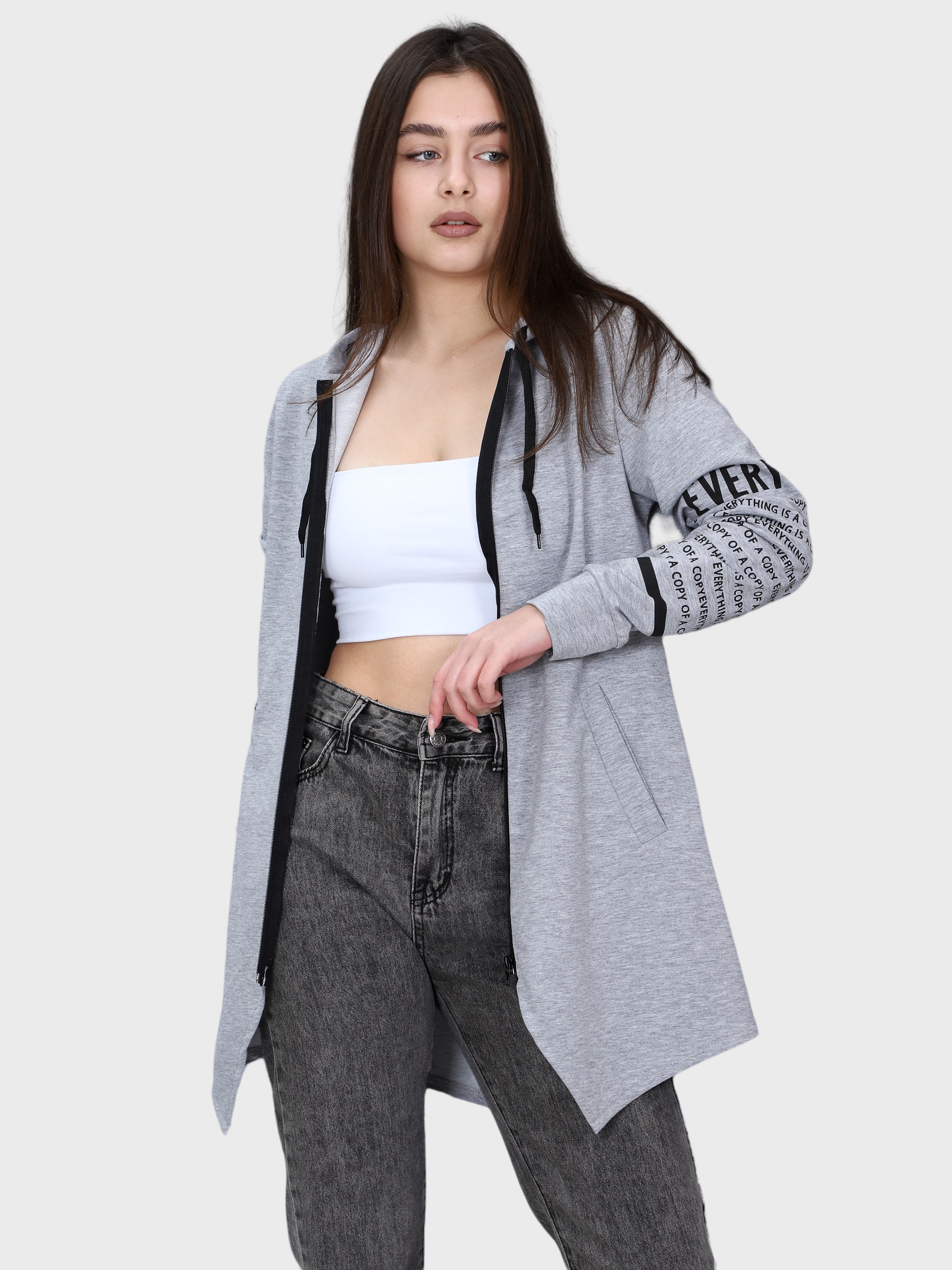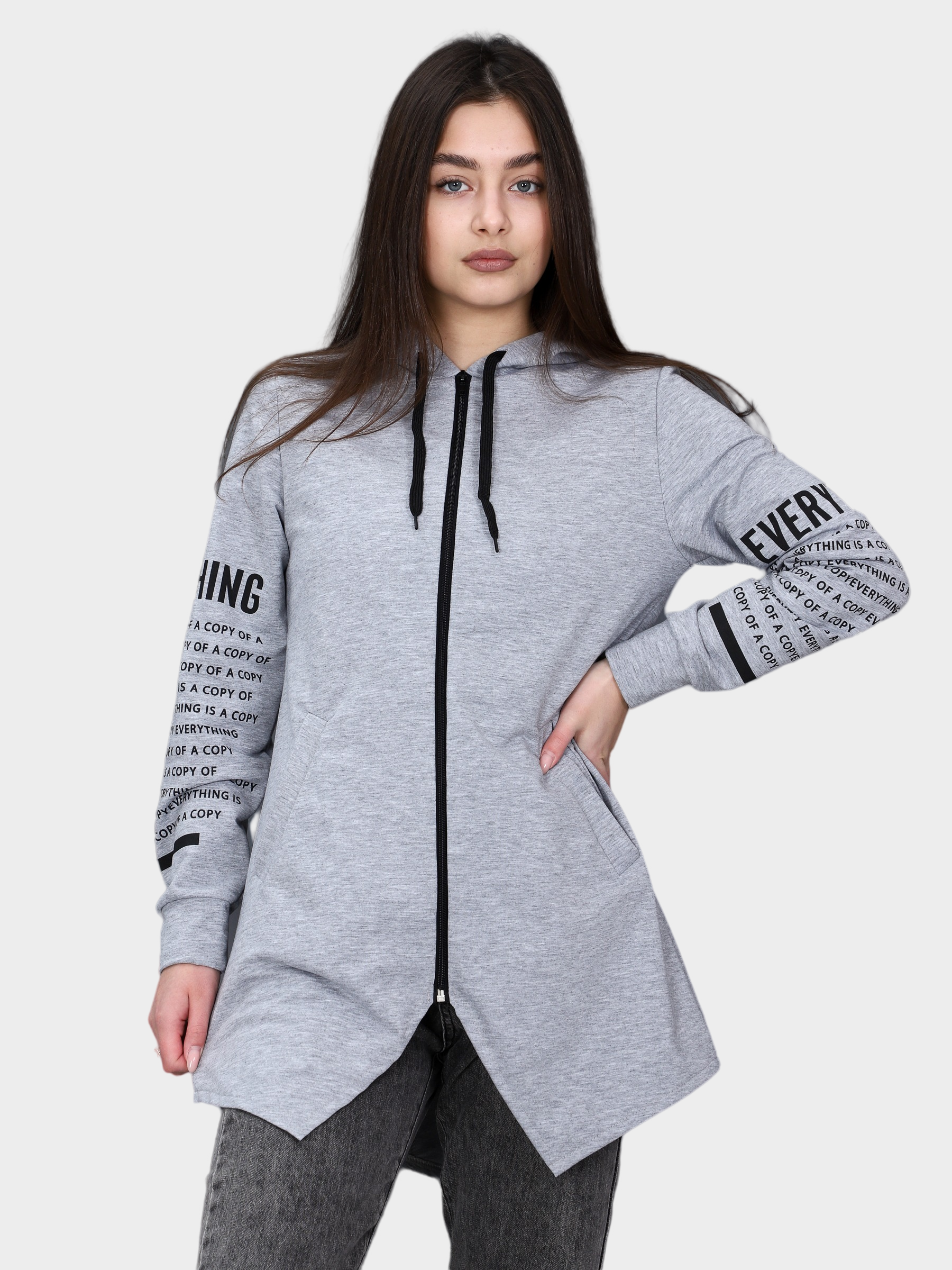 Женская толстовка выполнена из трикотажного полотна "футер вискозный". Удлинённая толстовка А-образного силуэта с капюшоном, на передних частях толстовки карманы с листочкой, рукав втачной на манжете, низ толстовки разноуровневый, на спинке разрез в форме галочки. Так же на спинке и рукавах имеется принт, молния и шнур капюшона в цвет принта.