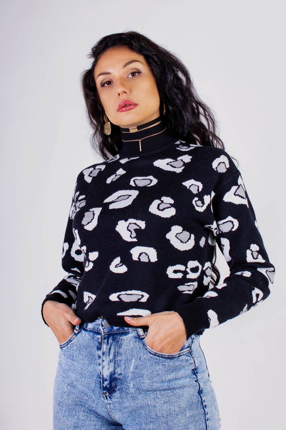 Стильный и модный укороченный джемпер с фиксатором по талии станет незаменимой частью вашего гардероба в любом сезоне. Этот джемпер выполнен в черно-белой гамме с эффектным леопардовым рисунком, который привлекает внимание. Джемпер имеет длинные рукава и округлую горловину, что делает его универсальным и комфортным вариантом для повседневной носки. Он идеально сочетается как с джинсами, так и с юбками, придавая образу стильный и современный вид. Фиксатор по талии позволяет регулировать длину джемпера, создавая эффект тонкой талии и подчеркивая ваши достоинства.