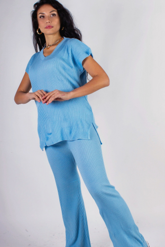 Костюм выполнен в нежном голубом цвете, который легко вписывается в любое окружение и подчеркивает свежесть вашего образа. Футболка свободного оверсайз кроя с треугольной горловиной и слегка приспущенным рукавом от плеча придает образу расслабленный и утонченный вид. Горловина и манжеты рукавов с небольшой резинкой, а боковые разрезы внизу добавляют легкость и обеспечивают свободу движений. Брюки палаццо удобно сидят на фигуре благодаря широкой эластичной резинке, создавая эффектный и стильный силуэт. Такой дизайн прекрасно подходит как для повседневных выходов, так и для более формальных мероприятий.
