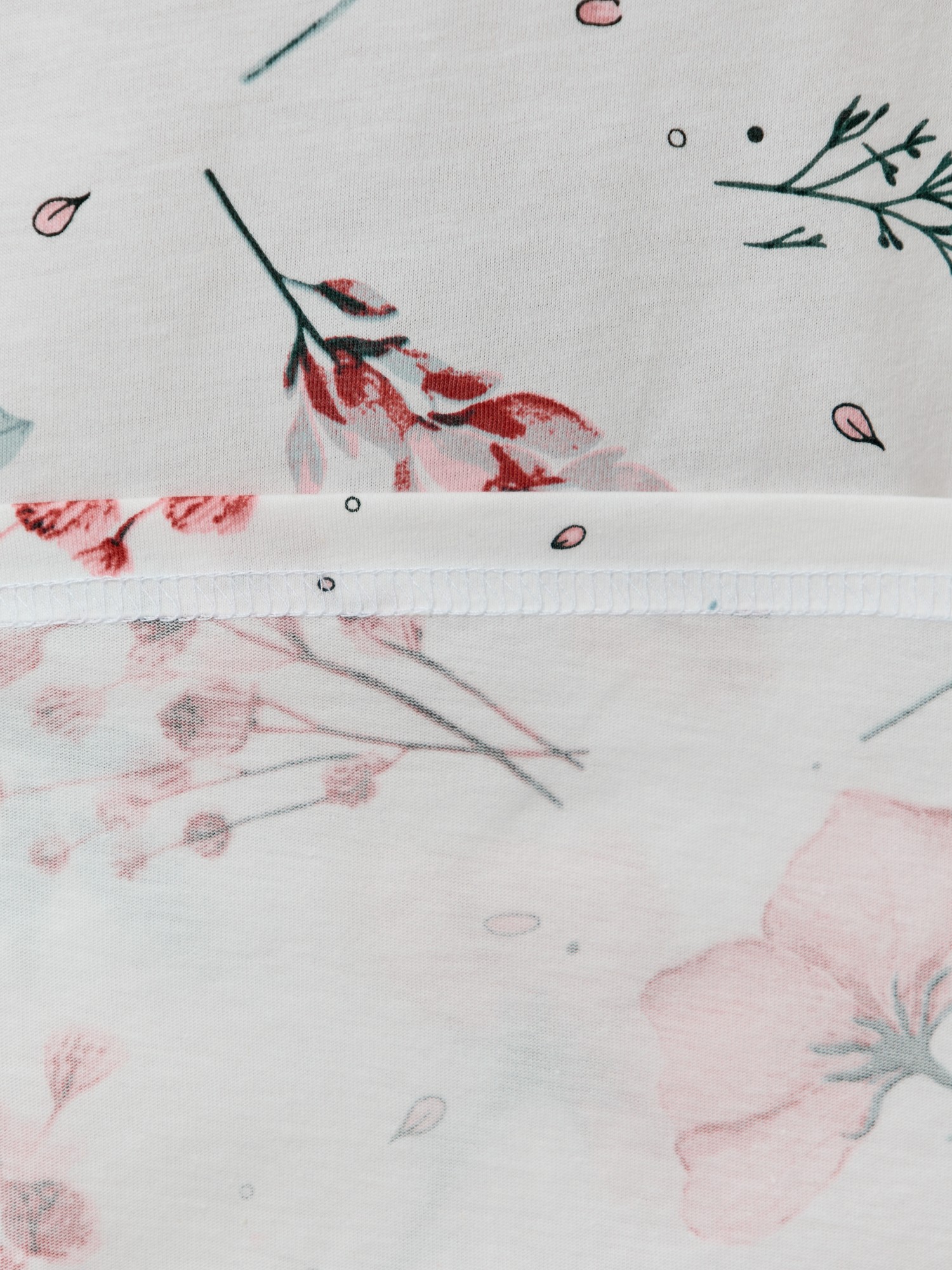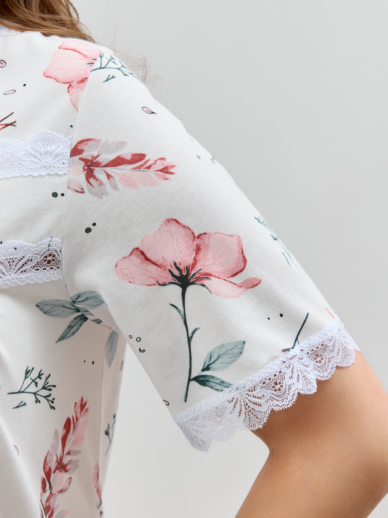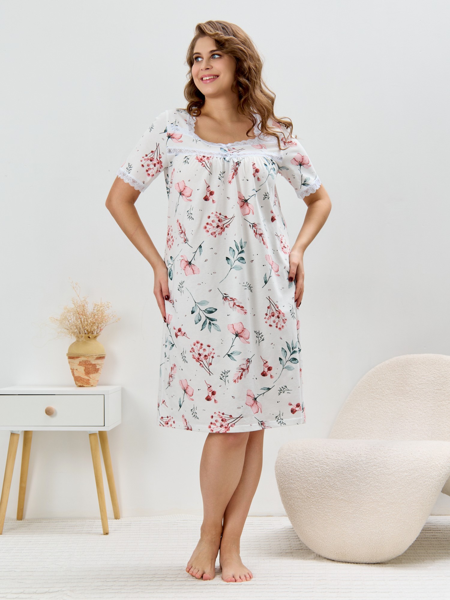 Сорочка женская из трикотажного полотна «кулирка» с набивным рисунком, свободного покроя, расширенная книзу, с короткими втачными рукавами и горловиной фигурной формы. Полочка – с притачной кокеткой V-образной формы, состоящей из двухч астей. Нижняя, основная деталь полочки присборена по шву стачивания с кокеткой. Низ рукавов, горловина и кокетка отделаны кружевом. В центре кокетки – два декоративных бантика из узкой атласной ленты