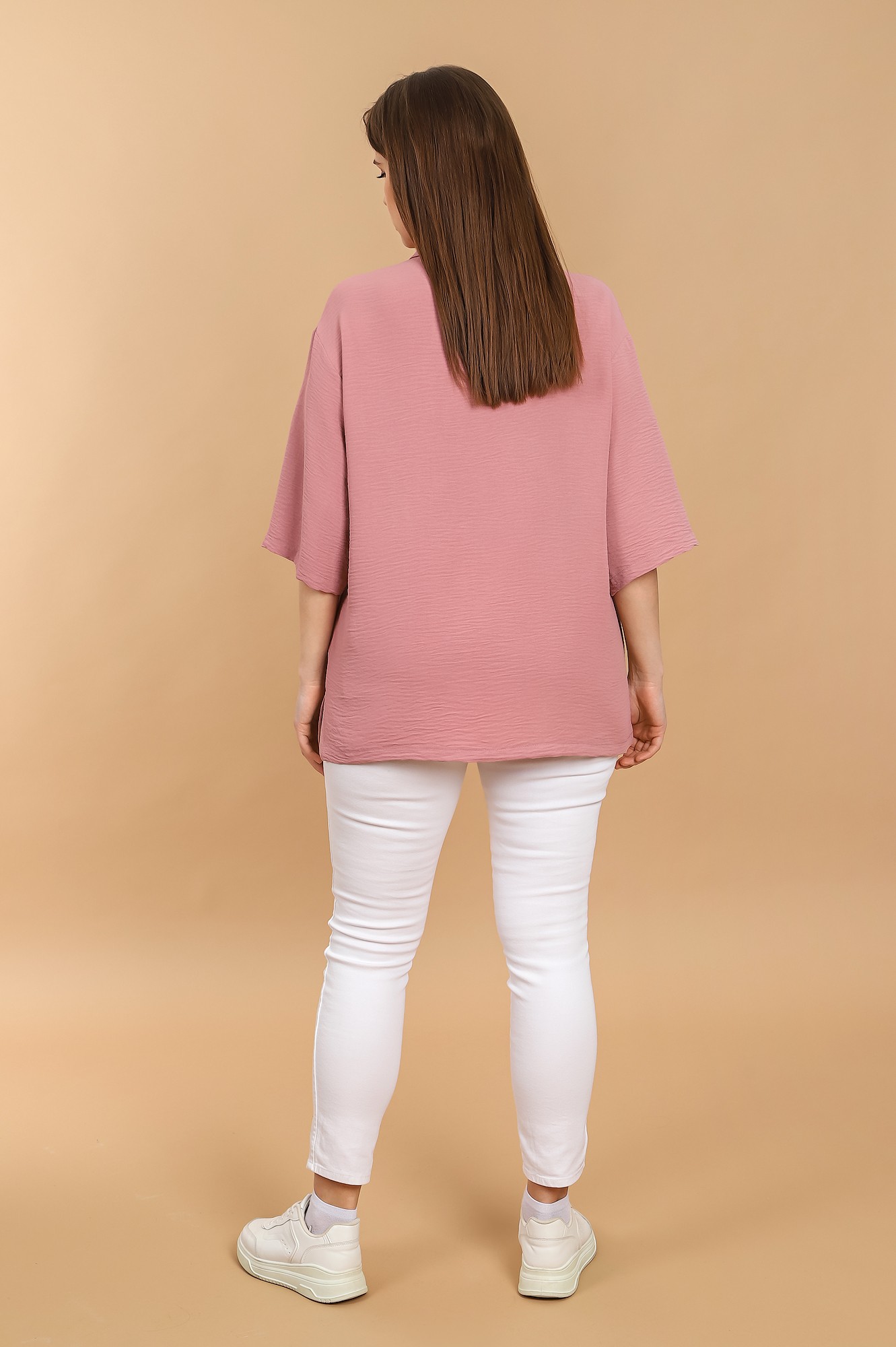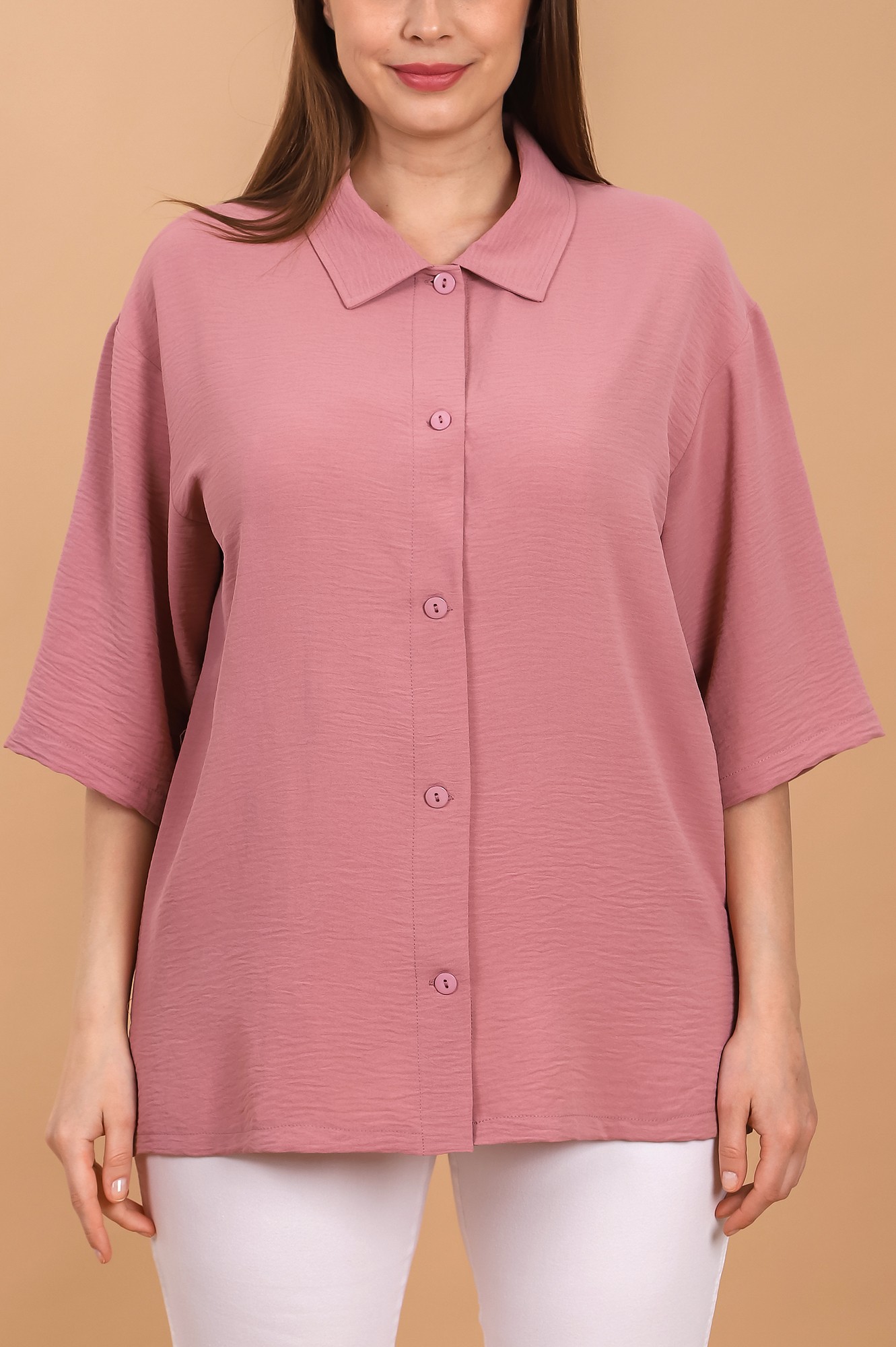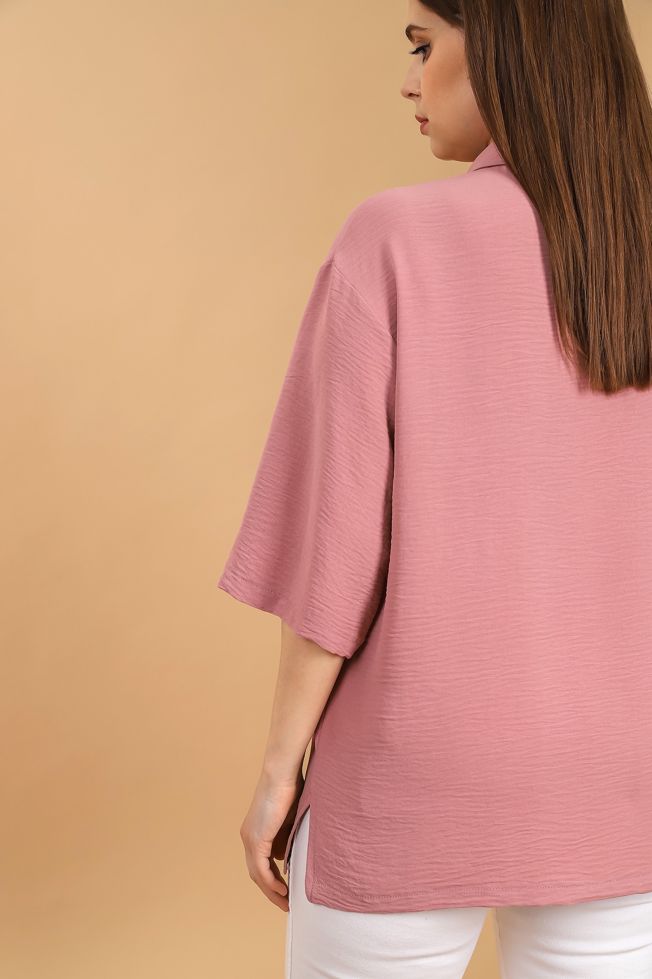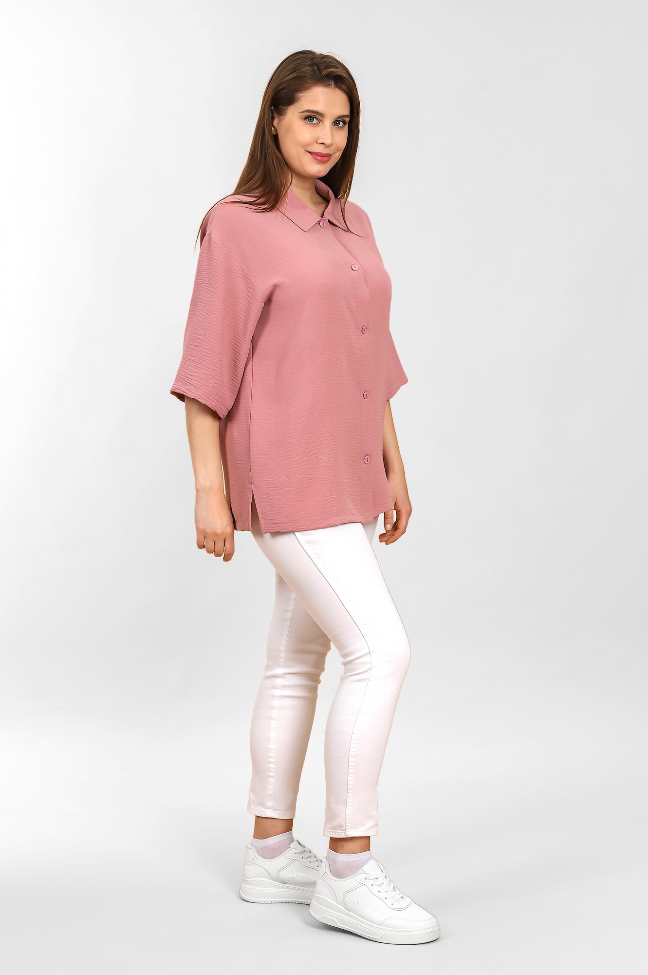 Блуза (рубашка) женская из тканого гладкокрашеного полотна «Лен Манго», свободного покроя, с короткими втачными рукавами, стояче-отложным воротником, центральной бортовой застежкой на обметанные петли и пуговицы. В боковых швах разрезы.