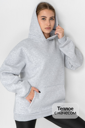 Уютная женская толстовка с капюшоном представлена в светло-сером цвете. Крой оверсайз и спущенное плечо подарят свободу движений, для удобства предусмотрен большой карман-кенгуру.
