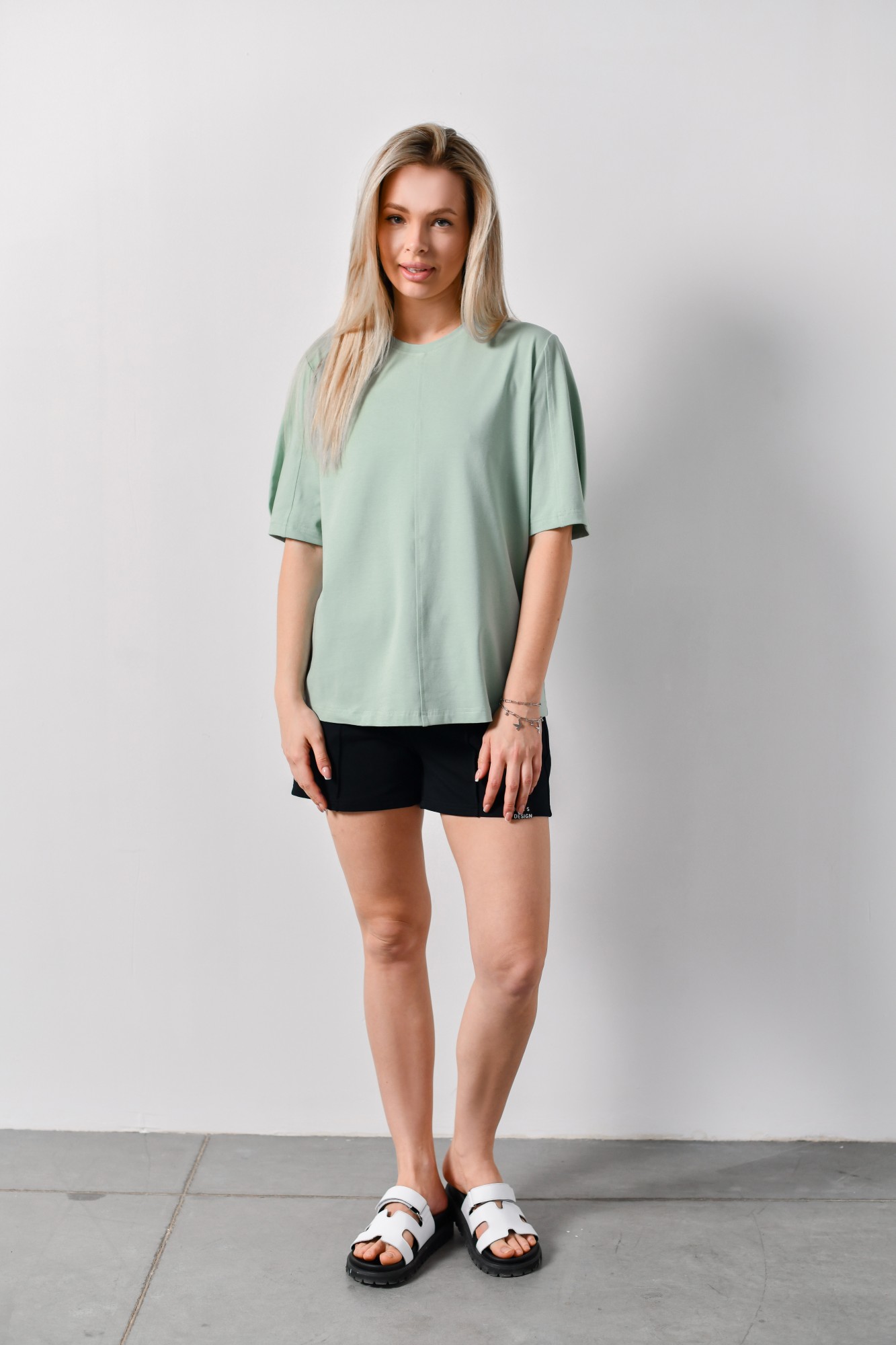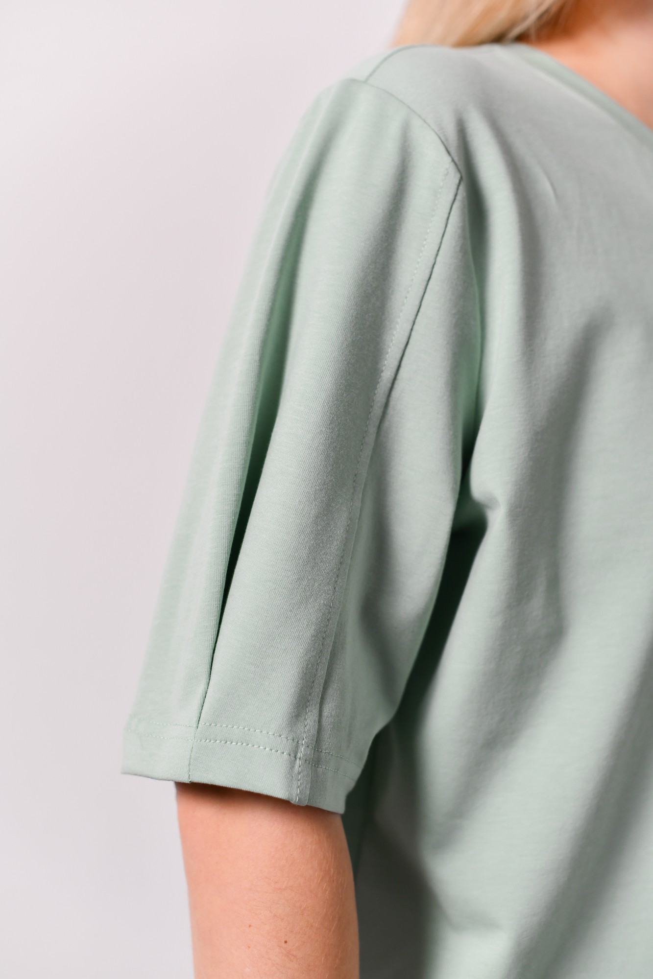 Футболка женская модной объемно-силуэтной формы, с вертикальным отстроченным швом по центру переда. На рукавах выполнены глубокие защипы по низу и также вертикальные отстроченные швы.