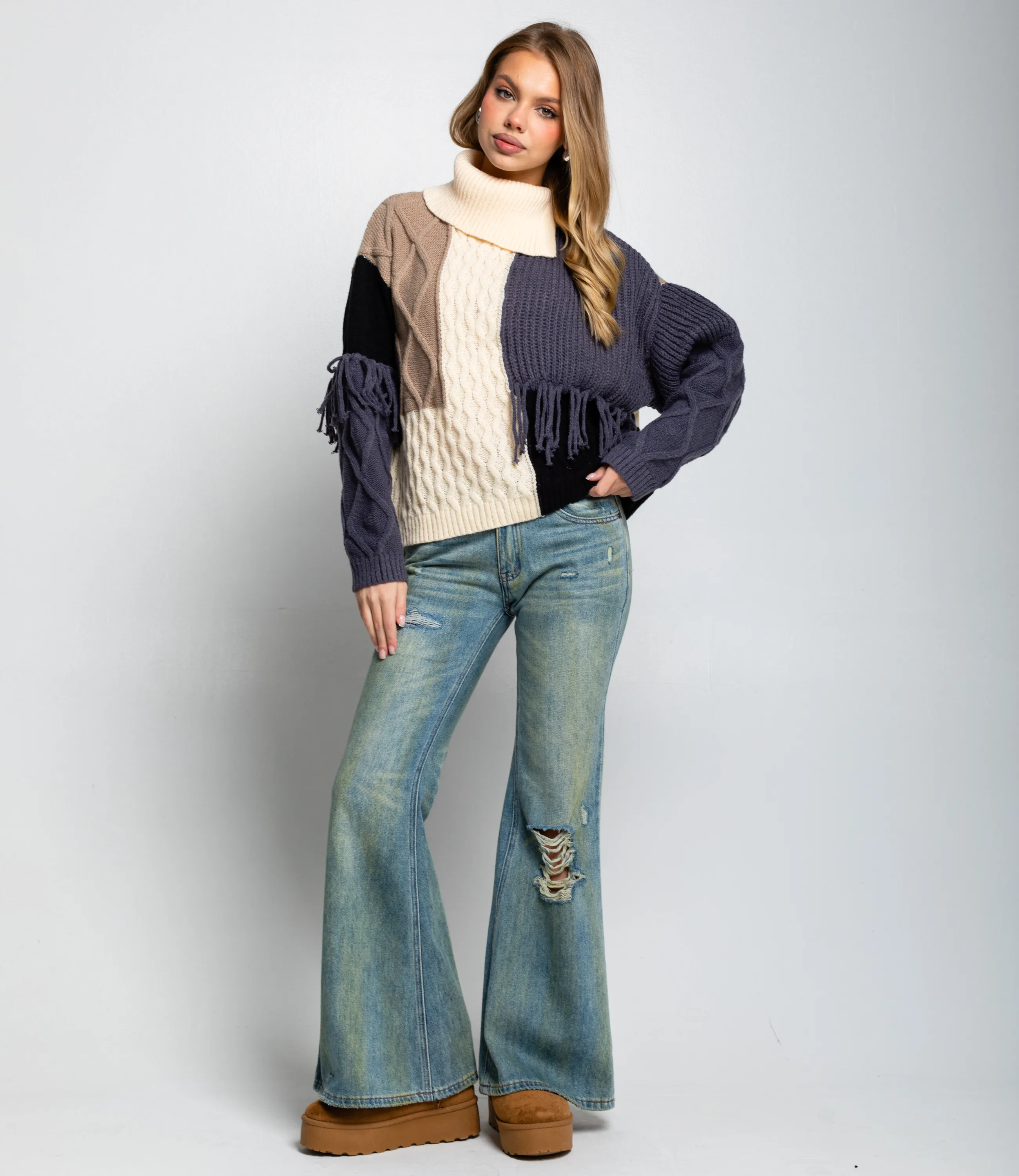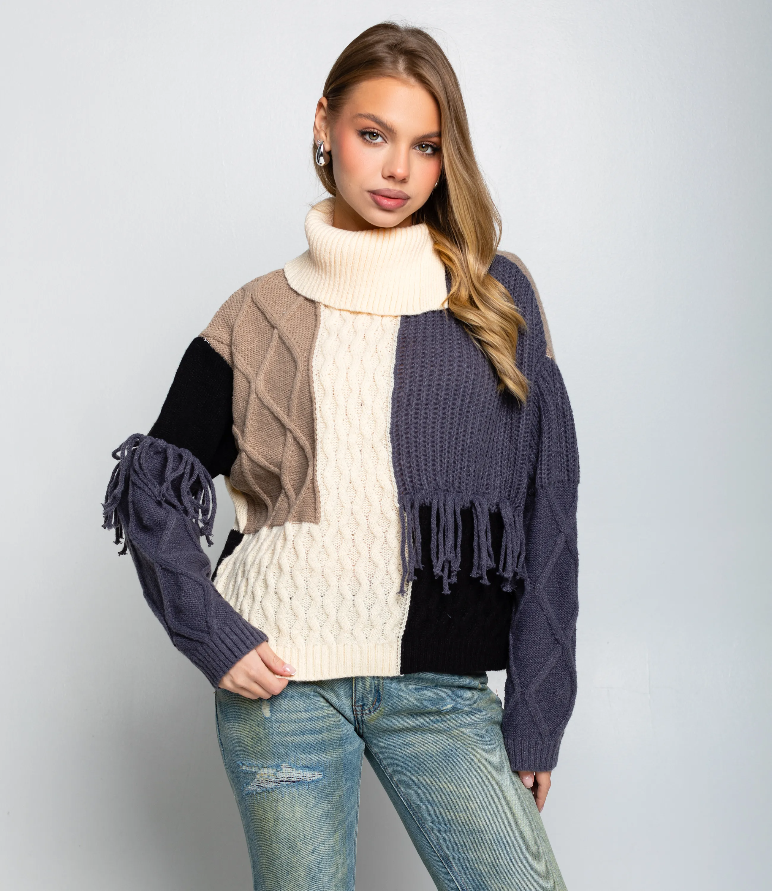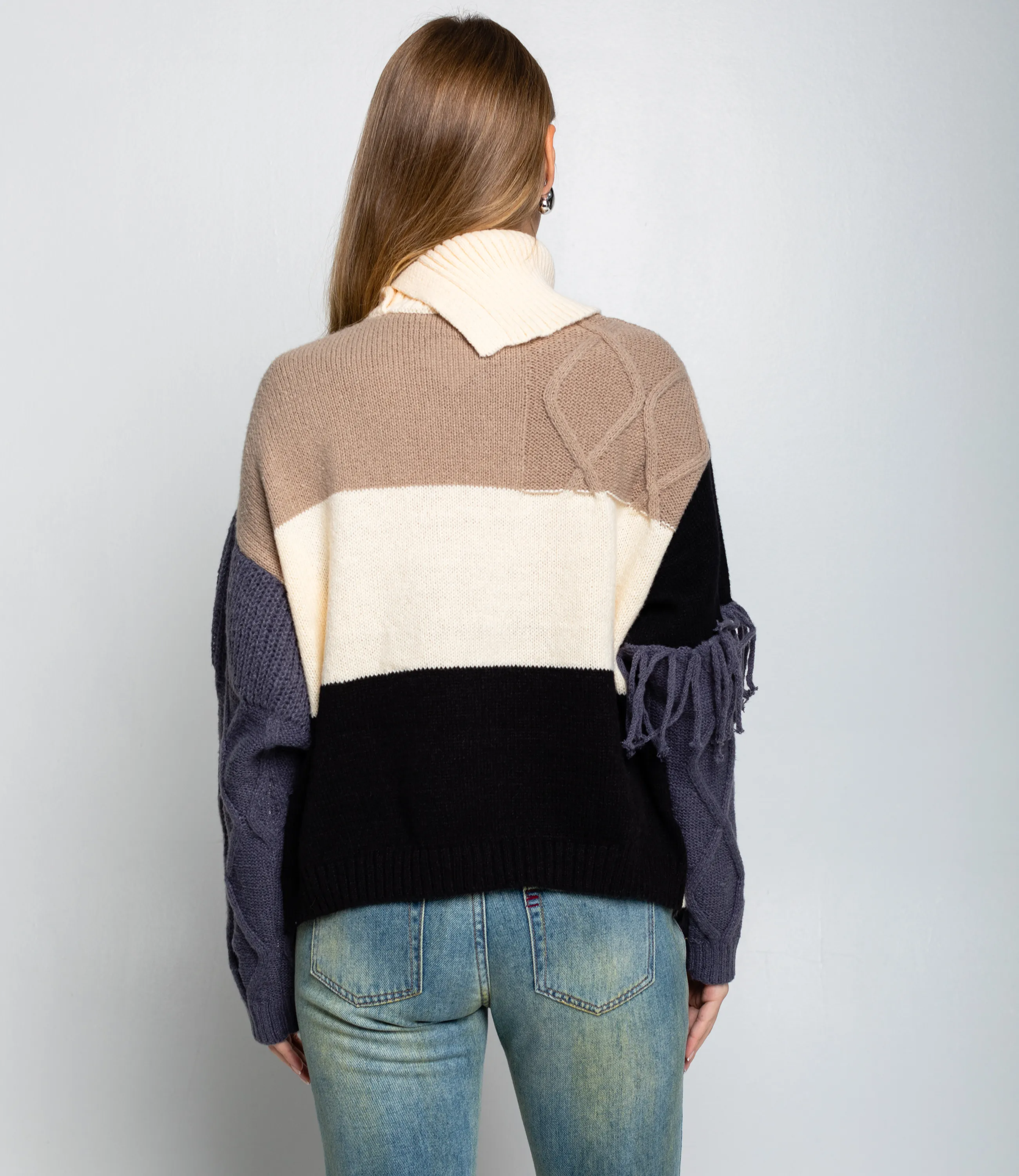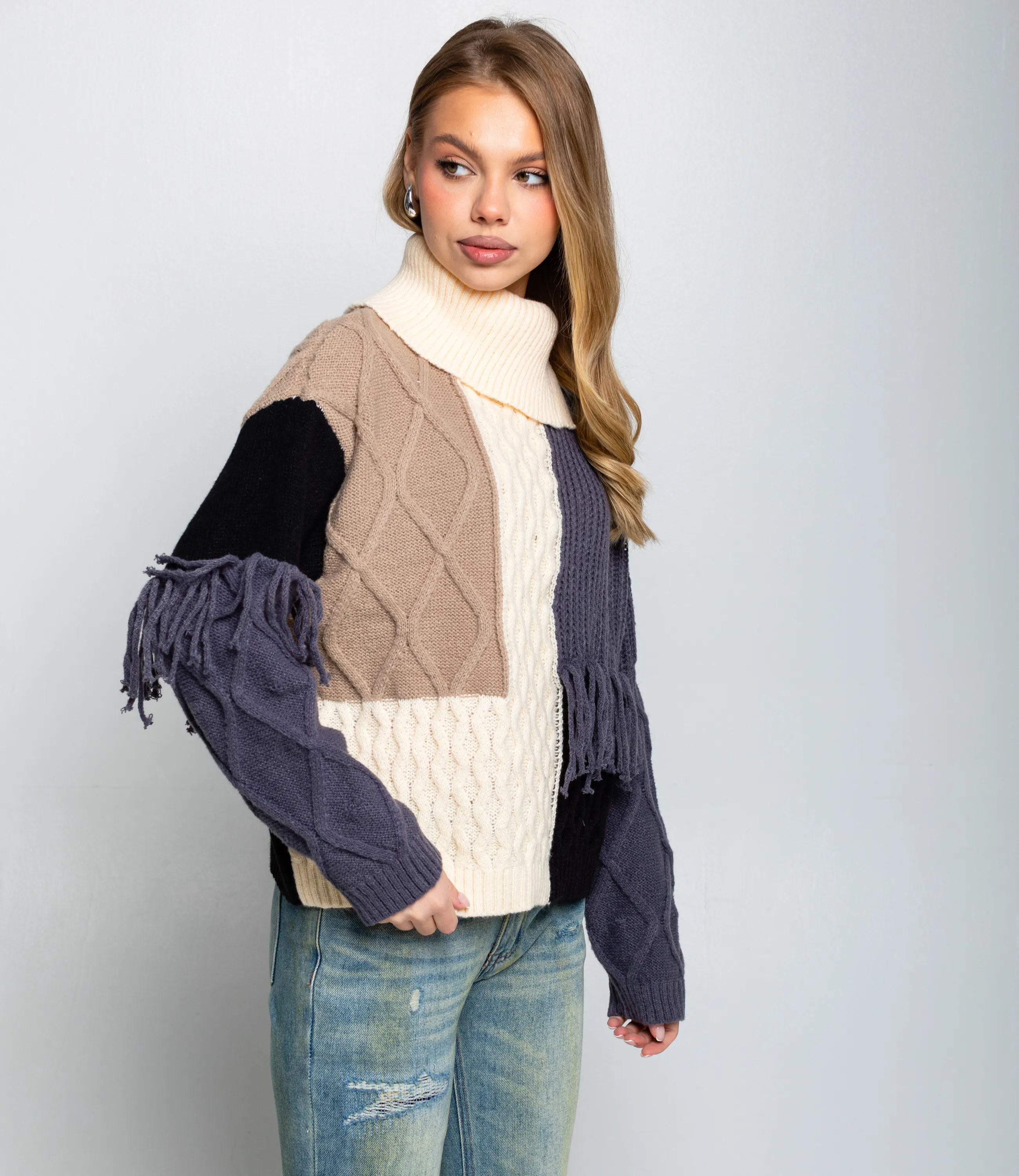 Свитер – это одежда, которая подчеркивает привлекательность и элегантность каждой представительницы прекрасного пола. Плотный вязаный свитер свободного силуэта с высоким сложенным воротником, длинными рукавами с выраженной шириной в верхней части и зауженными манжетами, соединёнными с корпусом втачными плечевыми швами; перед и спинка выполнены из нескольких видов узоров — жгутовые косы, ребристая резинка и более плотная гладкая вязка — собранные в асимметричные блоки и соединённые декоративными швами; по линии груди и на рукавах присутствуют короткие бахромные кисточки, добавляющие фактурный акцент. Для пошива использована ткань 50% акрил, 50% хлопок, которая характеризуется отличным качеством. Даже после многократных стирок изделие не утратит первоначальной красоты. Вы сможете носить его с радостью. Обратите внимание на цвет. Он является насыщенным и полностью соответствует фотографии на сайте. Чтобы вы были уверены в размере, мы представили на странице таблицу. Воспользовавшись ею, вы сможете сами обмерить себя и удостовериться. Предложенная нами цена является приемлемой. Не откажите себе в удовольствии быть элегантной! Рост модели 168 см., 89-63-90. Вы можете заказать онлайн презентацию на интересующие Вас модели. Наши менеджеры свяжутся с Вами и проведут индивидуальную видеотрансляцию, помогут составить заказ и ответят на Ваши вопросы.