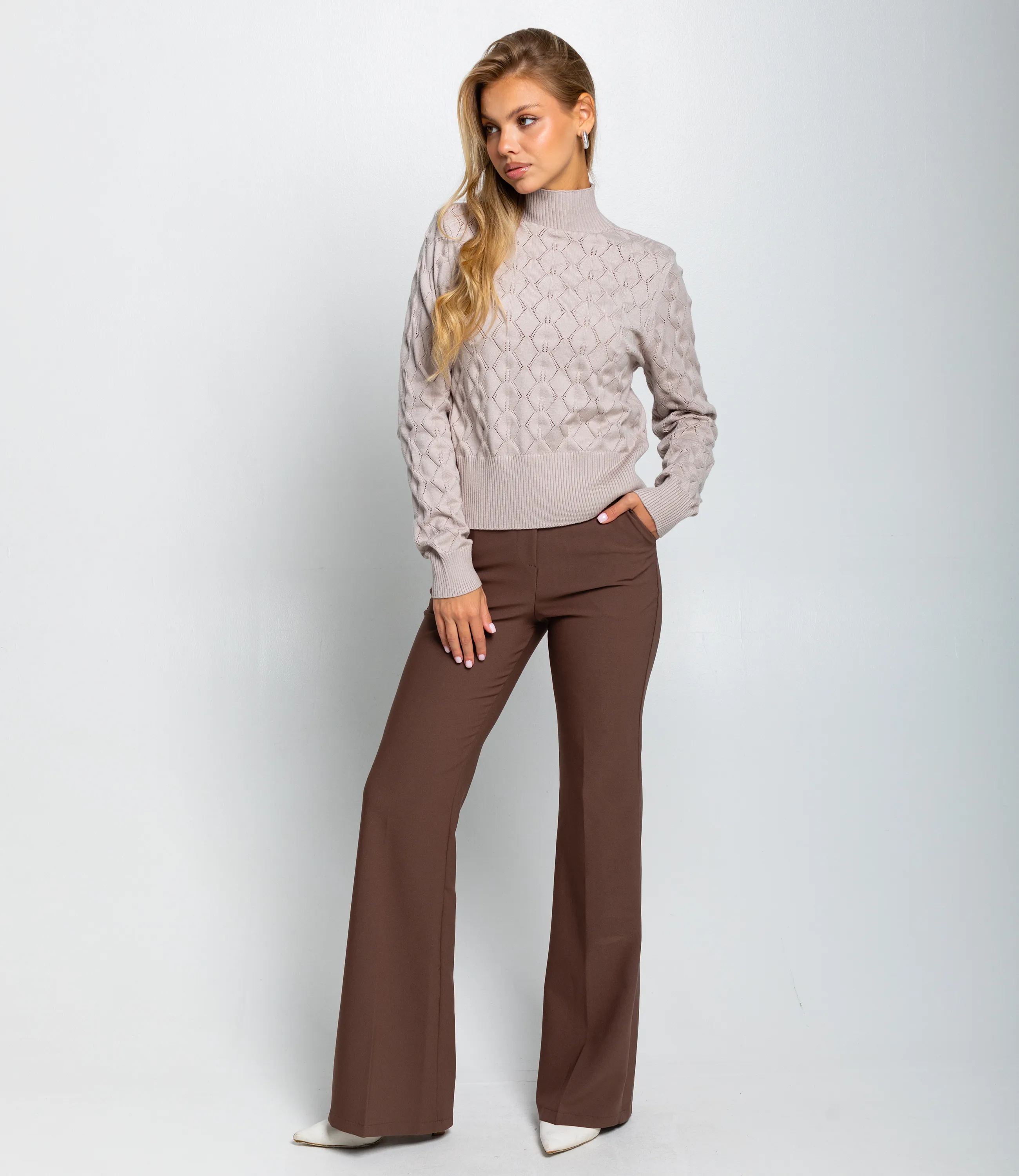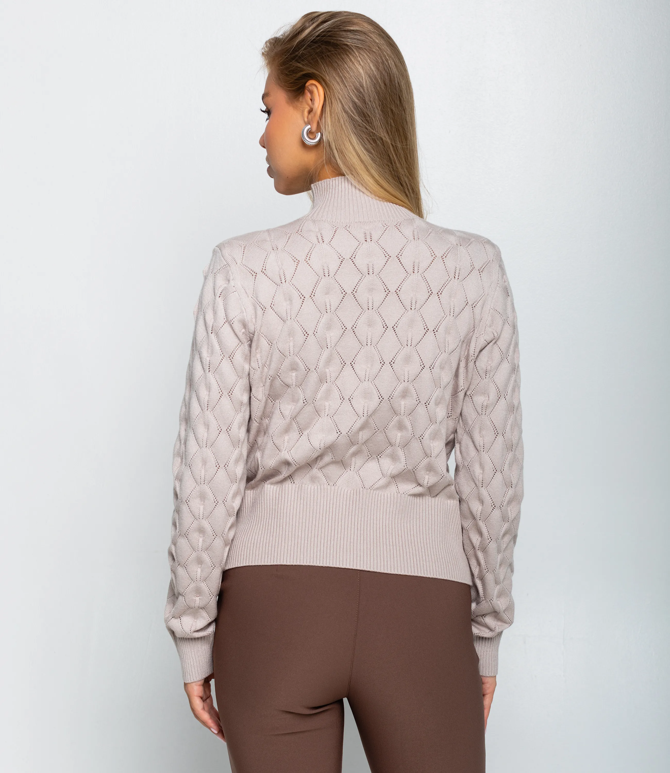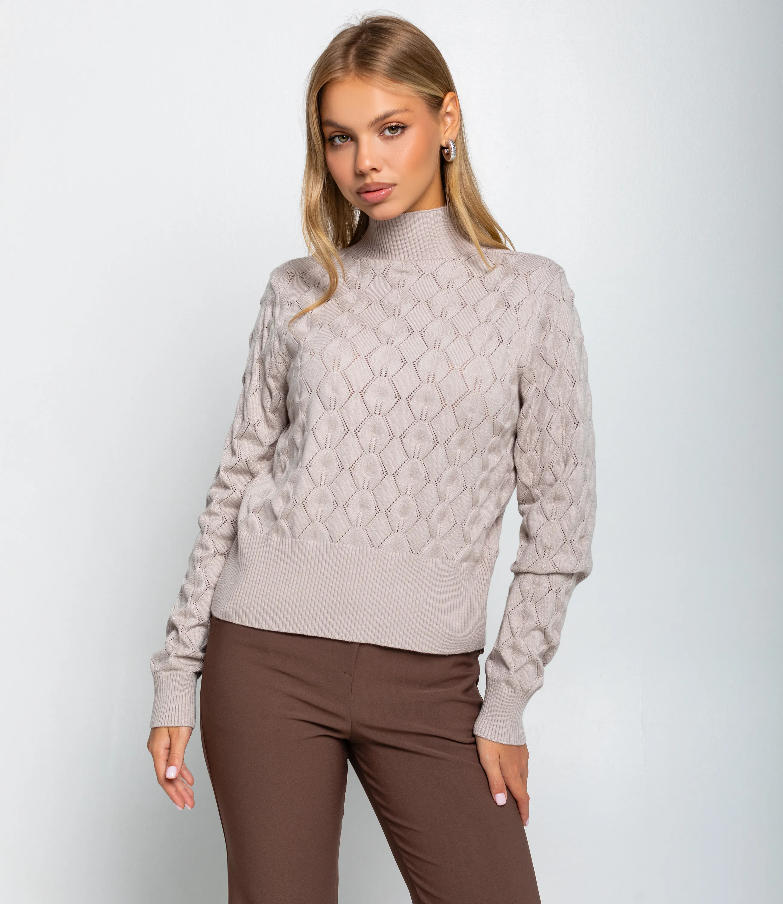 Свитер – это одежда, которая подчеркивает привлекательность и элегантность каждой представительницы прекрасного пола. Свитер прямого полуприталенного силуэта длиной до линии бёдер с плотной резинкой по низу, которая слегка подчёркивает талию; длинные слегка облегающие рукава с узкими манжетами той же рубчатой фактуры; высокая узкая горловина‑стойка средней высоты, плотно прилегающая к шее, выполнена в мелкую рубчатую вязку; основное полотно с рельефным ажурным рисунком ромбовидной геометрии, сформированным сочетанием плотных и открытых участков вязки с вертикальными нитевыми стежками между элементами, создающими лёгкую «сетчатую» глубину; широкая резинка по низу и плотные манжеты обеспечивают усадку и удержание тепла, контрастируя с ажурной текстурой. Для пошива использована ткань 70% акрил, 20% щерсть и 10% полиэстер, которая характеризуется отличным качеством. Даже после многократных стирок изделие не утратит первоначальной красоты. Вы сможете носить его с радостью. Обратите внимание на цвет. Он является насыщенным и полностью соответствует фотографии на сайте. Чтобы вы были уверены в размере, мы представили на странице таблицу. Воспользовавшись ею, вы сможете сами обмерить себя и удостовериться. Предложенная нами цена является приемлемой. Не откажите себе в удовольствии быть элегантной! Рост модели 168 см., 89-63-90. Вы можете заказать онлайн презентацию на интересующие Вас модели. Наши менеджеры свяжутся с Вами и проведут индивидуальную видеотрансляцию, помогут составить заказ и ответят на Ваши вопросы.