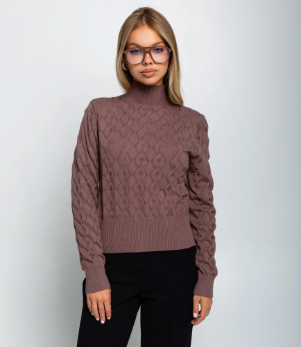 Свитер – это одежда, которая подчеркивает привлекательность и элегантность каждой представительницы прекрасного пола. Свитер прямого полуприталенного силуэта длиной до линии бёдер с плотной резинкой по низу, которая слегка подчёркивает талию; длинные слегка облегающие рукава с узкими манжетами той же рубчатой фактуры; высокая узкая горловина‑стойка средней высоты, плотно прилегающая к шее, выполнена в мелкую рубчатую вязку; основное полотно с рельефным ажурным рисунком ромбовидной геометрии, сформированным сочетанием плотных и открытых участков вязки с вертикальными нитевыми стежками между элементами, создающими лёгкую «сетчатую» глубину; широкая резинка по низу и плотные манжеты обеспечивают усадку и удержание тепла, контрастируя с ажурной текстурой. Для пошива использована ткань 70% акрил, 20% щерсть и 10% полиэстер, которая характеризуется отличным качеством. Даже после многократных стирок изделие не утратит первоначальной красоты. Вы сможете носить его с радостью. Обратите внимание на цвет. Он является насыщенным и полностью соответствует фотографии на сайте. Чтобы вы были уверены в размере, мы представили на странице таблицу. Воспользовавшись ею, вы сможете сами обмерить себя и удостовериться. Предложенная нами цена является приемлемой. Не откажите себе в удовольствии быть элегантной! Рост модели 168 см., 89-63-90. Вы можете заказать онлайн презентацию на интересующие Вас модели. Наши менеджеры свяжутся с Вами и проведут индивидуальную видеотрансляцию, помогут составить заказ и ответят на Ваши вопросы.