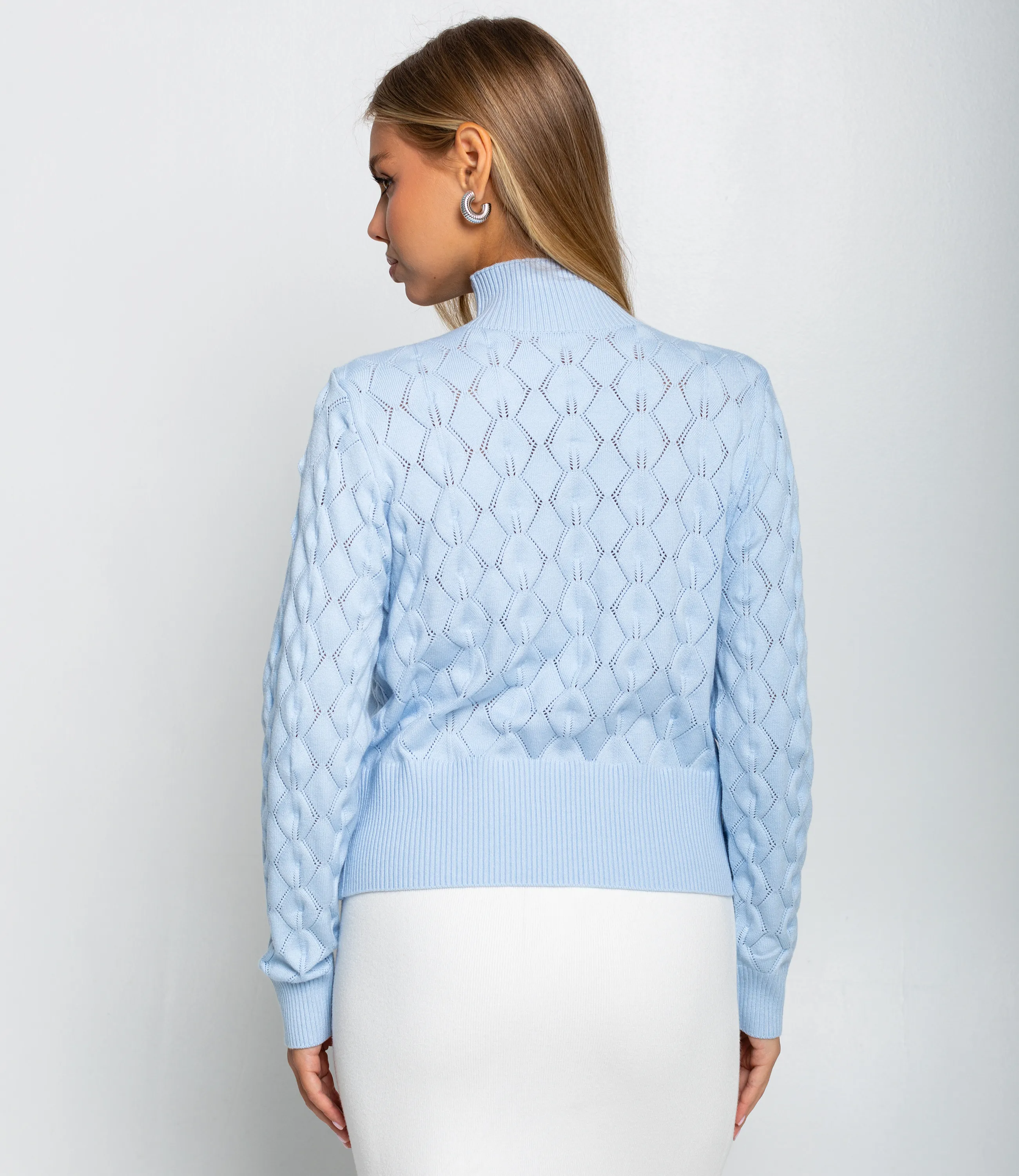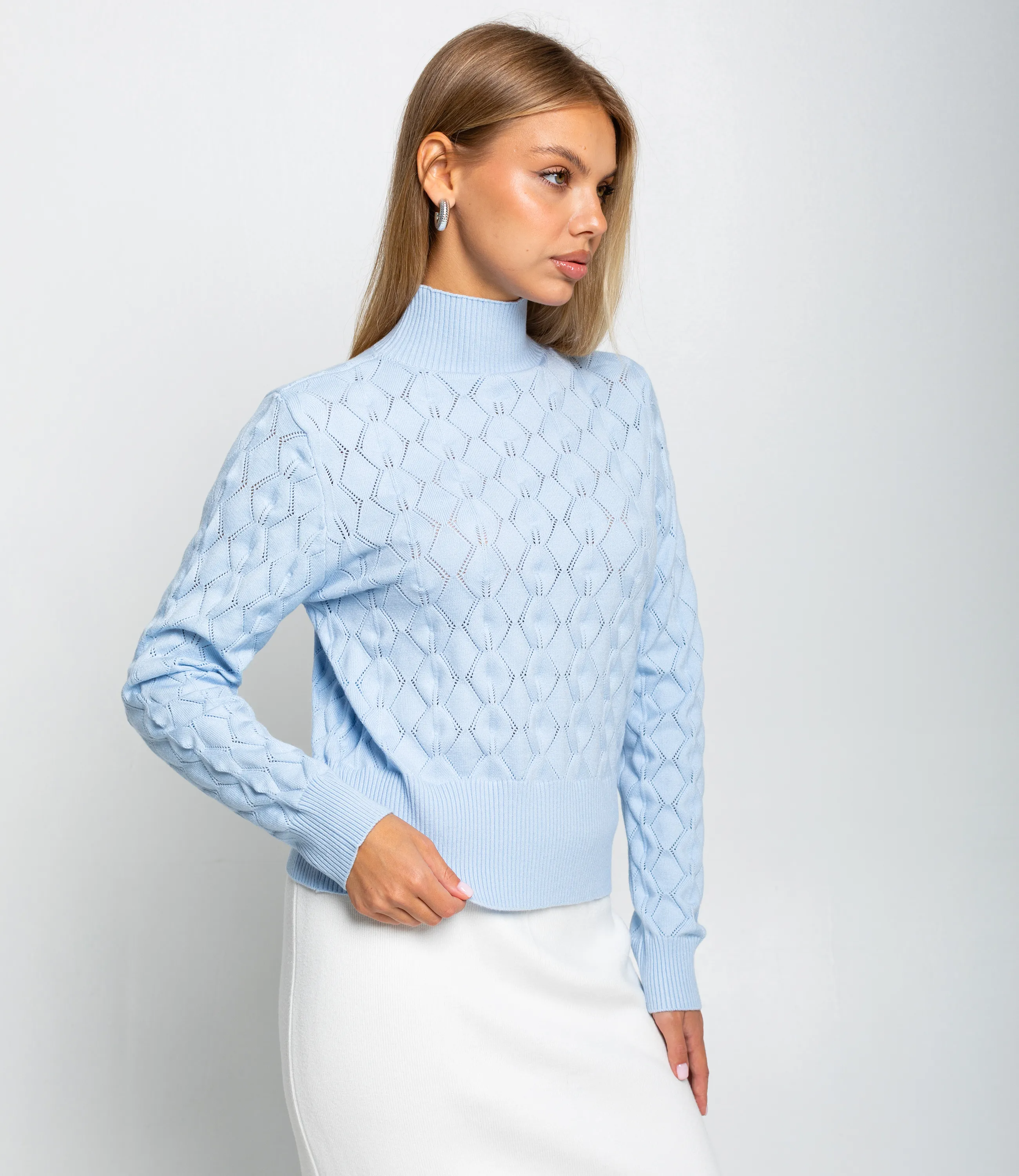 Свитер – это одежда, которая подчеркивает привлекательность и элегантность каждой представительницы прекрасного пола. Свитер прямого полуприталенного силуэта длиной до линии бёдер с плотной резинкой по низу, которая слегка подчёркивает талию; длинные слегка облегающие рукава с узкими манжетами той же рубчатой фактуры; высокая узкая горловина‑стойка средней высоты, плотно прилегающая к шее, выполнена в мелкую рубчатую вязку; основное полотно с рельефным ажурным рисунком ромбовидной геометрии, сформированным сочетанием плотных и открытых участков вязки с вертикальными нитевыми стежками между элементами, создающими лёгкую «сетчатую» глубину; широкая резинка по низу и плотные манжеты обеспечивают усадку и удержание тепла, контрастируя с ажурной текстурой. Для пошива использована ткань 70% акрил, 20% щерсть и 10% полиэстер, которая характеризуется отличным качеством. Даже после многократных стирок изделие не утратит первоначальной красоты. Вы сможете носить его с радостью. Обратите внимание на цвет. Он является насыщенным и полностью соответствует фотографии на сайте. Чтобы вы были уверены в размере, мы представили на странице таблицу. Воспользовавшись ею, вы сможете сами обмерить себя и удостовериться. Предложенная нами цена является приемлемой. Не откажите себе в удовольствии быть элегантной! Рост модели 168 см., 89-63-90. Вы можете заказать онлайн презентацию на интересующие Вас модели. Наши менеджеры свяжутся с Вами и проведут индивидуальную видеотрансляцию, помогут составить заказ и ответят на Ваши вопросы.