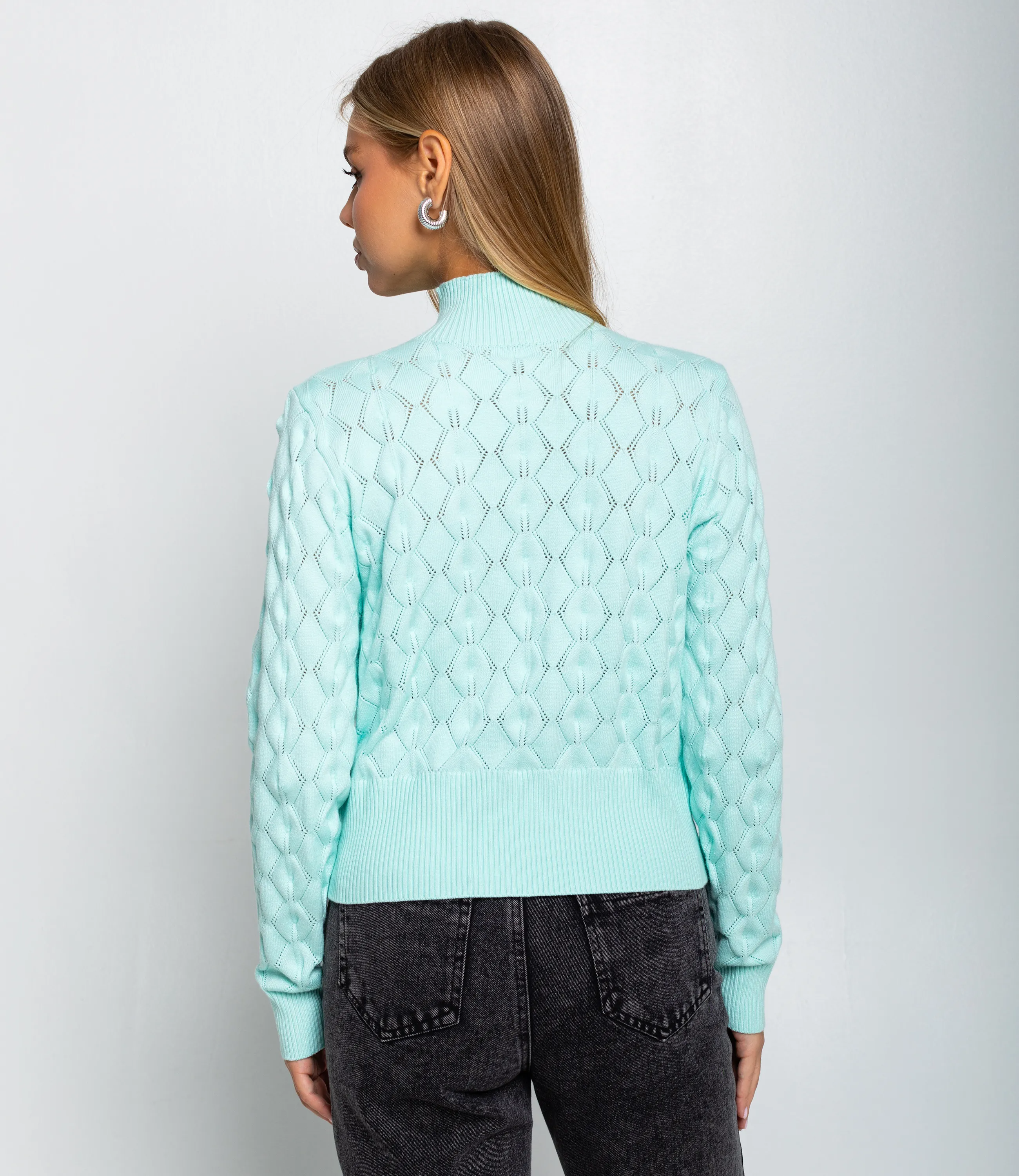 Свитер – это одежда, которая подчеркивает привлекательность и элегантность каждой представительницы прекрасного пола. Свитер прямого полуприталенного силуэта длиной до линии бёдер с плотной резинкой по низу, которая слегка подчёркивает талию; длинные слегка облегающие рукава с узкими манжетами той же рубчатой фактуры; высокая узкая горловина‑стойка средней высоты, плотно прилегающая к шее, выполнена в мелкую рубчатую вязку; основное полотно с рельефным ажурным рисунком ромбовидной геометрии, сформированным сочетанием плотных и открытых участков вязки с вертикальными нитевыми стежками между элементами, создающими лёгкую «сетчатую» глубину; широкая резинка по низу и плотные манжеты обеспечивают усадку и удержание тепла, контрастируя с ажурной текстурой. Для пошива использована ткань 70% акрил, 20% щерсть и 10% полиэстер, которая характеризуется отличным качеством. Даже после многократных стирок изделие не утратит первоначальной красоты. Вы сможете носить его с радостью. Обратите внимание на цвет. Он является насыщенным и полностью соответствует фотографии на сайте. Чтобы вы были уверены в размере, мы представили на странице таблицу. Воспользовавшись ею, вы сможете сами обмерить себя и удостовериться. Предложенная нами цена является приемлемой. Не откажите себе в удовольствии быть элегантной! Рост модели 168 см., 89-63-90. Вы можете заказать онлайн презентацию на интересующие Вас модели. Наши менеджеры свяжутся с Вами и проведут индивидуальную видеотрансляцию, помогут составить заказ и ответят на Ваши вопросы.