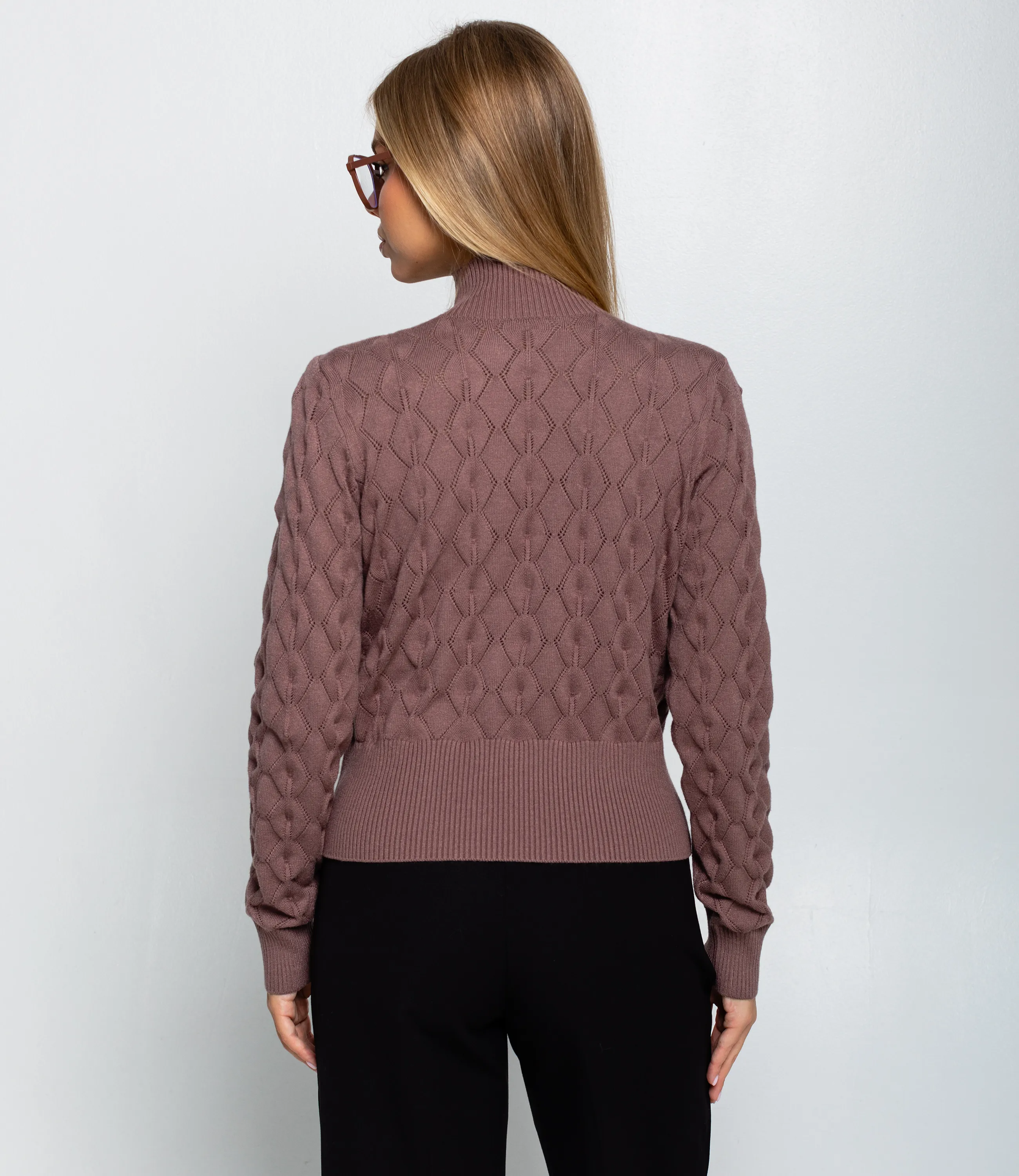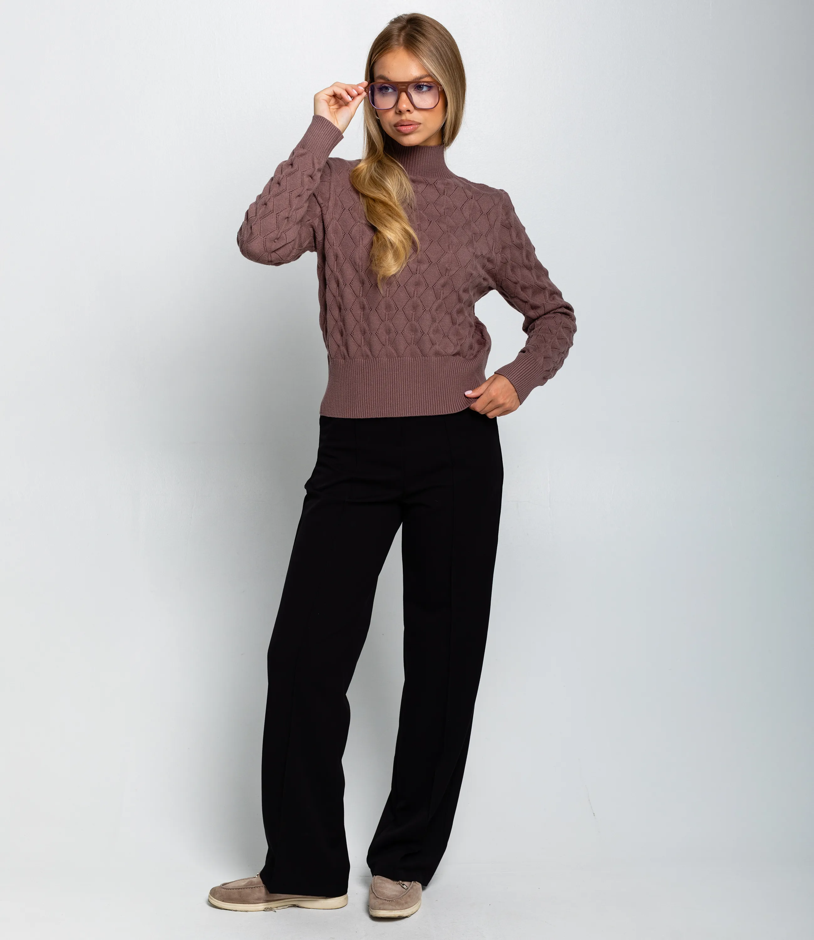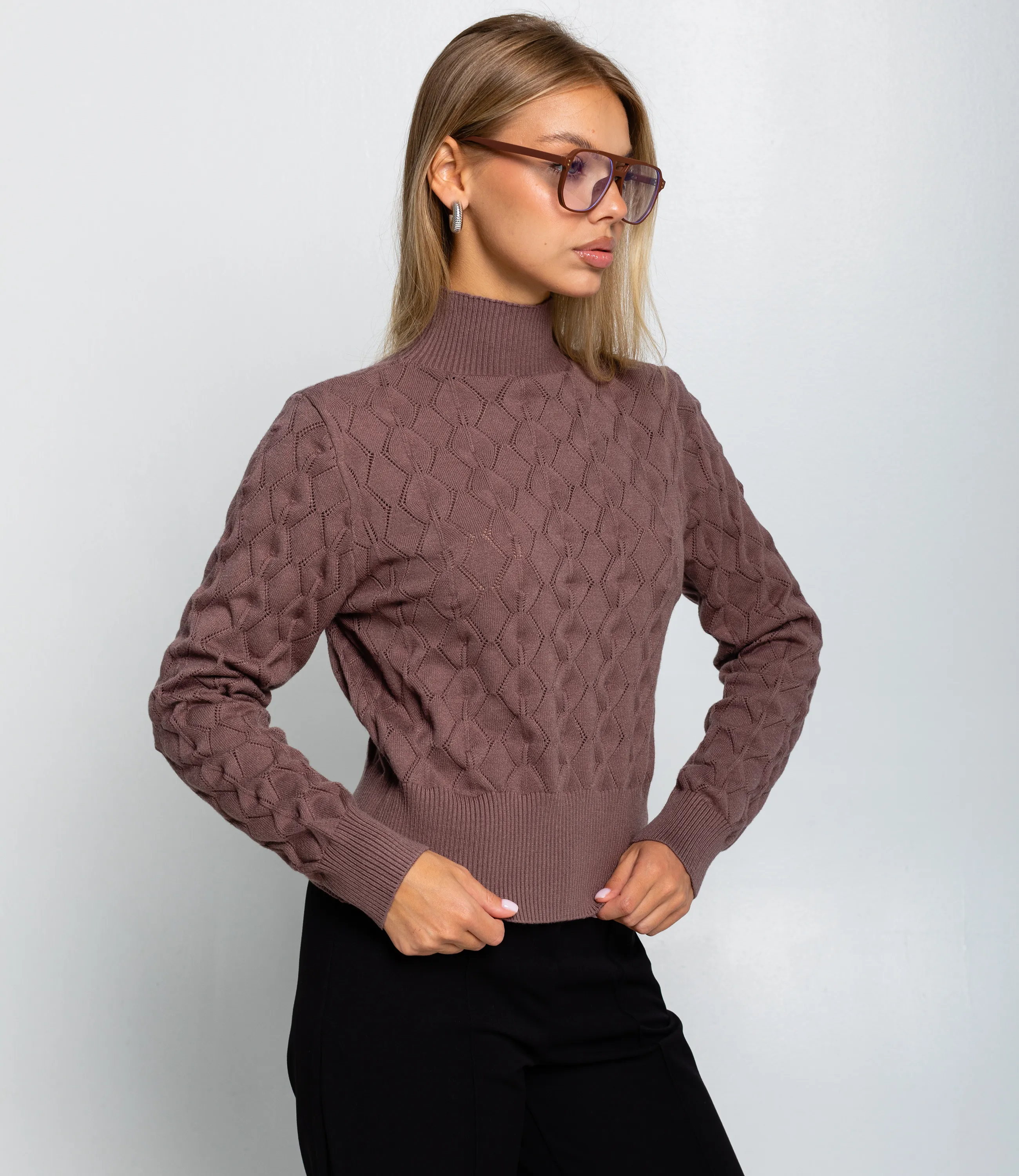 Свитер – это одежда, которая подчеркивает привлекательность и элегантность каждой представительницы прекрасного пола. Свитер прямого полуприталенного силуэта длиной до линии бёдер с плотной резинкой по низу, которая слегка подчёркивает талию; длинные слегка облегающие рукава с узкими манжетами той же рубчатой фактуры; высокая узкая горловина‑стойка средней высоты, плотно прилегающая к шее, выполнена в мелкую рубчатую вязку; основное полотно с рельефным ажурным рисунком ромбовидной геометрии, сформированным сочетанием плотных и открытых участков вязки с вертикальными нитевыми стежками между элементами, создающими лёгкую «сетчатую» глубину; широкая резинка по низу и плотные манжеты обеспечивают усадку и удержание тепла, контрастируя с ажурной текстурой. Для пошива использована ткань 70% акрил, 20% щерсть и 10% полиэстер, которая характеризуется отличным качеством. Даже после многократных стирок изделие не утратит первоначальной красоты. Вы сможете носить его с радостью. Обратите внимание на цвет. Он является насыщенным и полностью соответствует фотографии на сайте. Чтобы вы были уверены в размере, мы представили на странице таблицу. Воспользовавшись ею, вы сможете сами обмерить себя и удостовериться. Предложенная нами цена является приемлемой. Не откажите себе в удовольствии быть элегантной! Рост модели 168 см., 89-63-90. Вы можете заказать онлайн презентацию на интересующие Вас модели. Наши менеджеры свяжутся с Вами и проведут индивидуальную видеотрансляцию, помогут составить заказ и ответят на Ваши вопросы.