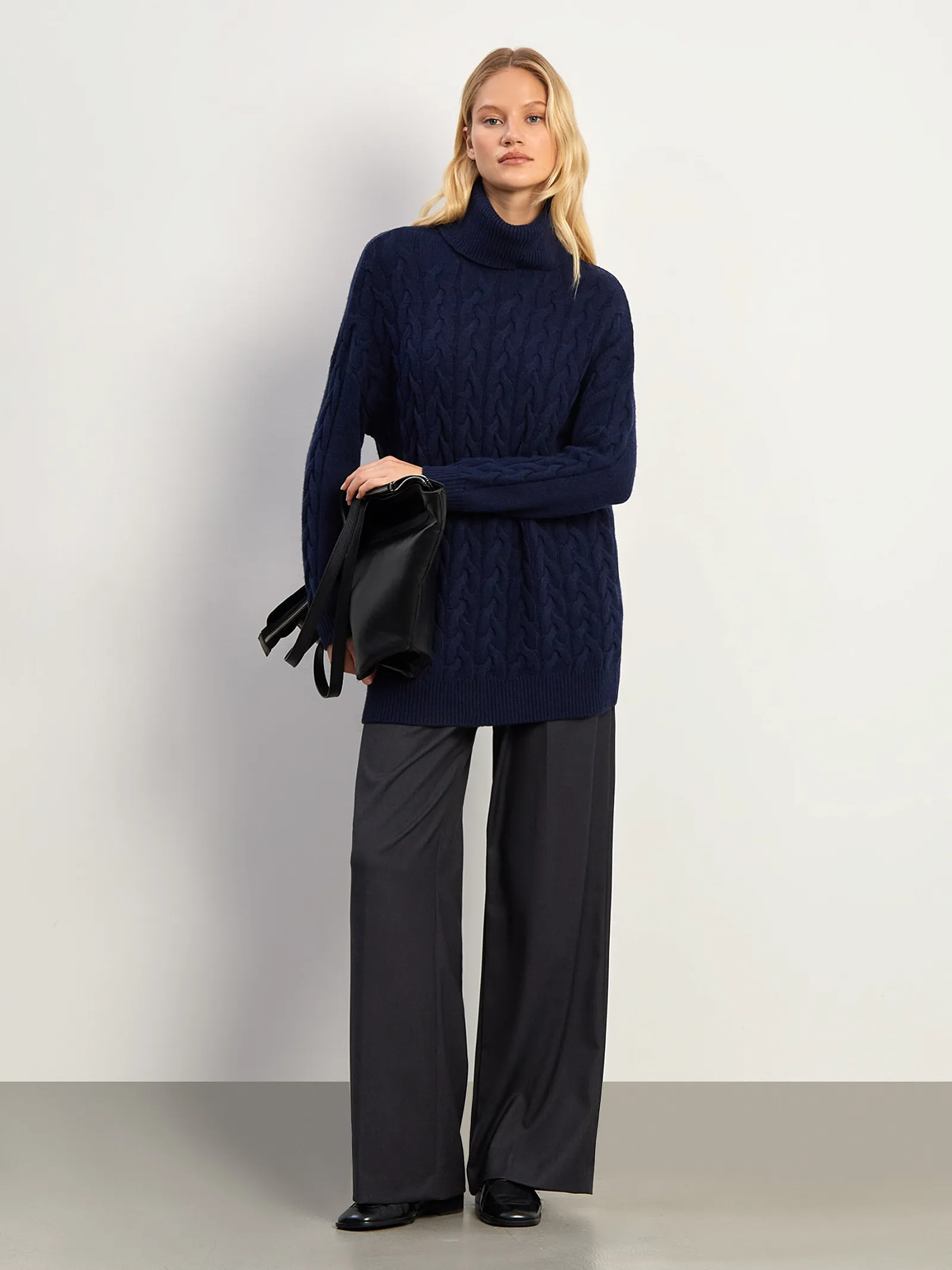 Модный свитер тёмно-синего цвета с косами согреет в холодную погоду. Выполнен из мягкого материала с высоким содержанием шерсти и добавлением кашемира. Модель прямого кроя со спущенным рукавом отличает объемная высокая горловина. Свитер отлично подходит для уютных образов на каждый день.