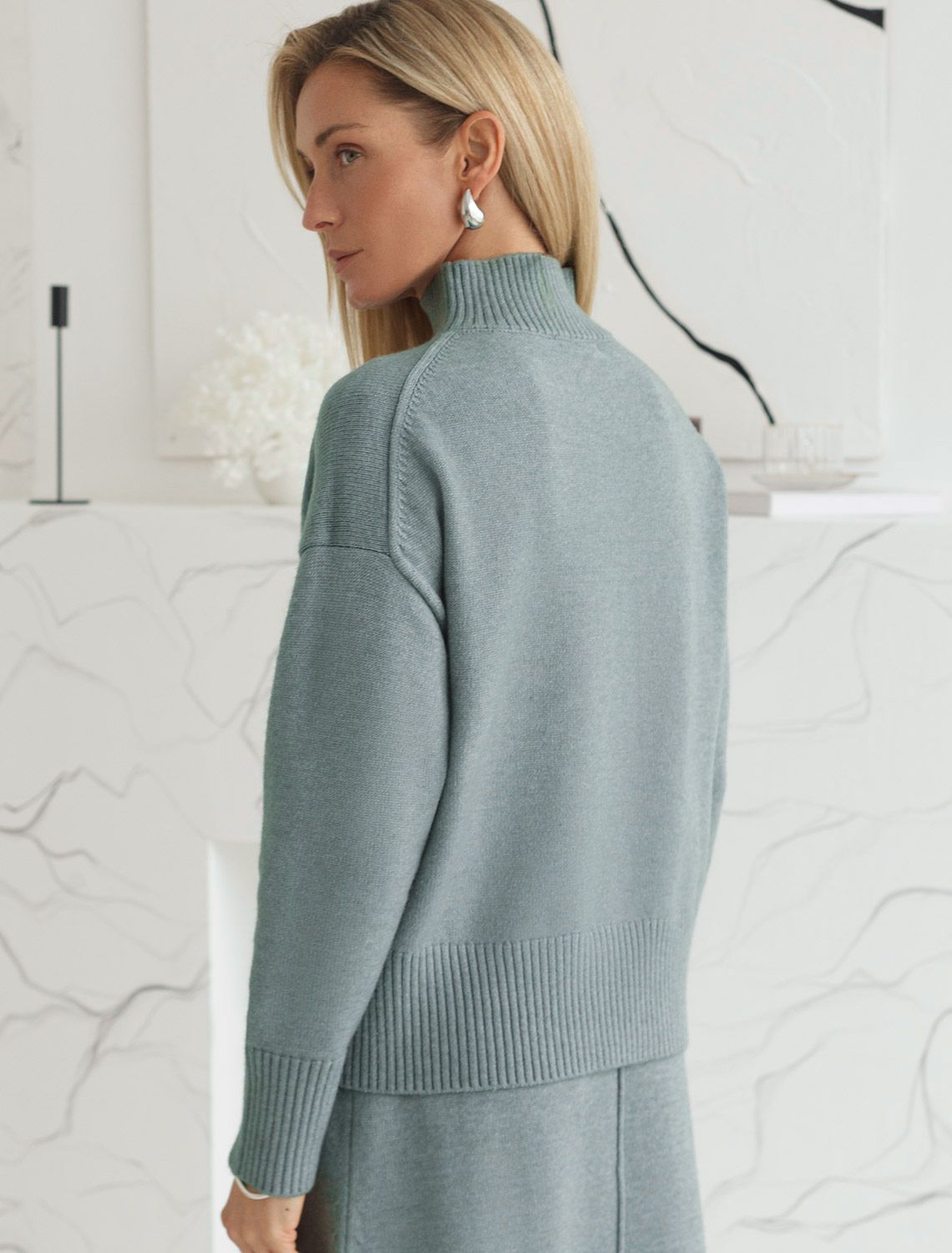 Свитер светло-оливкого цвета с высоким воротом связан из высококачественной пряжи с кашемиром — идеальное сочетание мягкости и практичности. Пряжа с кашемиром придаёт ему бархатистую нежность и тонкую структуру, каждое прикосновение с которой, напоминает о тепле и уюте в прохладные дни. Благодаря нежной текстуре материала этот вариант отлично подходит даже для чувствительной кожи, не вызывая раздражения и дискомфорта в течение дня. Спущенная иния плеча придает свитеру расслабленный вид, подчеркивая актуальный стильный образ обладательницы. Универсальный крой и длина подходит для разных типов фигуры, в том числе и на большие размеры, свободный фасон не стесняет движений, а оверсайз силуэт актуален в этом сезоне и выглядит современно. Длинный рукав с широкими манжетами защищает от холода, делая этот вариант особенно практичным в осенне-зимний период. Такой теплый свитер станет надежным спутником в межсезонье и зимние дни, сочетая практичность, комфорт и стиль. Сочетается в костюме с брюками D38.013, D38.012 и юбкой D36.016