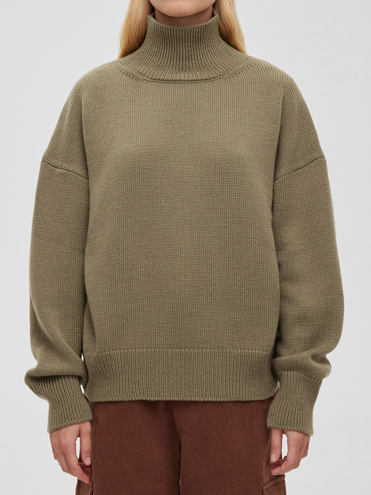 Свитер свободного кроя со спущенной линией плеча — наш неизменный хит продаж уже 9 лет. Дизайн с классическим воротником-стойкой и резинками на рукавах, а также по низу изделия делает свитер универсальной вещью для вашего базового гардероба.