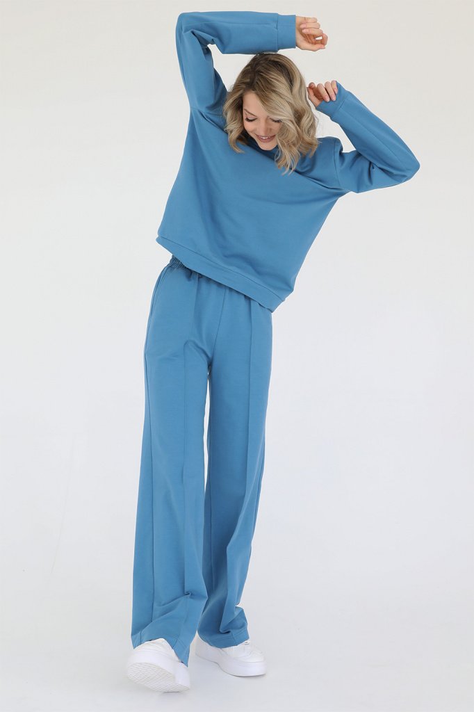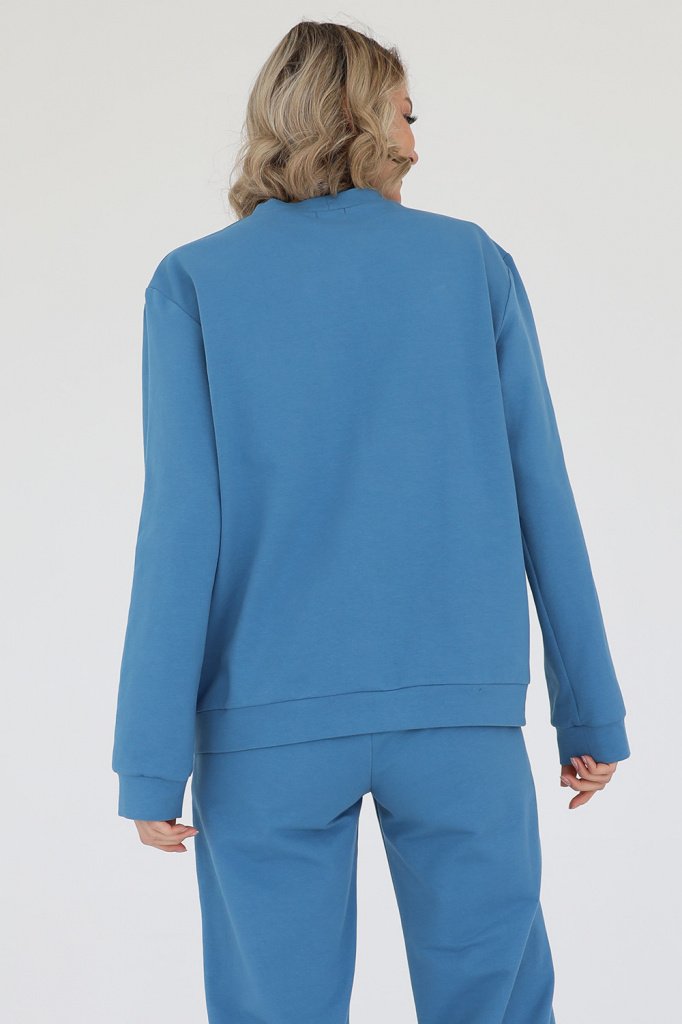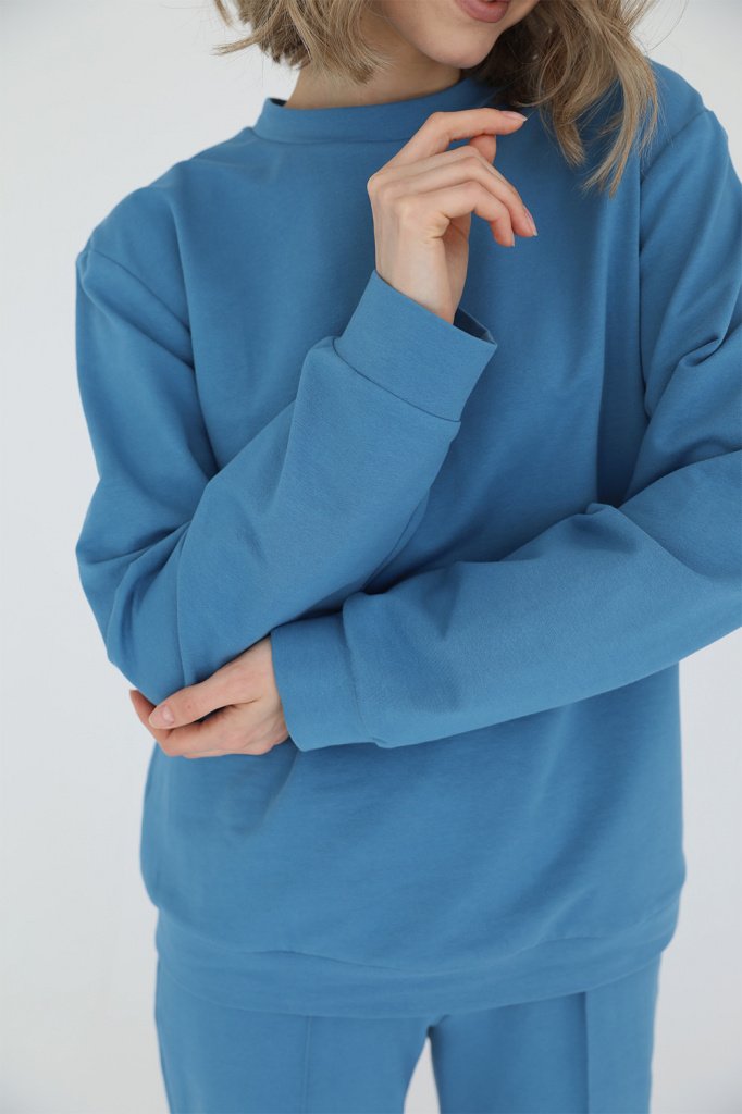 Свитшот свободного кроя со спущенной линией плеча, круглой горловиной, притачными манжетами и притачным поясом из основной ткани.