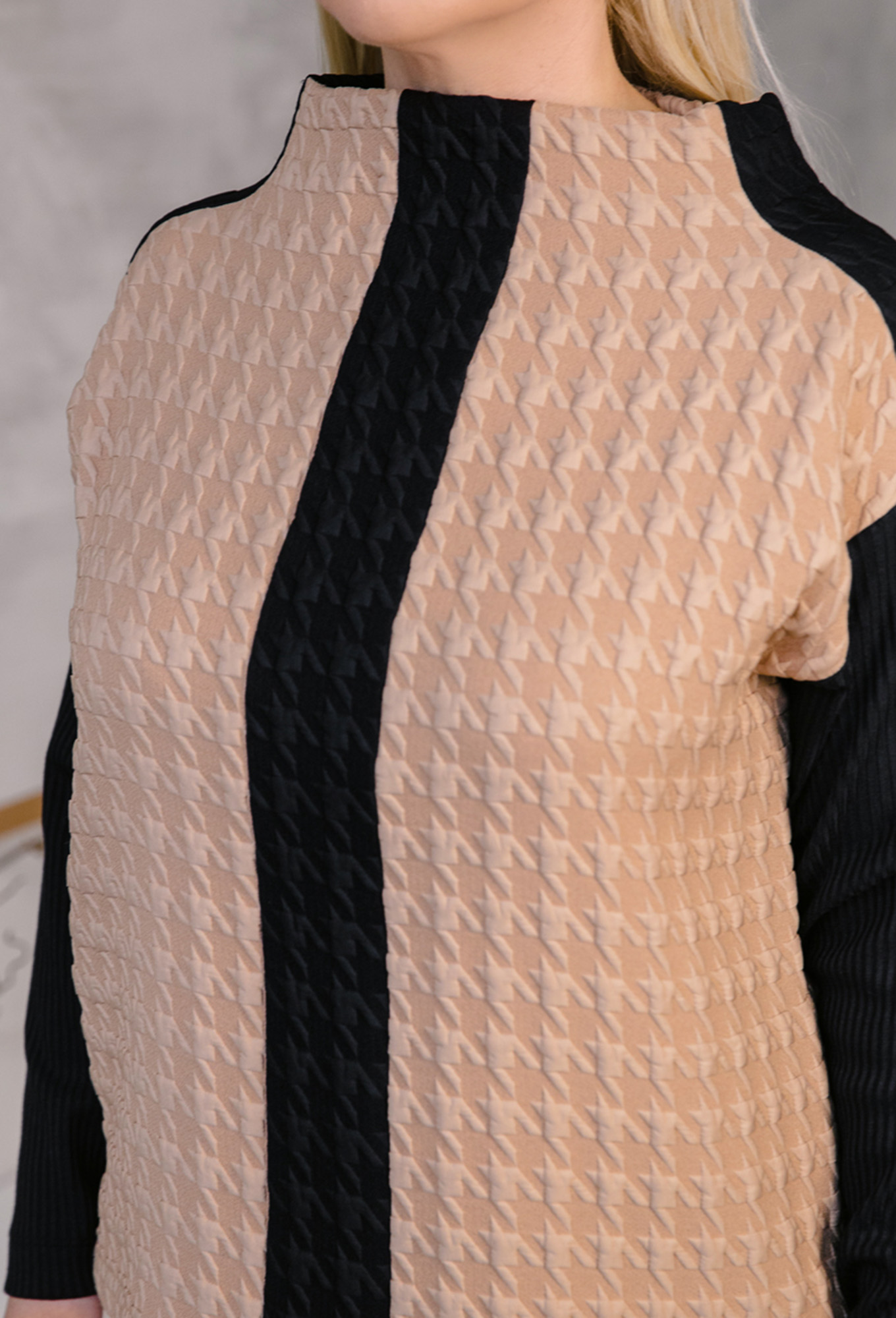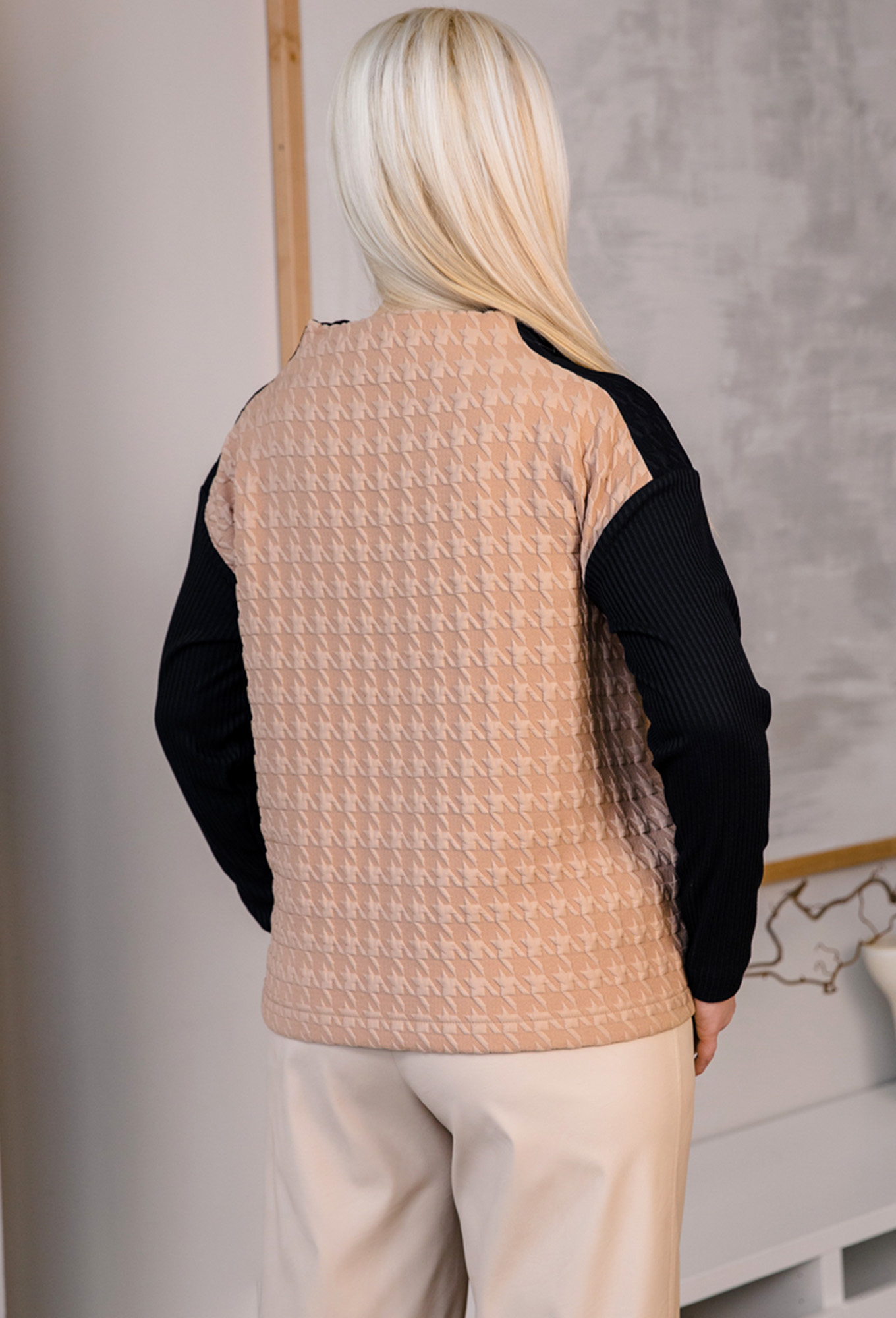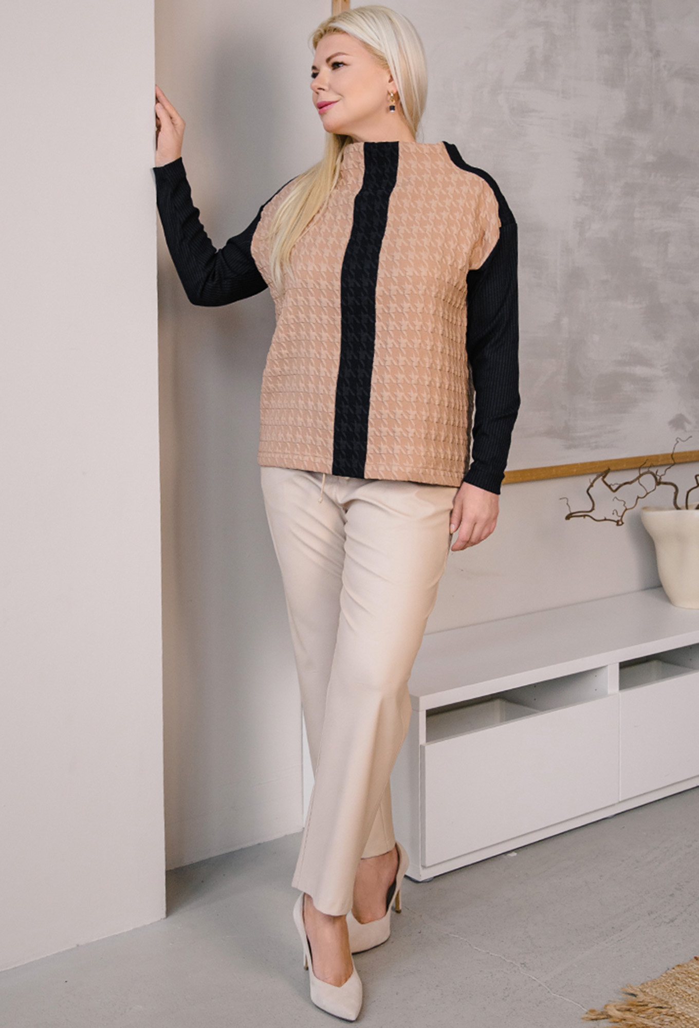 Модель: АСВ 2580 бежево-чёрный Ро..показатьст: 164 см (девушка на фото 170см) Сезон: Осень-Зима Тип ткани: Вискоза 55% , полиэстер 43% , эластан 2%Свитшот комбинированный зауженного силуэта с длинным рукавом. Горловина с цельнокроеной стойкой._x000D_
