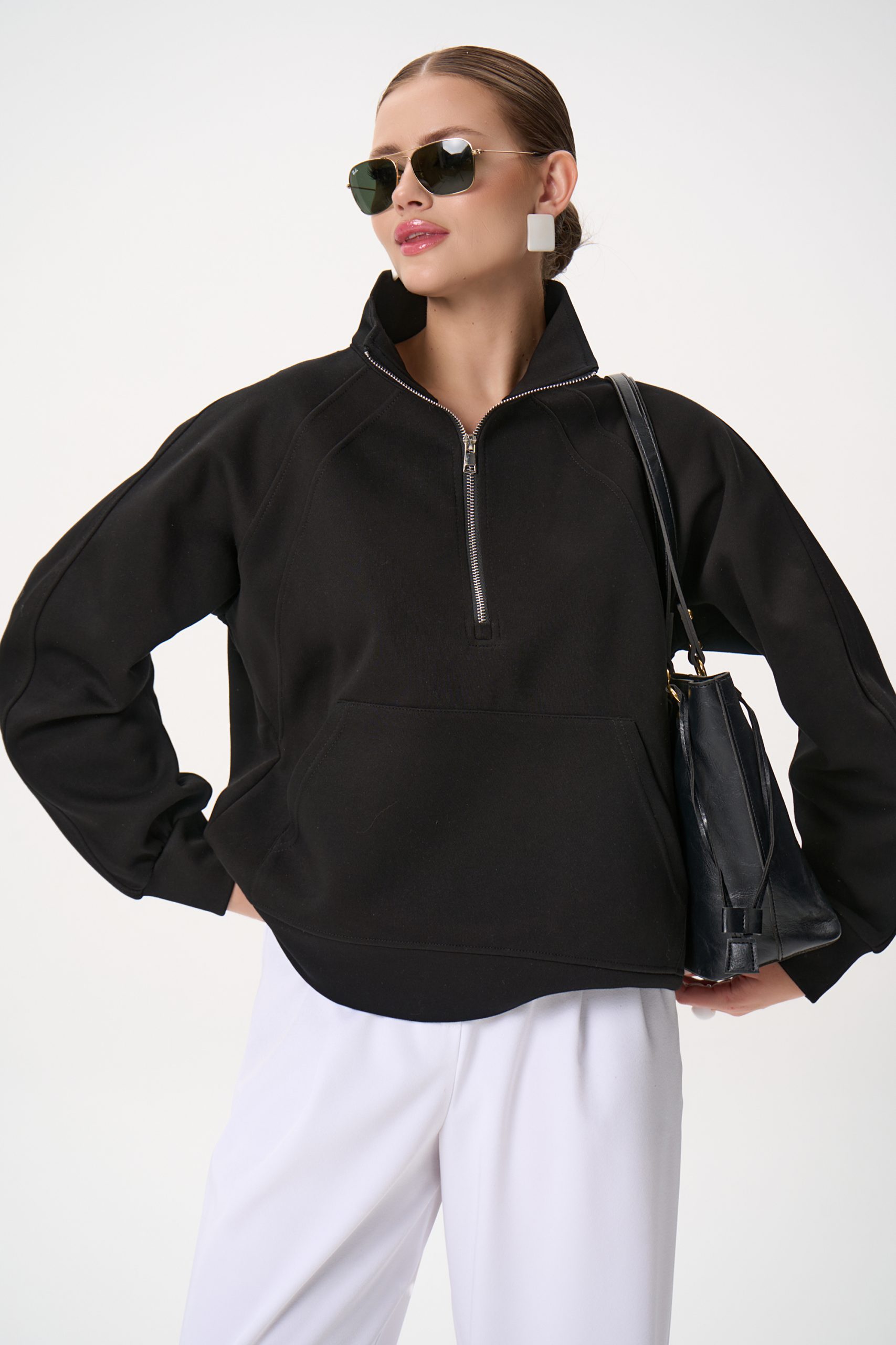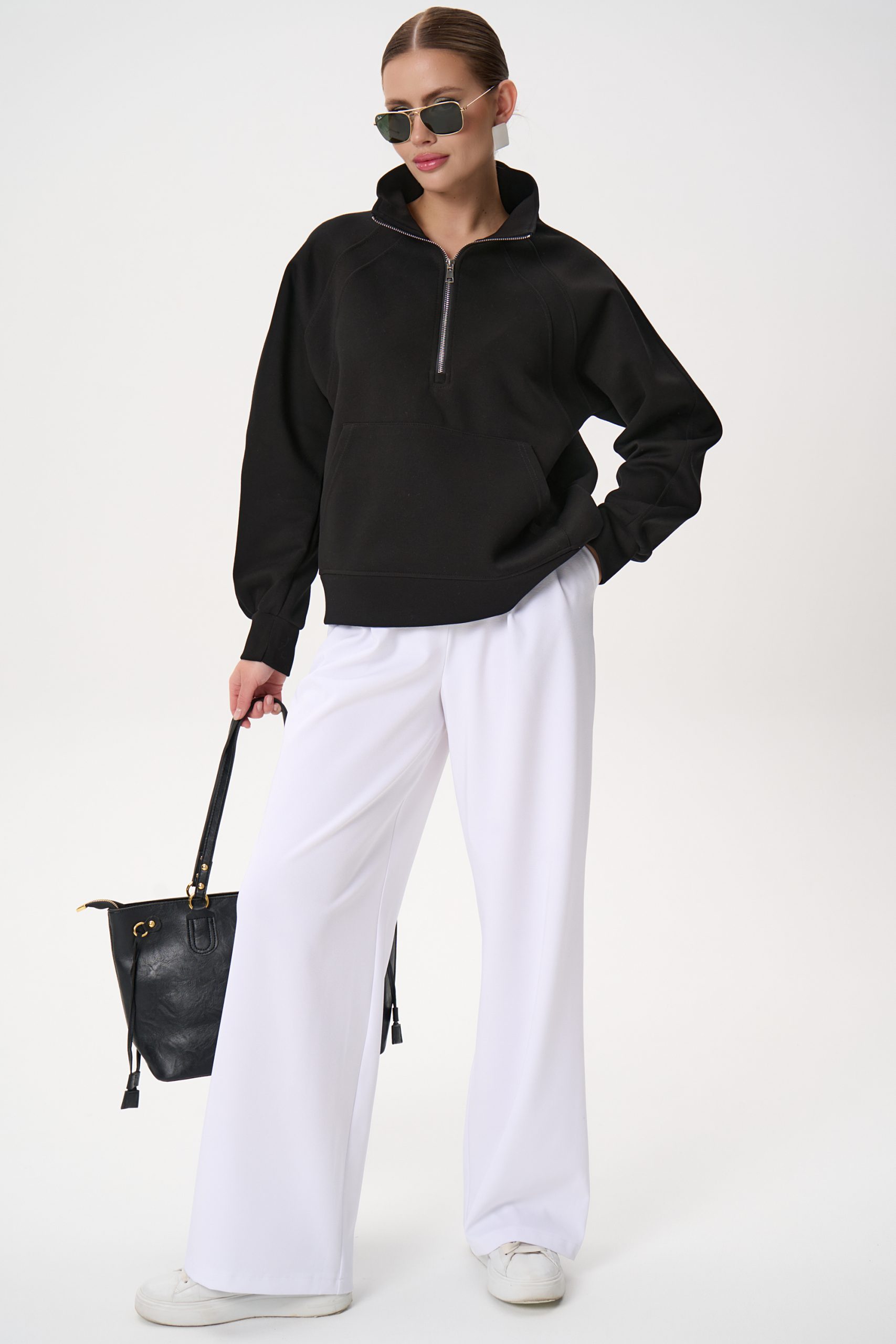 Свитшот Деми сочетает комфорт и элегантную простоту. Лёгкий оверсайз, чистый светло‑серый цвет и аккуратная деталь в виде стойки‑воротника с молнией создают образ, который легко вписывается как в повседневный гардероб, так и в более продуманные ансамбли.