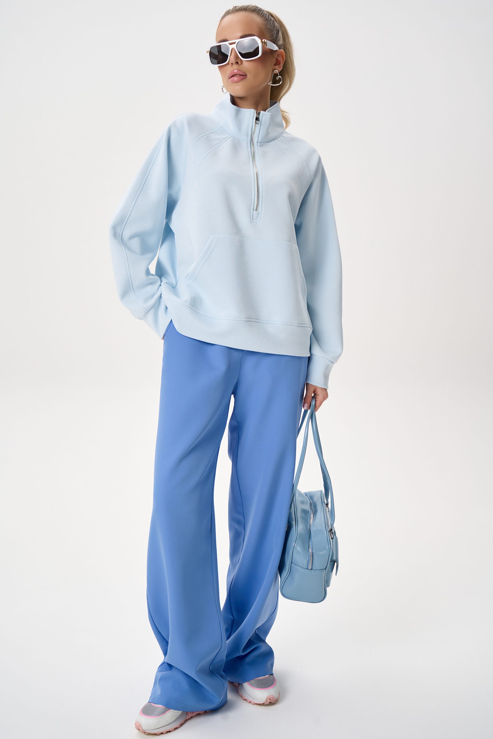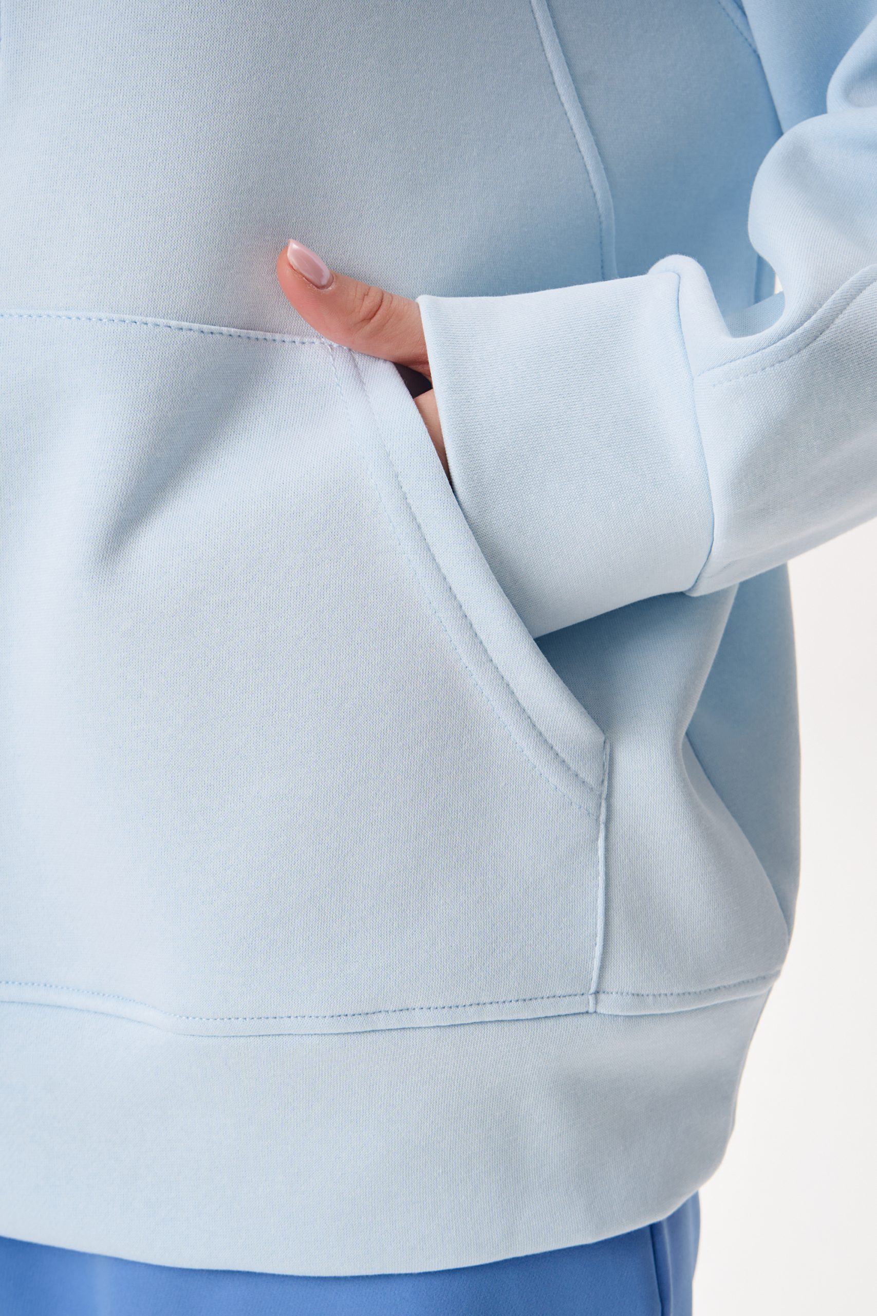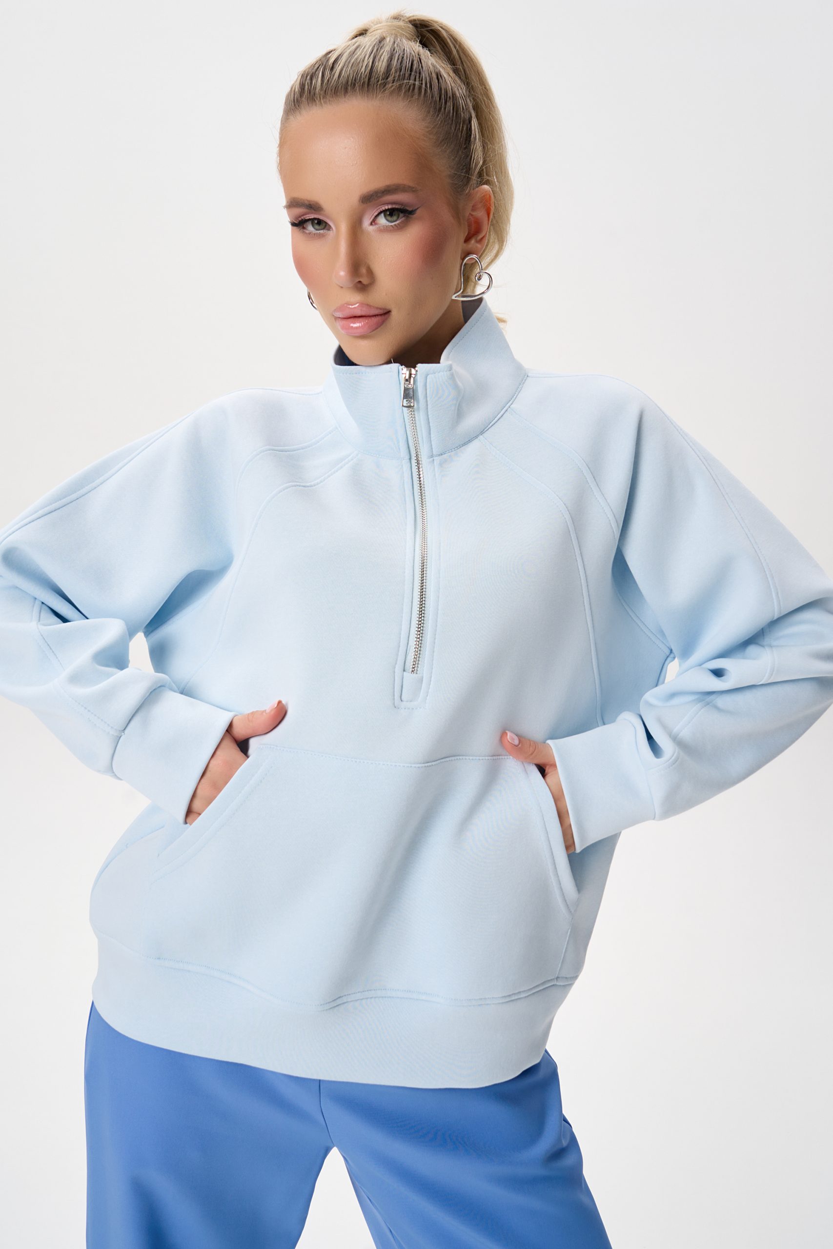 Свитшот Деми сочетает комфорт и элегантную простоту. Лёгкий оверсайз, чистый светло‑серый цвет и аккуратная деталь в виде стойки‑воротника с молнией создают образ, который легко вписывается как в повседневный гардероб, так и в более продуманные ансамбли.