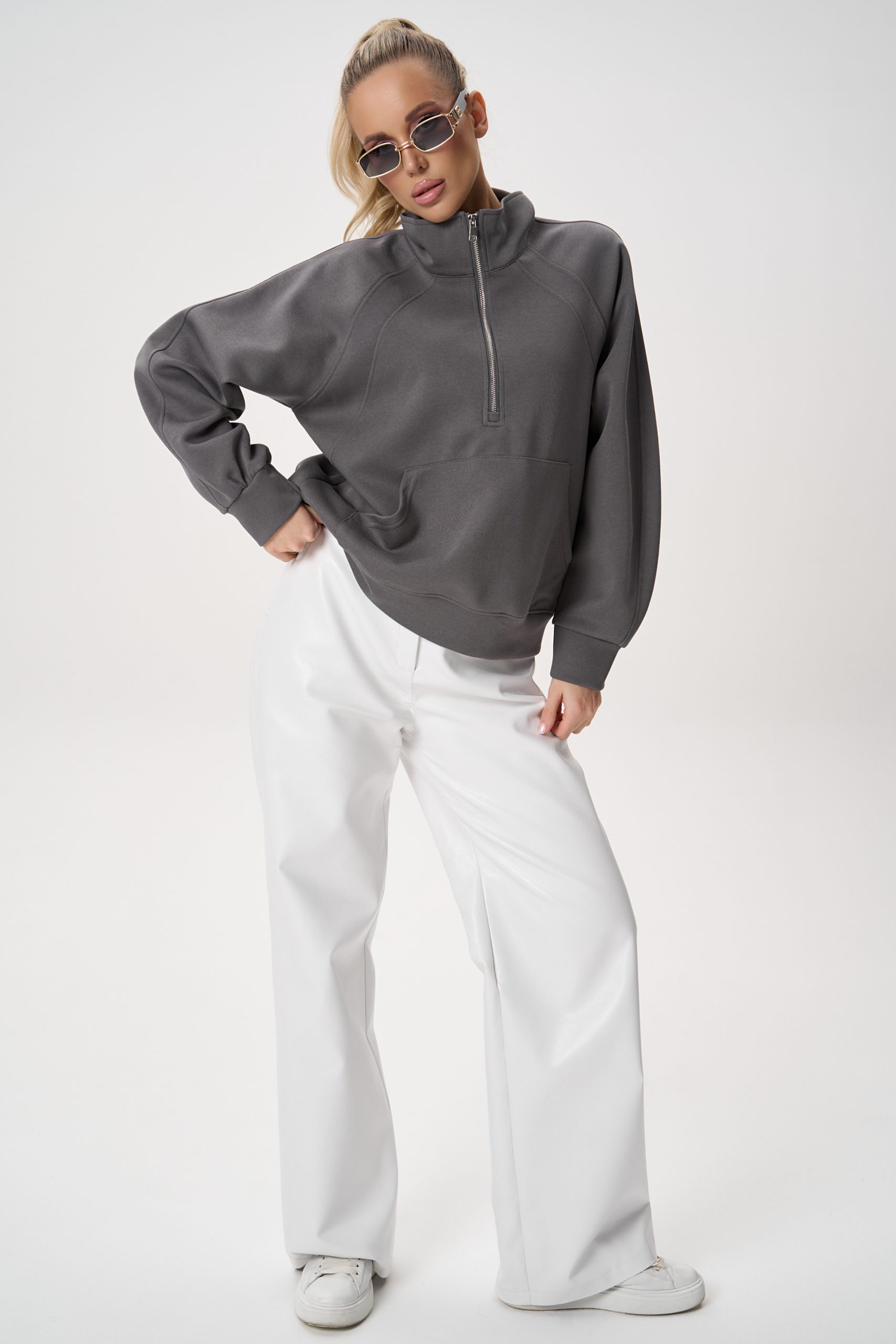 Свитшот Деми сочетает комфорт и элегантную простоту. Лёгкий оверсайз, чистый светло‑серый цвет и аккуратная деталь в виде стойки‑воротника с молнией создают образ, который легко вписывается как в повседневный гардероб, так и в более продуманные ансамбли.