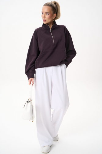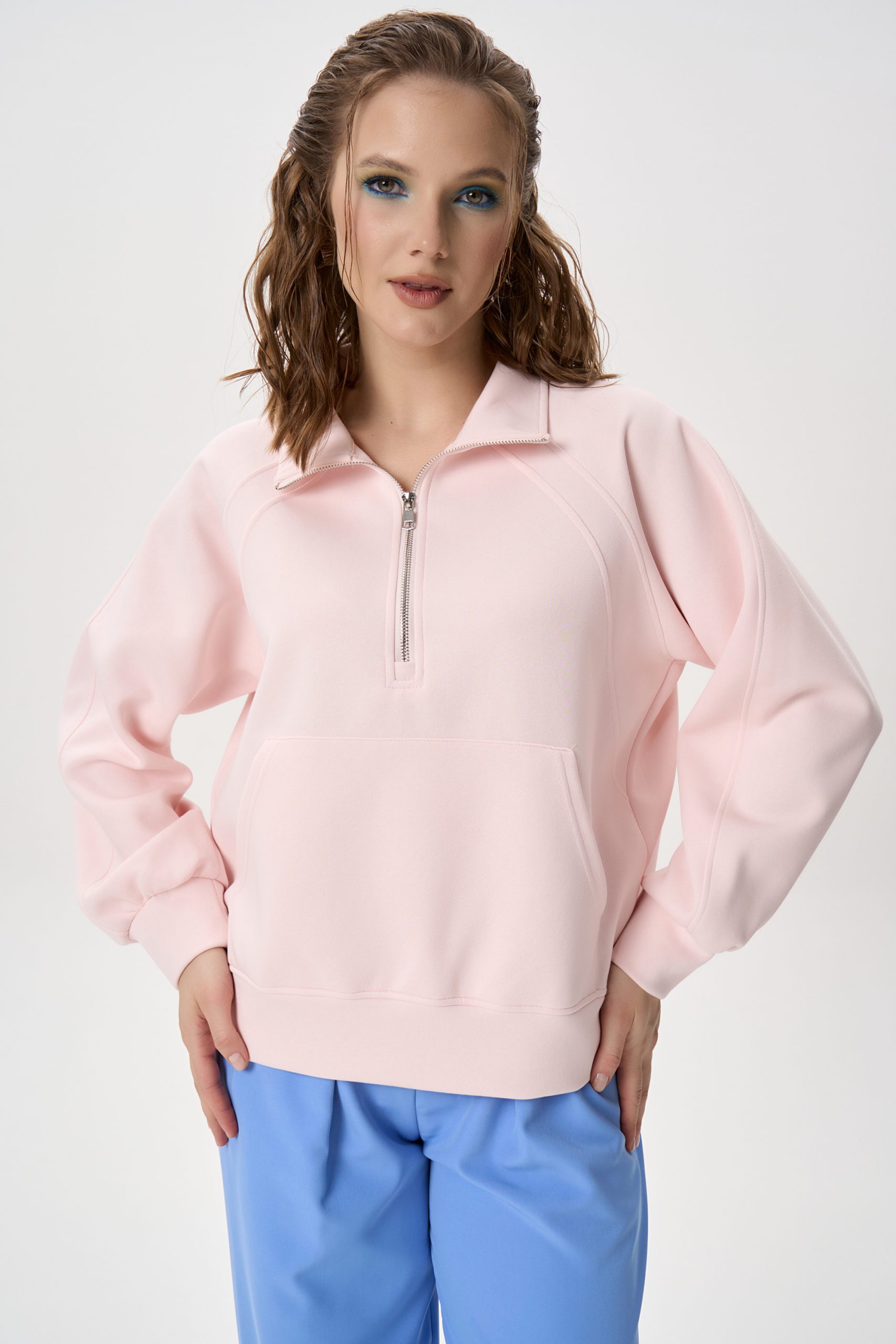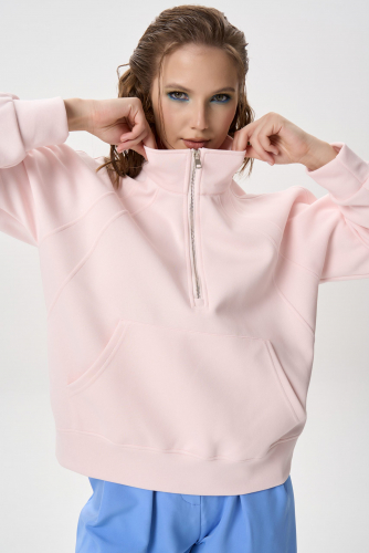 Свитшот Деми сочетает комфорт и элегантную простоту. Лёгкий оверсайз, чистый светло‑серый цвет и аккуратная деталь в виде стойки‑воротника с молнией создают образ, который легко вписывается как в повседневный гардероб, так и в более продуманные ансамбли.