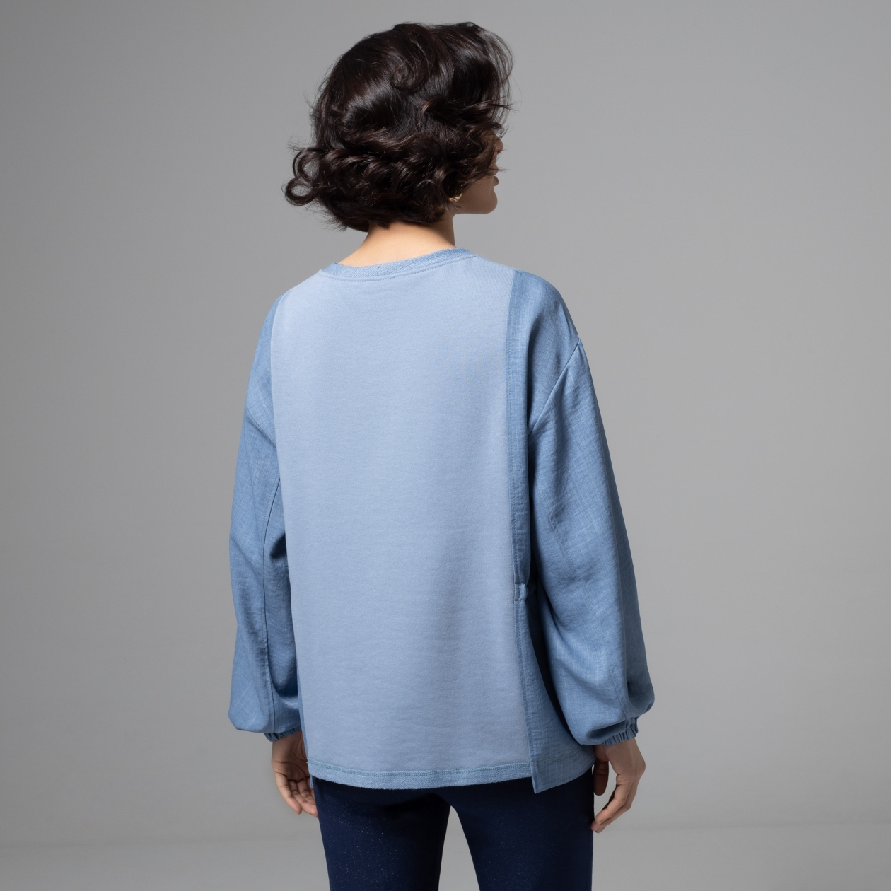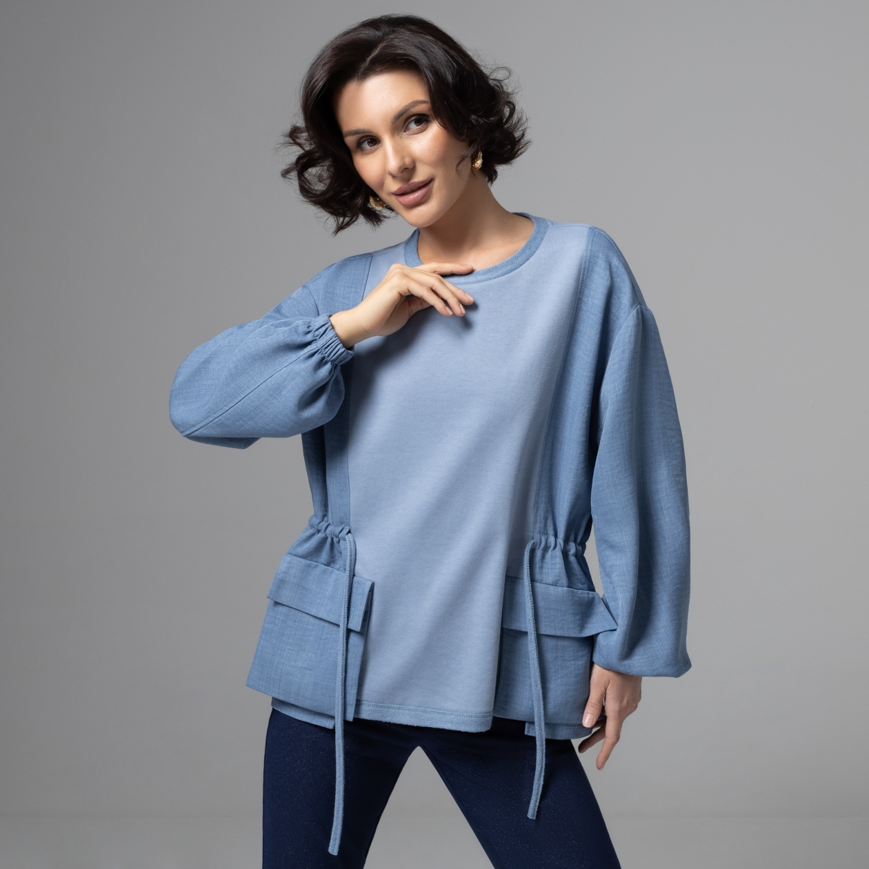Тот редкий случай, когда вещь определяет весь образ. Мягкий небесный оттенок сразу делает кожу свежей и отдохнувшей. Такой голубой обожают использовать в casual‑капсулах стилисты звезд, потому что он снимает усталость лица и считывается как выбор спокойной, собранной женщины. Объемный рукав и завязки по бокам создают лёгкий намек на подиумный крой, но без перегруза – в этом свитшоте вы можете и вести переговоры, и улетать на выходные гулять у моря. Изделие с объёмными карманами, талия регулируется.