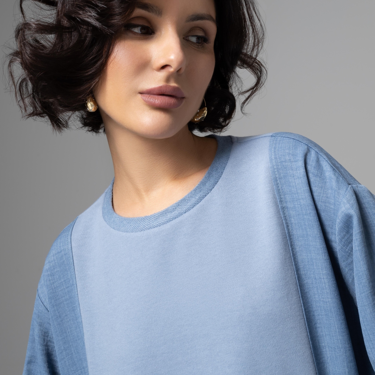 Тот редкий случай, когда вещь определяет весь образ. Мягкий небесный оттенок сразу делает кожу свежей и отдохнувшей. Такой голубой обожают использовать в casual‑капсулах стилисты звезд, потому что он снимает усталость лица и считывается как выбор спокойной, собранной женщины. Объемный рукав и завязки по бокам создают лёгкий намек на подиумный крой, но без перегруза – в этом свитшоте вы можете и вести переговоры, и улетать на выходные гулять у моря. Изделие с объёмными карманами, талия регулируется.