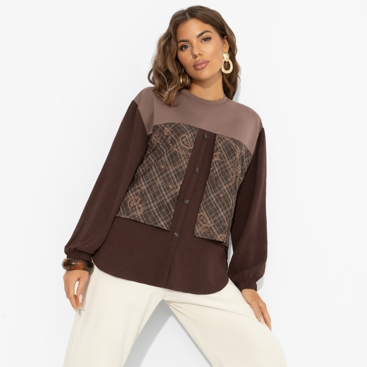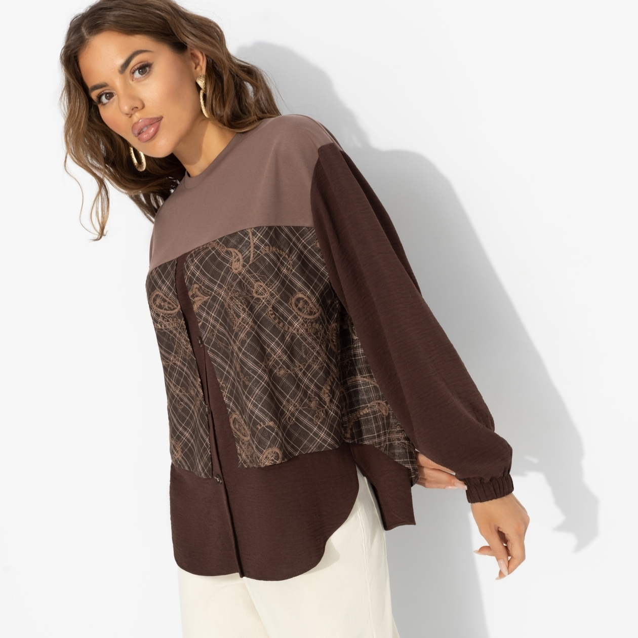Фьюжн ‒ в офисном гардеробе! Этот свитшот прогоняет скуку серых будней: сочетание фактур, оттенков и узоров намекает, что смелость в стиле ‒ вещь только для взрослых. Любите эксперименты? Вам сюда. Свитшот из трикотажа в комбинации нескольких видов ткани. Гамма шоколадных оттенков, свободный крой.