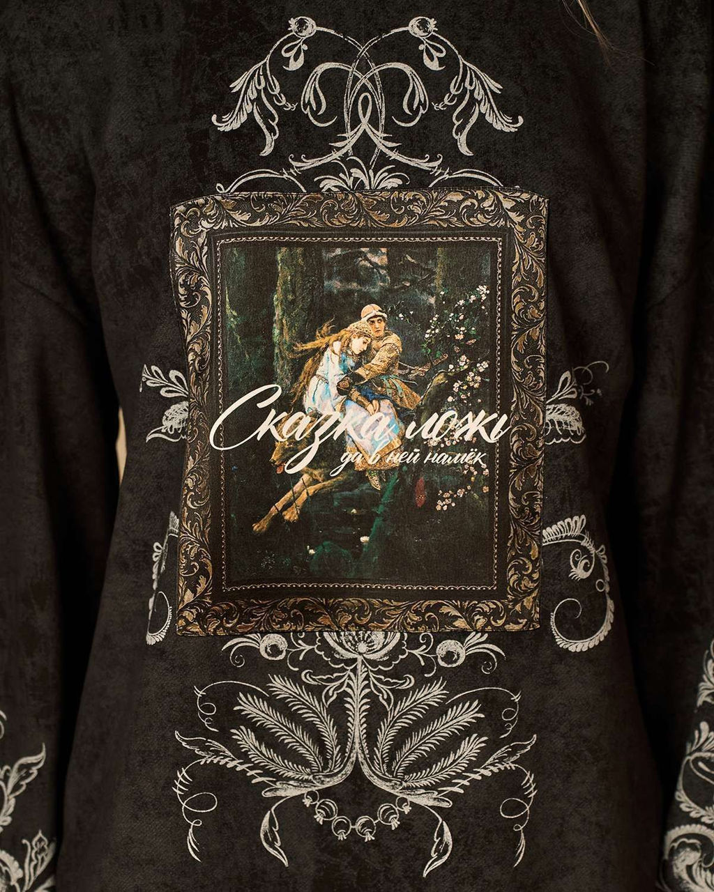 Свитшот в стиле русской сказки сочетает в себе комфорт и эстетику традиционного русского стиля. Свитшот выполнен из футера трёхнитки с эффектом «варёнка». Передняя часть украшена шёлковым рисунком, пришитым поверх изделия, на котором изображены герои русской народной сказки — Иван Царевич верхом на Сером Волке, символизирующие верность и дружбу. Надпись "Сказка — ложь" добавляет изделию особый шарм и глубокий смысл.
