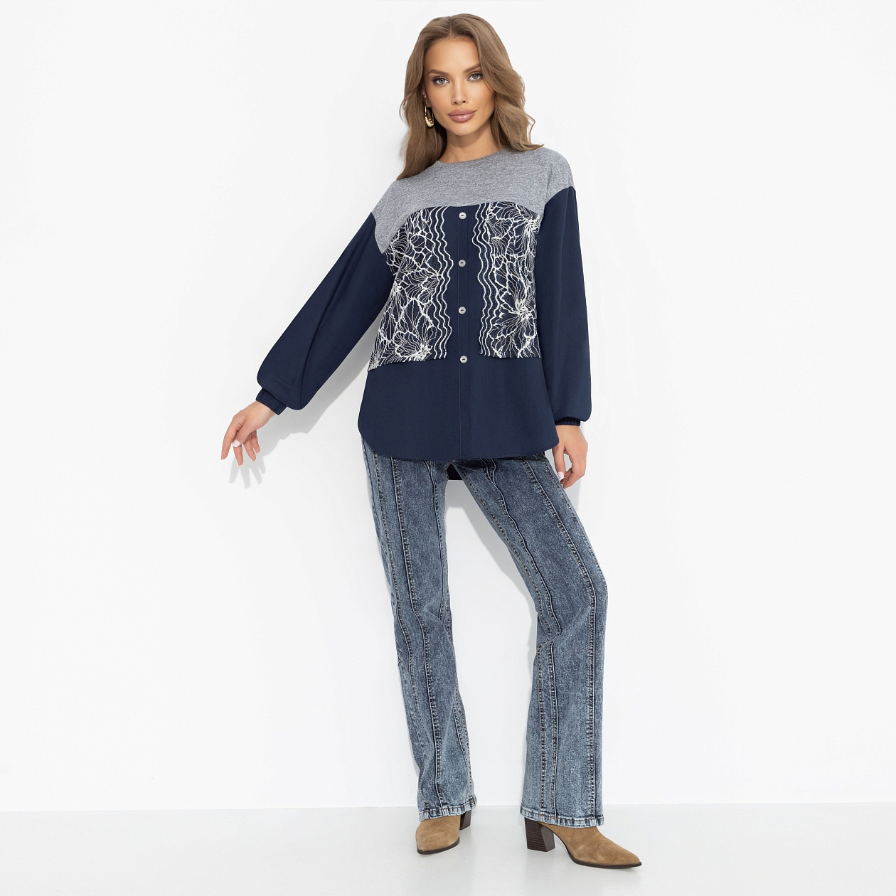 Паутинка кружевных линий будто магически притягивает взгляды к твоему образу. В этом свитшоте ЧАРУТТИ орнаменты завораживают и говорят: у меня есть секрет, но ты не сможешь его разгадать. Свитшот из трикотажа «меланж» декорирован кружевом и поплином. Модель для эффектных будней и особых случаев, когда хочется быть загадочной и чуть-чуть волшебной!