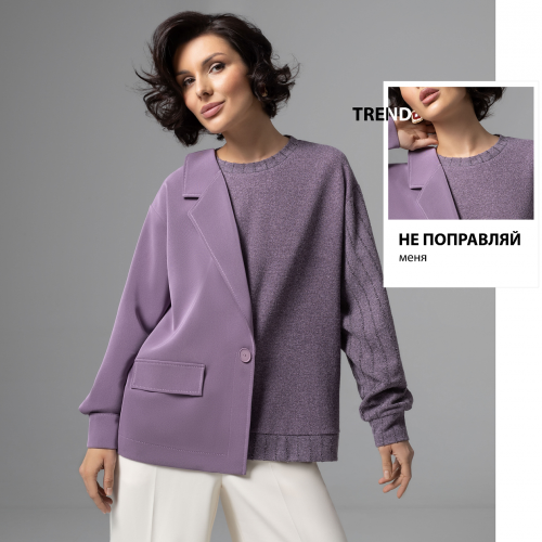 Этот свитшот – вещь для тех, кто между комфортом и авангардом выбирает сразу всё. Половина – мягкий букле‑свитшот, другая – графичный жакет в дымчато‑лавандовом оттенке: будто два любимых образа встретились в одной капсульной вещи. Продвинутое чувство стиля и неочевидный крой сразу выдают в вас человека, который задает настроение, а не подстраивается под дресс‑код. Фактурный трикотаж букле дает объем и тактильный комфорт, хорошо держит форму и почти не мнется. Внутренняя обработка выполнена по стандартам премиум‑капсулы.