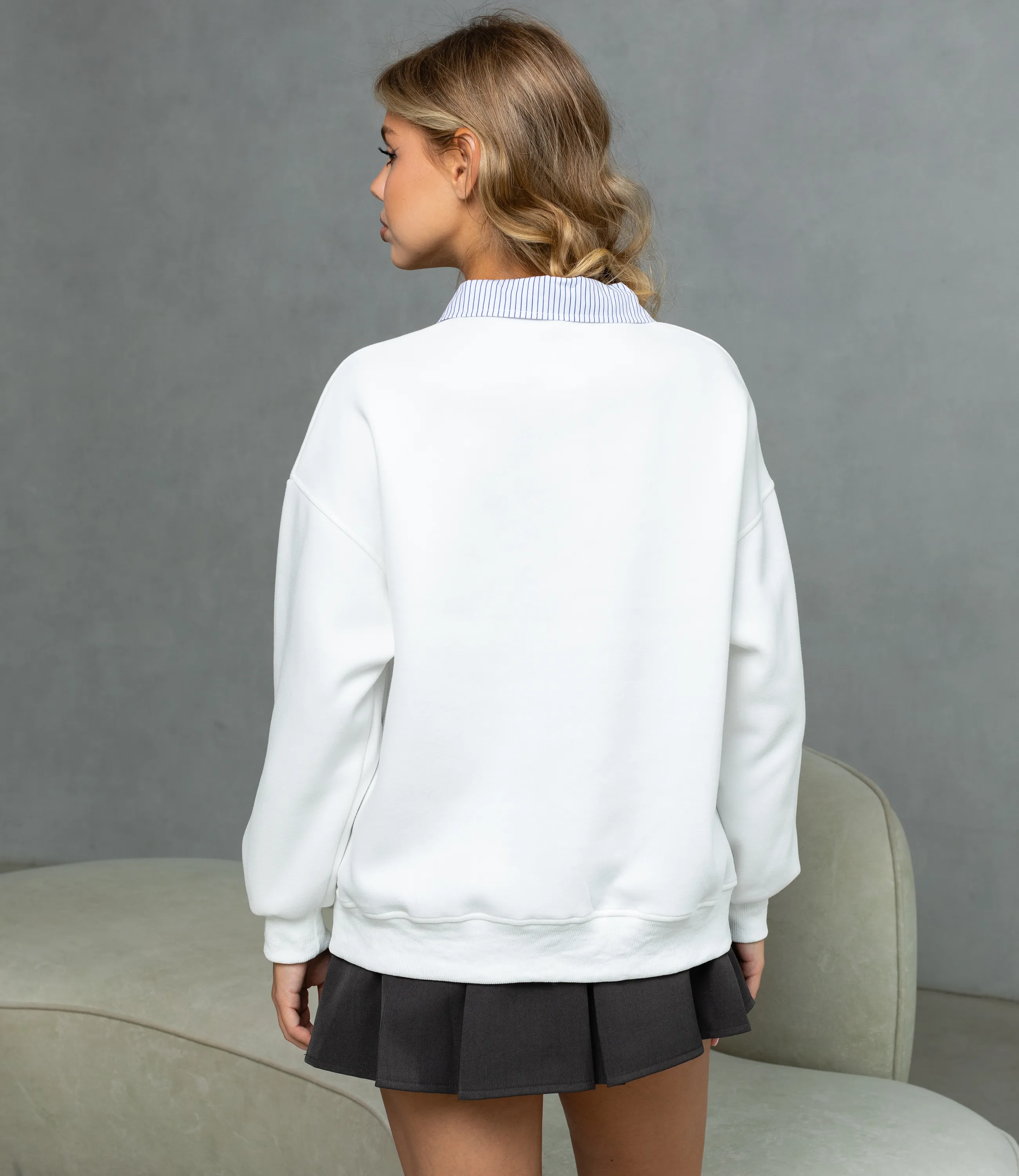Свитшот — это не просто одежда, а стильный элемент гардероба, который подчеркивает уникальность и индивидуальность каждой женщины. Эта модель, выполненная из высококачественного материала 65% хлопка и 35% полиэстера, сочетает в себе комфорт, практичность и модные тенденции. Свитшот свободного оверсайз‑кроя до линии бёдер. Модель с отложным воротником‑рубашкой в тонкую синюю полоску на застёжке‑пуговицах придаёт образу слоистость и визуальный интерес, перед украшен крупным чёрным принтом в стиле колледж‑лого с декоративными буквами. На странице представлены размеры, что поможет вашим клиентам выбрать идеальный вариант. Мы уверены, что установленная цена является доступной, что делает этот свитшот отличным дополнением к вашему ассортименту. Не упустите возможность предложить своим покупателям модную и комфортную модель, которая отлично дополнит любой гардероб! Подарите им шанс оставаться стильными и чувствовать себя уверенно с этим привлекательным свитшотом, который подчеркнет их индивидуальность и модные предпочтения!