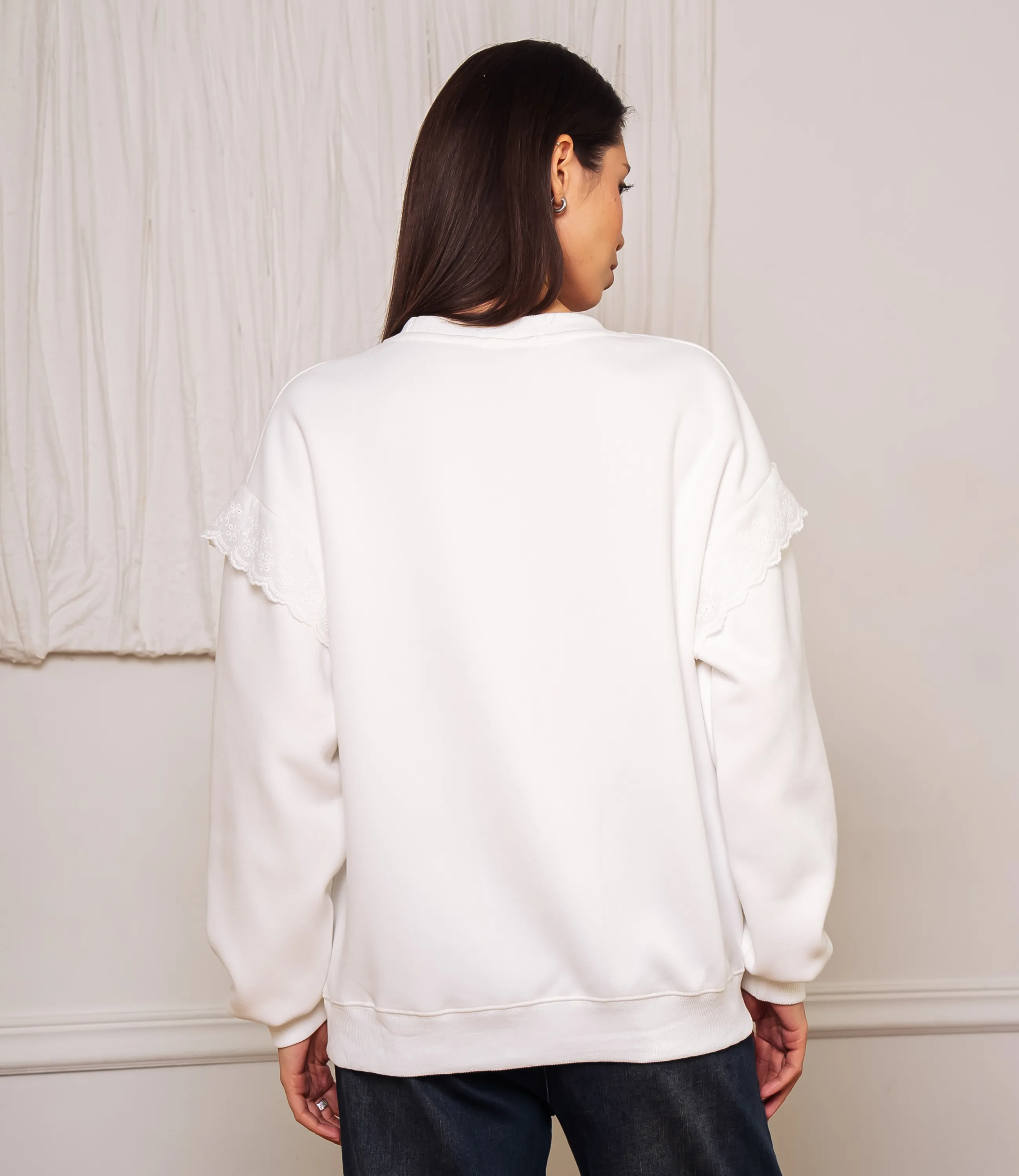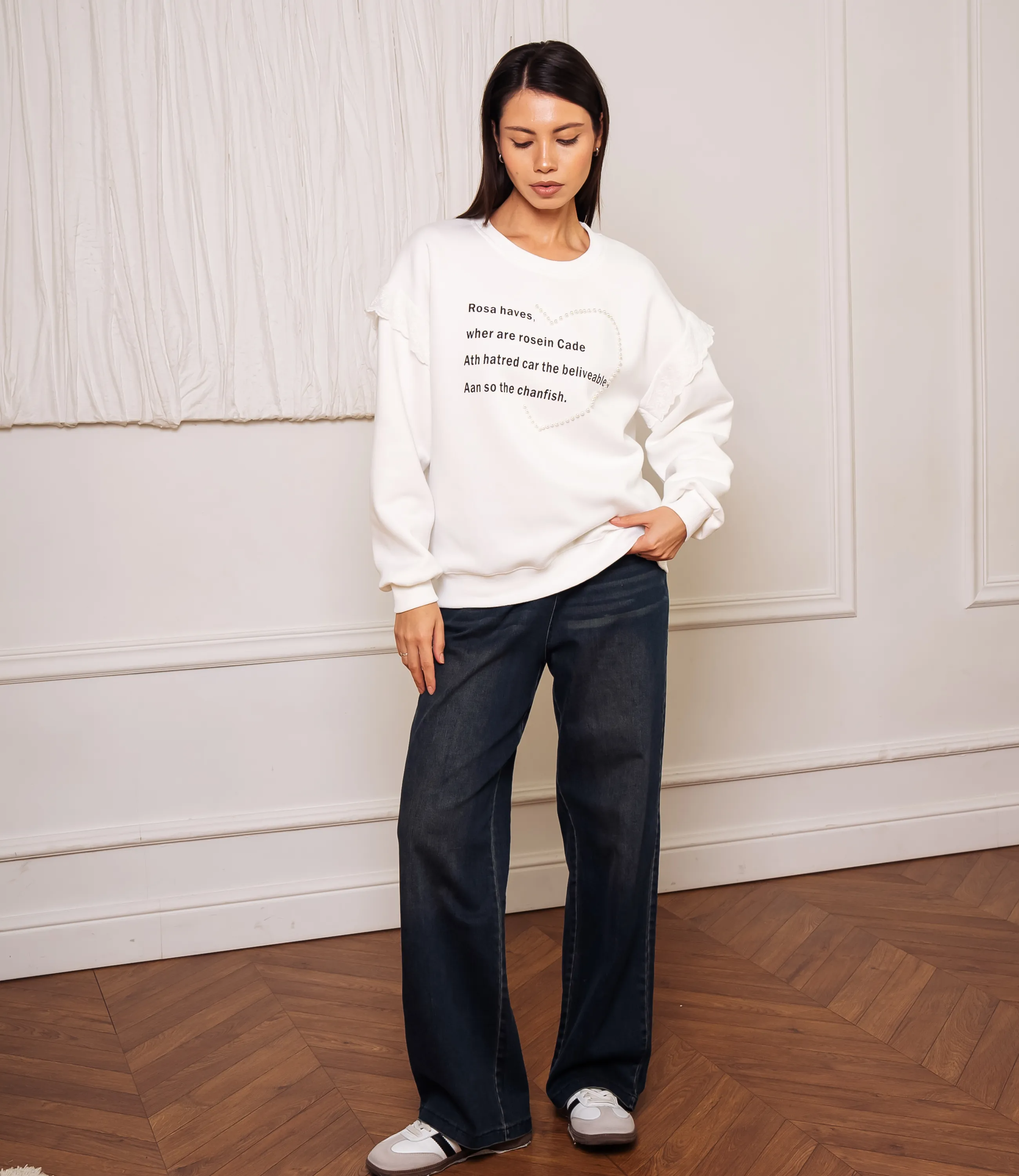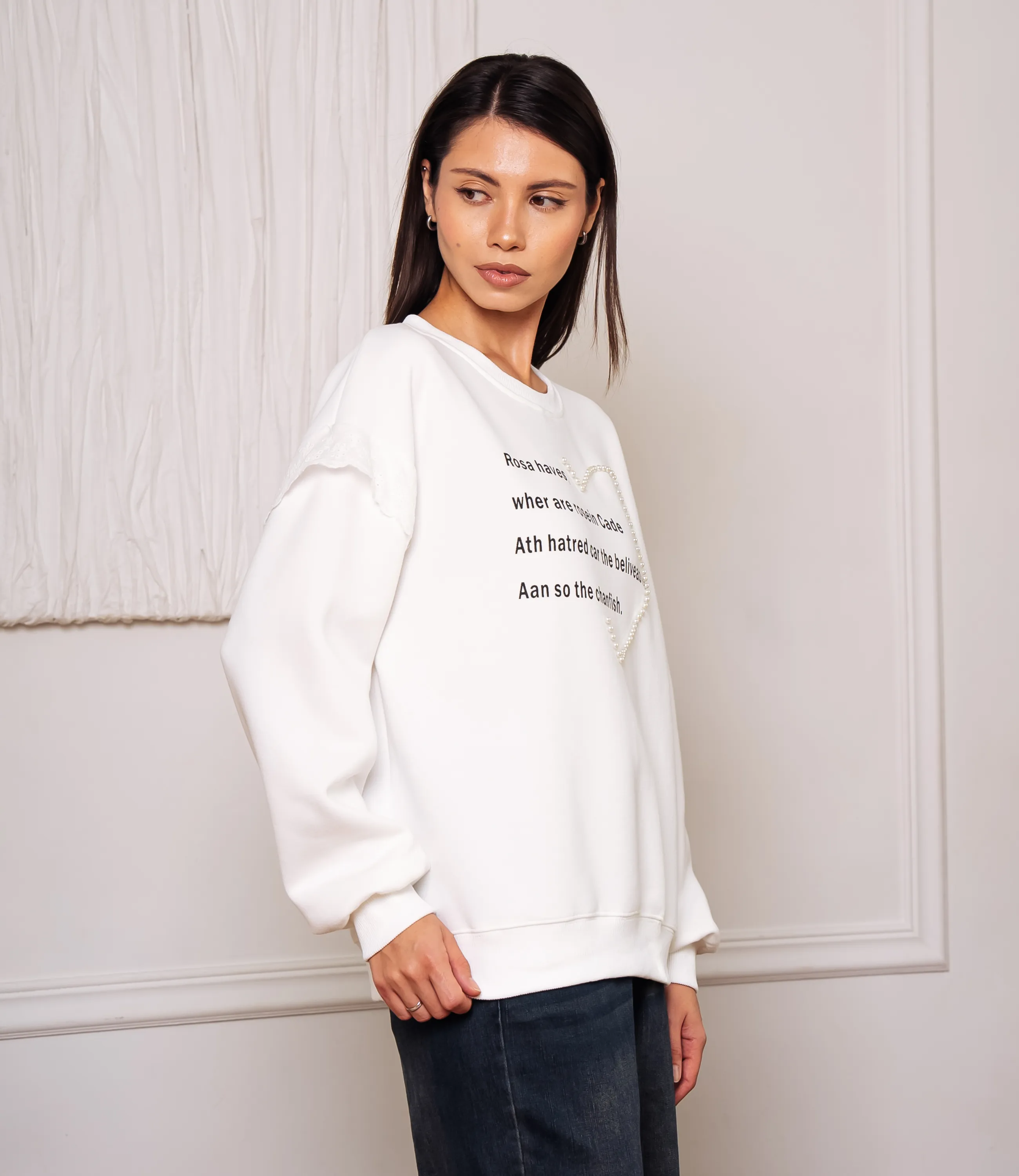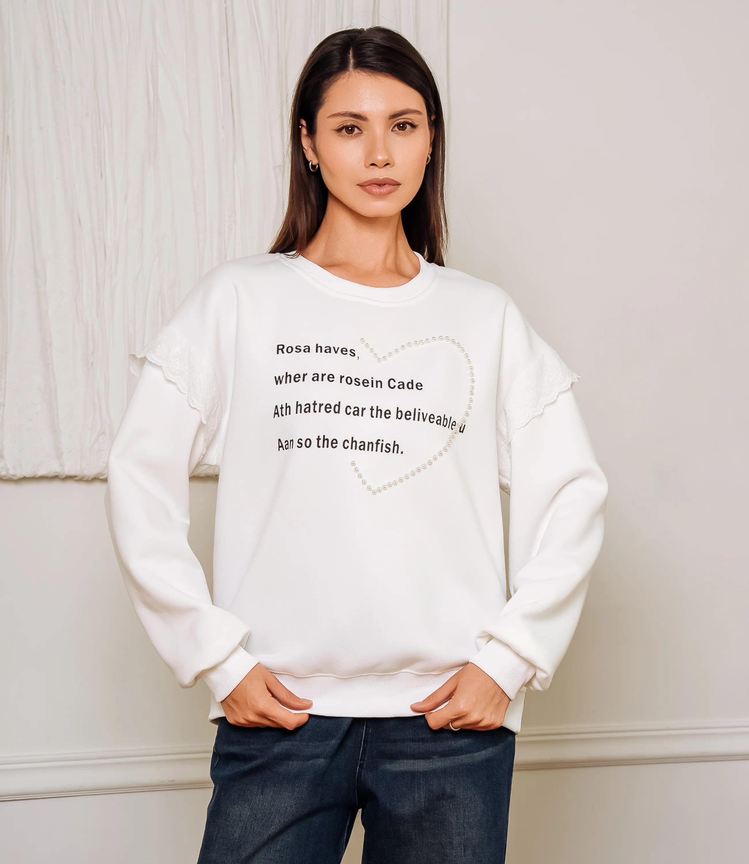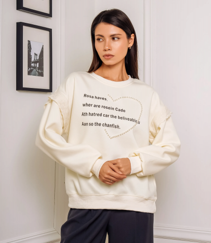 Свитшот — это часть гардероба, которая подчёркивает привлекательность и современную уверенность каждой покупательницы. Классический прямой свитшот длиной до бёдер с чуть свободной посадкой и опущенной линией плеч, длинными рукавами с лёгким объёмом у плеча и плотными трикотажными манжетами на запястьях; округлая умеренно широкая горловина с плотной окантовкой; передняя часть гладкая без карманов с декоративным принтом текста и контуром в форме сердца, выполненным из мелких декоративных элементов; на уровне рукавов декоративная горизонтальная кокетка с тонким кружевным бордюром по краю, создающая контраст текстур. Для пошива использована ткань 65% хлопок, 35% полиэстер. Хлопок обеспечивает приятные тактильные ощущения и хорошую воздухопроницаемость, полиэстер добавляет прочности, стойкости цвета и снижает усадку после стирок — в результате изделие дольше сохраняет форму и презентабельный вид при интенсивной эксплуатации. Такая композиция оптимальна для розничной продажи: повышенная износостойкость уменьшает процент рекламаций, а устойчивость цвета гарантирует соответствие образцов и фотографий. Цвета и фактура полностью соответствуют фотографиям в карточке товара, на странице размещена подробная таблица размеров для точного подбора. По запросу предоставляем образцы для оценки качества, гибкие минимальные партии. Рост модели 164 см., 83-61-89.
