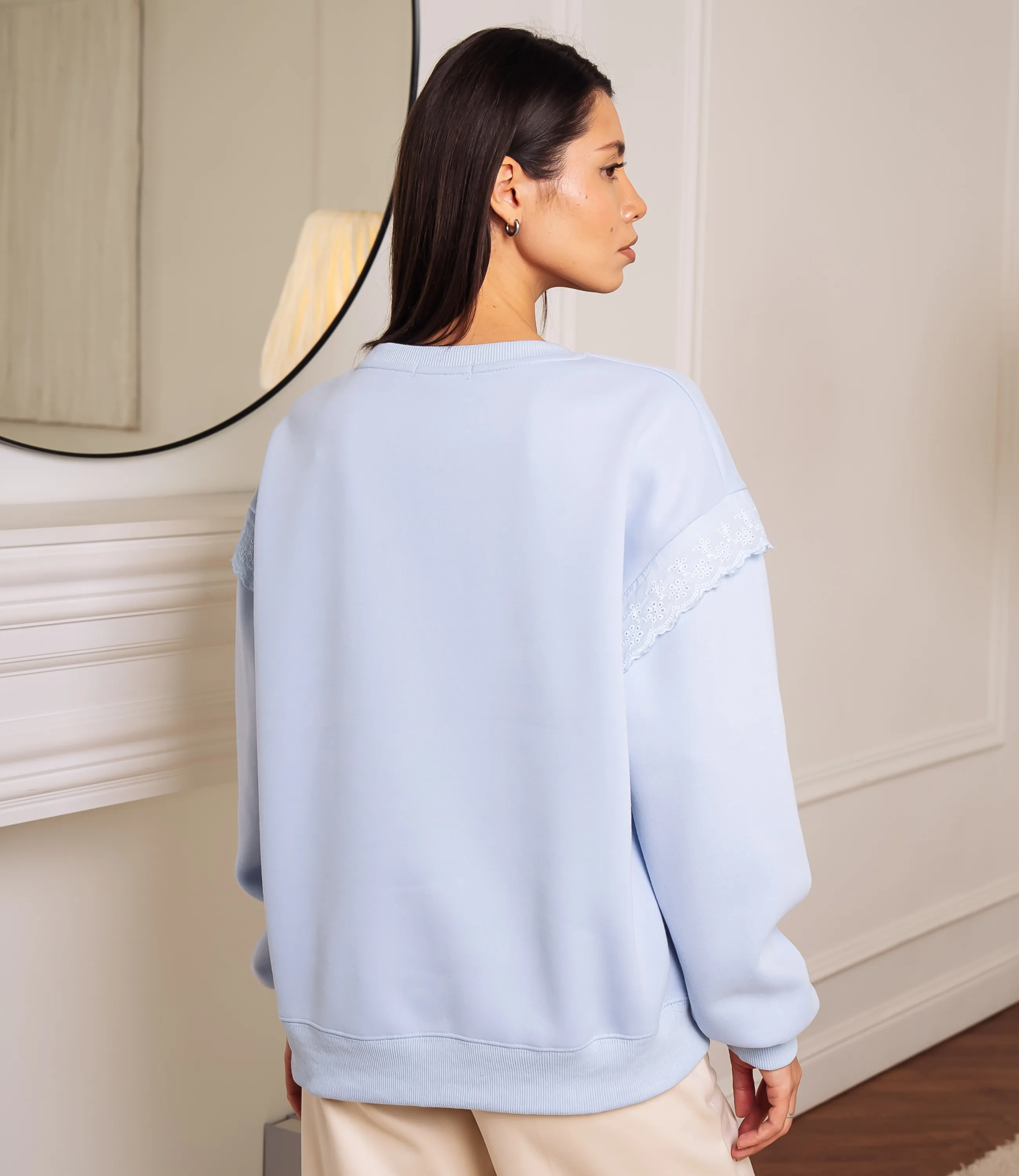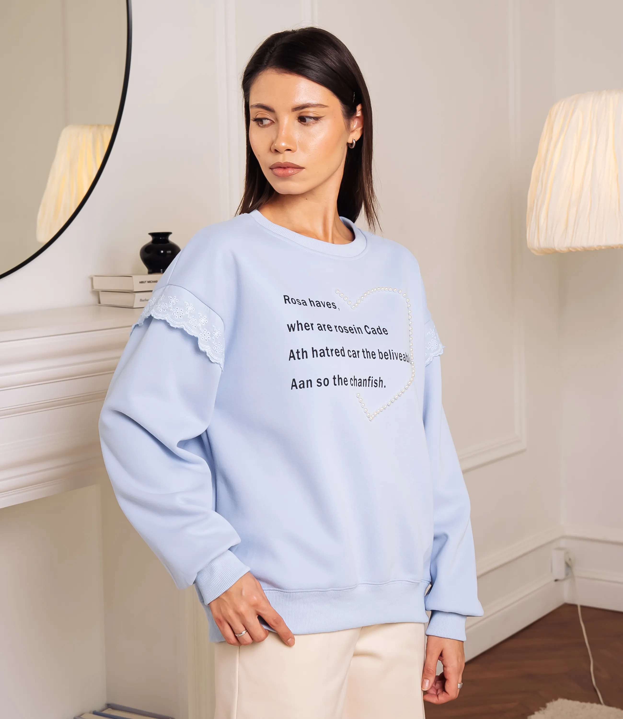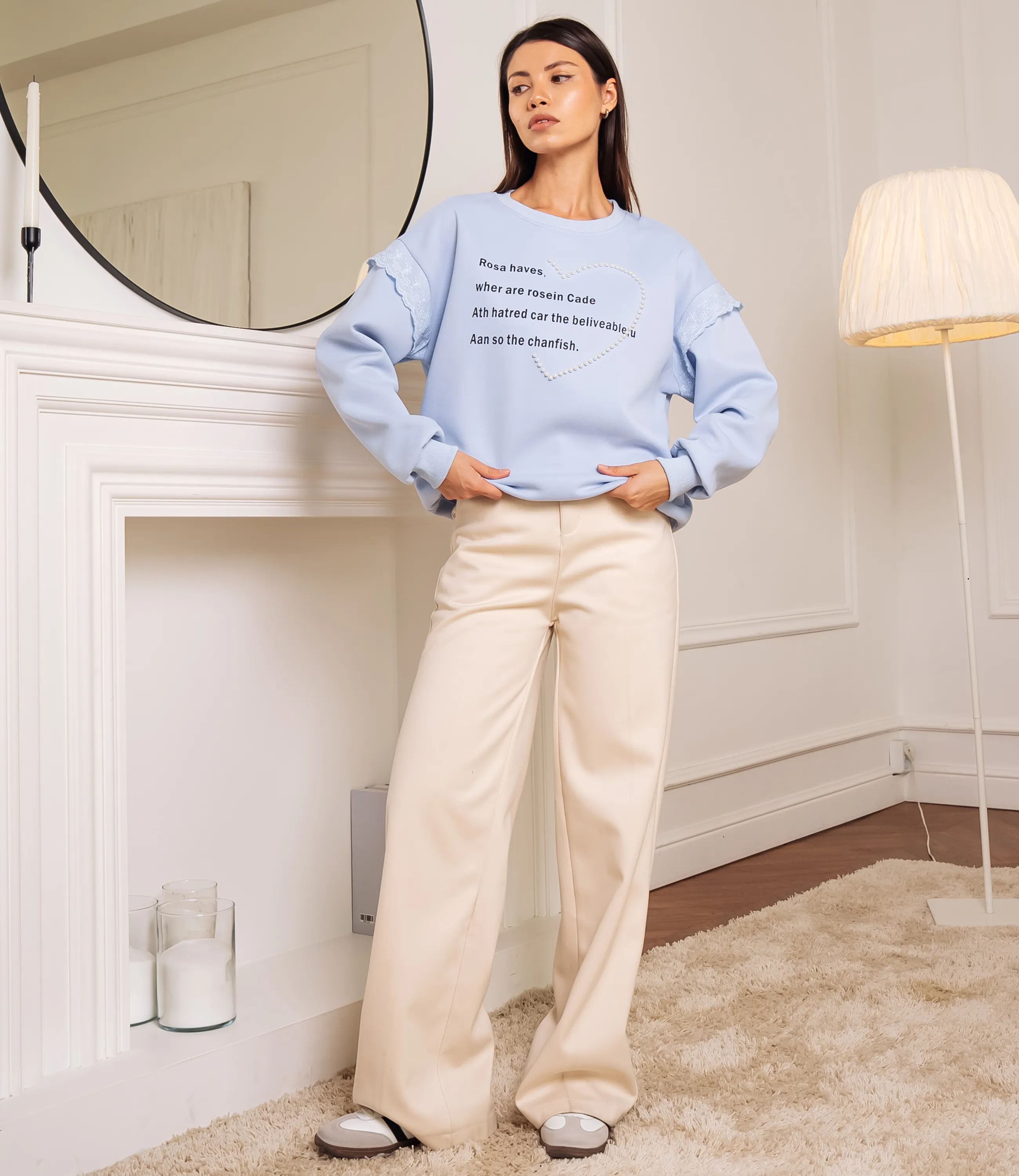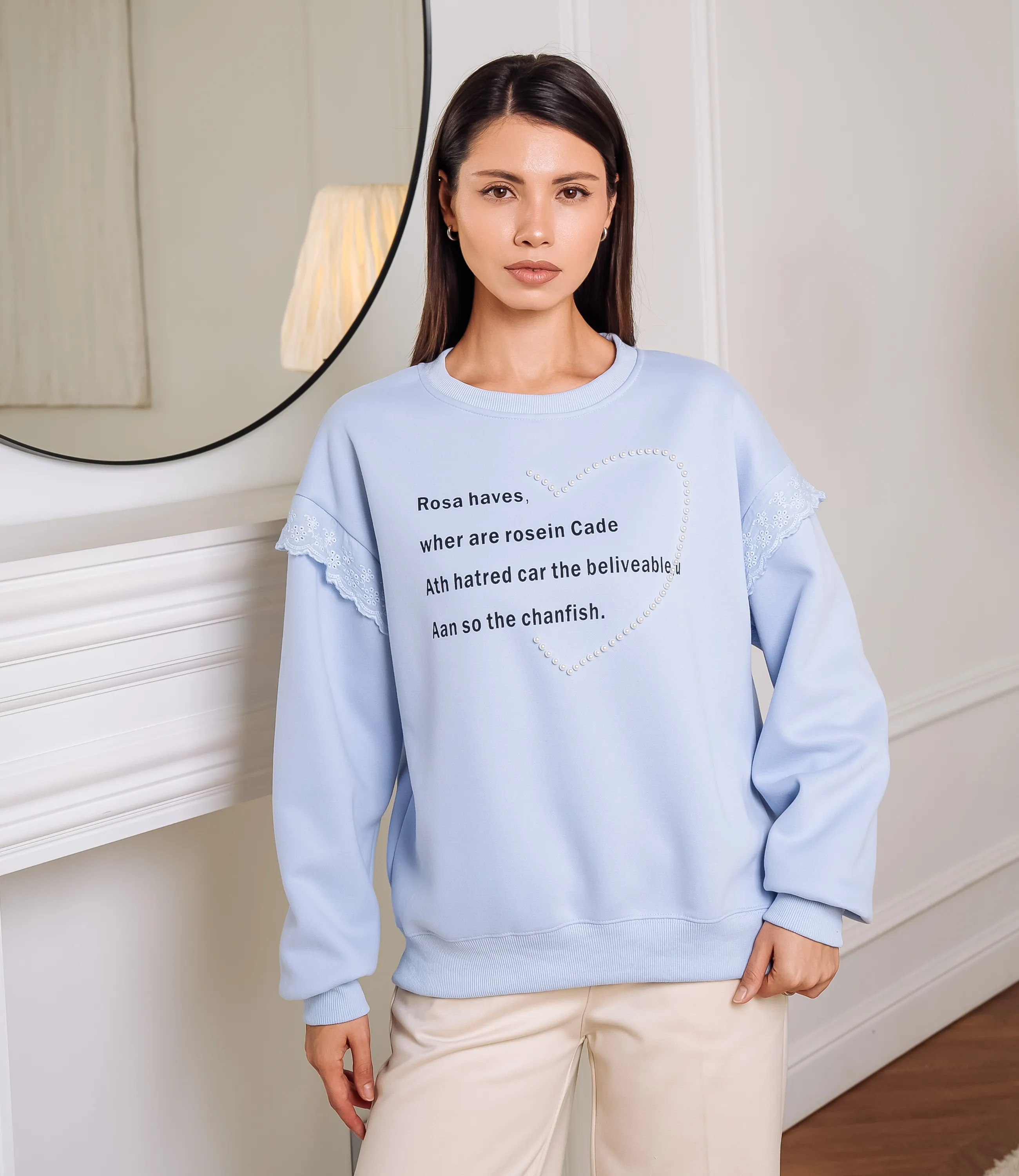 Свитшот — это часть гардероба, которая подчёркивает привлекательность и современную уверенность каждой покупательницы. Классический прямой свитшот длиной до бёдер с чуть свободной посадкой и опущенной линией плеч, длинными рукавами с лёгким объёмом у плеча и плотными трикотажными манжетами на запястьях; округлая умеренно широкая горловина с плотной окантовкой; передняя часть гладкая без карманов с декоративным принтом текста и контуром в форме сердца, выполненным из мелких декоративных элементов; на уровне рукавов декоративная горизонтальная кокетка с тонким кружевным бордюром по краю, создающая контраст текстур. Для пошива использована ткань 65% хлопок, 35% полиэстер. Хлопок обеспечивает приятные тактильные ощущения и хорошую воздухопроницаемость, полиэстер добавляет прочности, стойкости цвета и снижает усадку после стирок — в результате изделие дольше сохраняет форму и презентабельный вид при интенсивной эксплуатации. Такая композиция оптимальна для розничной продажи: повышенная износостойкость уменьшает процент рекламаций, а устойчивость цвета гарантирует соответствие образцов и фотографий. Цвета и фактура полностью соответствуют фотографиям в карточке товара, на странице размещена подробная таблица размеров для точного подбора. По запросу предоставляем образцы для оценки качества, гибкие минимальные партии. Рост модели 164 см., 83-61-89.