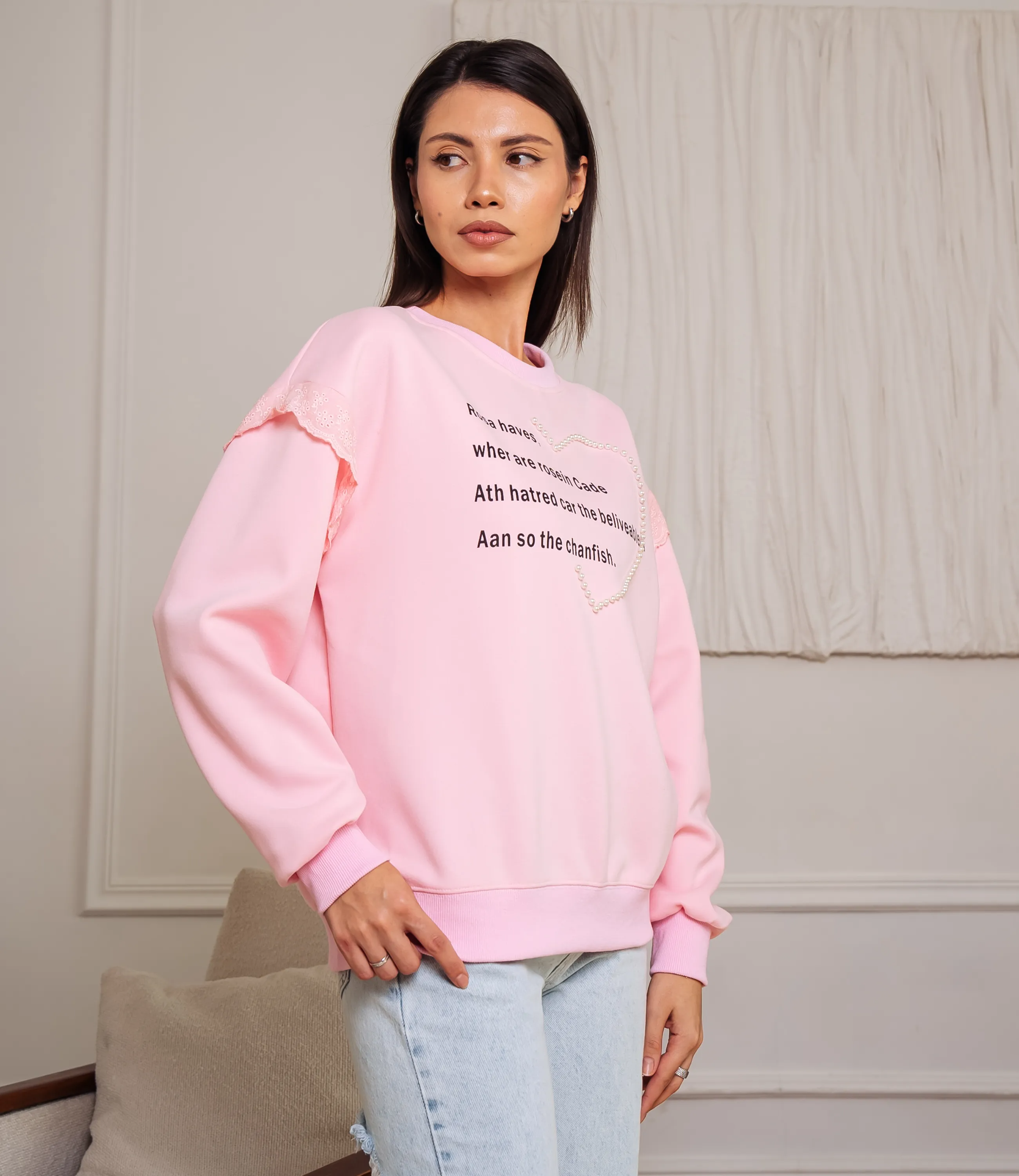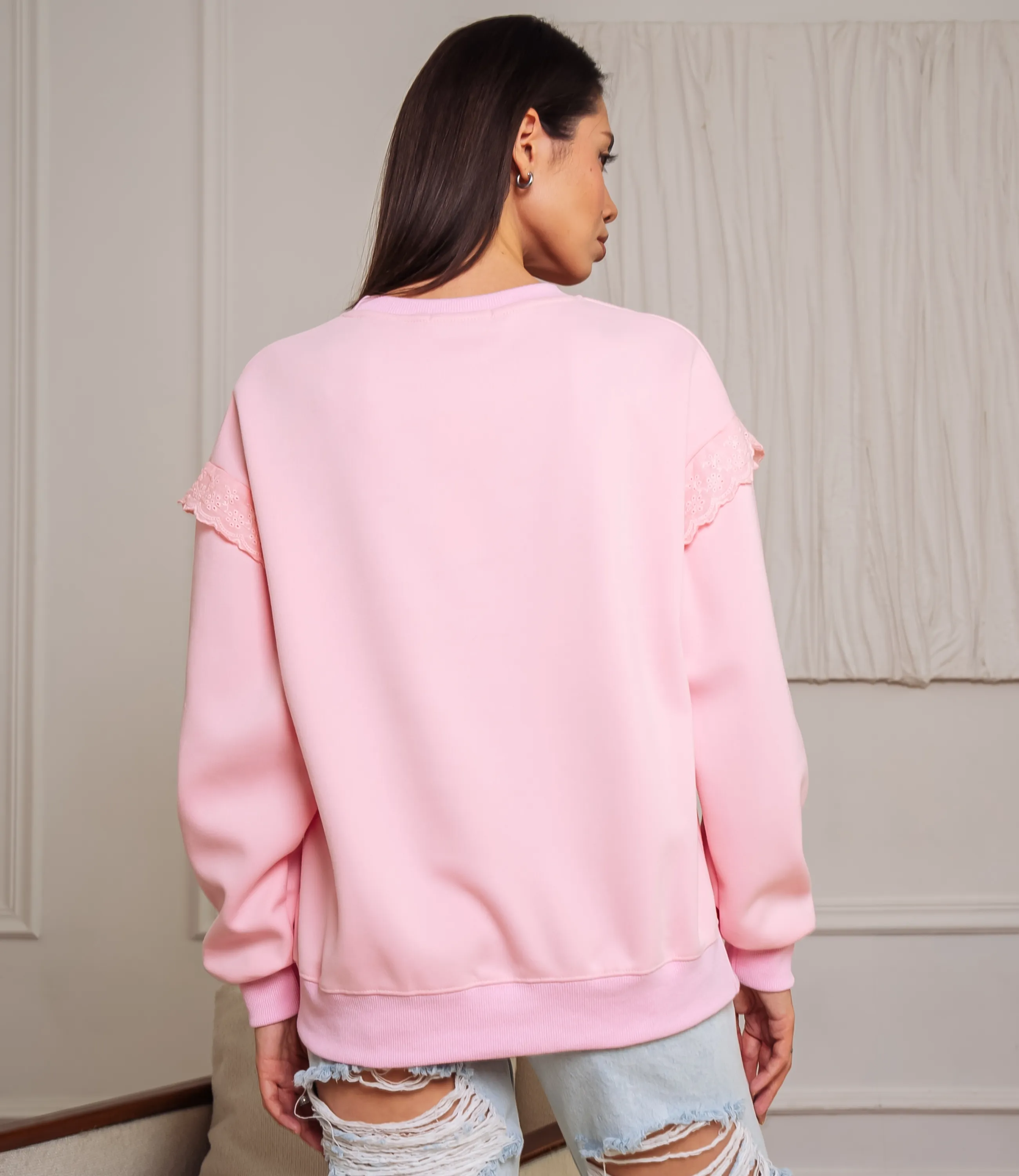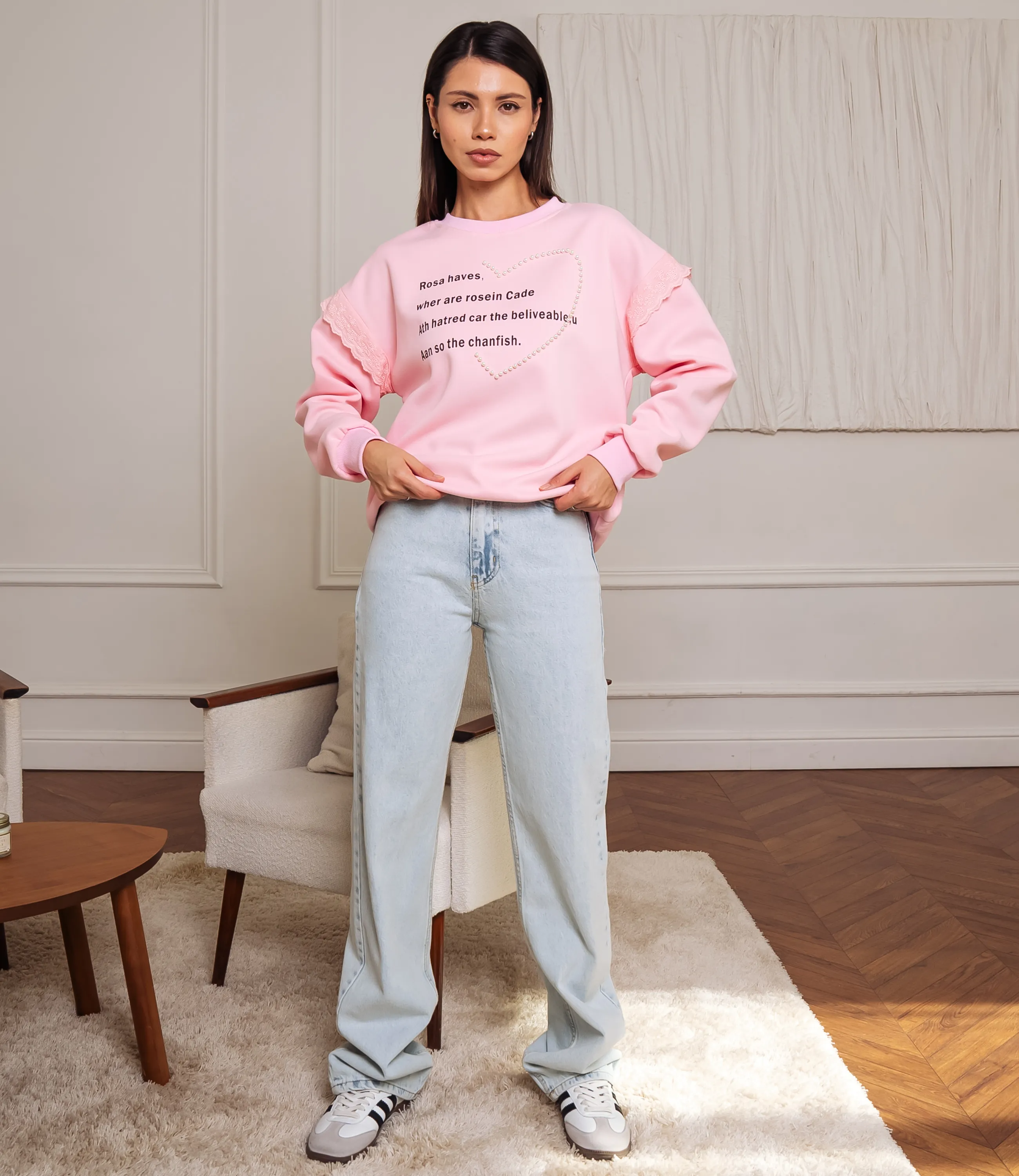 Свитшот — это часть гардероба, которая подчёркивает привлекательность и современную уверенность каждой покупательницы. Классический прямой свитшот длиной до бёдер с чуть свободной посадкой и опущенной линией плеч, длинными рукавами с лёгким объёмом у плеча и плотными трикотажными манжетами на запястьях; округлая умеренно широкая горловина с плотной окантовкой; передняя часть гладкая без карманов с декоративным принтом текста и контуром в форме сердца, выполненным из мелких декоративных элементов; на уровне рукавов декоративная горизонтальная кокетка с тонким кружевным бордюром по краю, создающая контраст текстур. Для пошива использована ткань 65% хлопок, 35% полиэстер. Хлопок обеспечивает приятные тактильные ощущения и хорошую воздухопроницаемость, полиэстер добавляет прочности, стойкости цвета и снижает усадку после стирок — в результате изделие дольше сохраняет форму и презентабельный вид при интенсивной эксплуатации. Такая композиция оптимальна для розничной продажи: повышенная износостойкость уменьшает процент рекламаций, а устойчивость цвета гарантирует соответствие образцов и фотографий. Цвета и фактура полностью соответствуют фотографиям в карточке товара, на странице размещена подробная таблица размеров для точного подбора. По запросу предоставляем образцы для оценки качества, гибкие минимальные партии. Рост модели 164 см., 83-61-89.