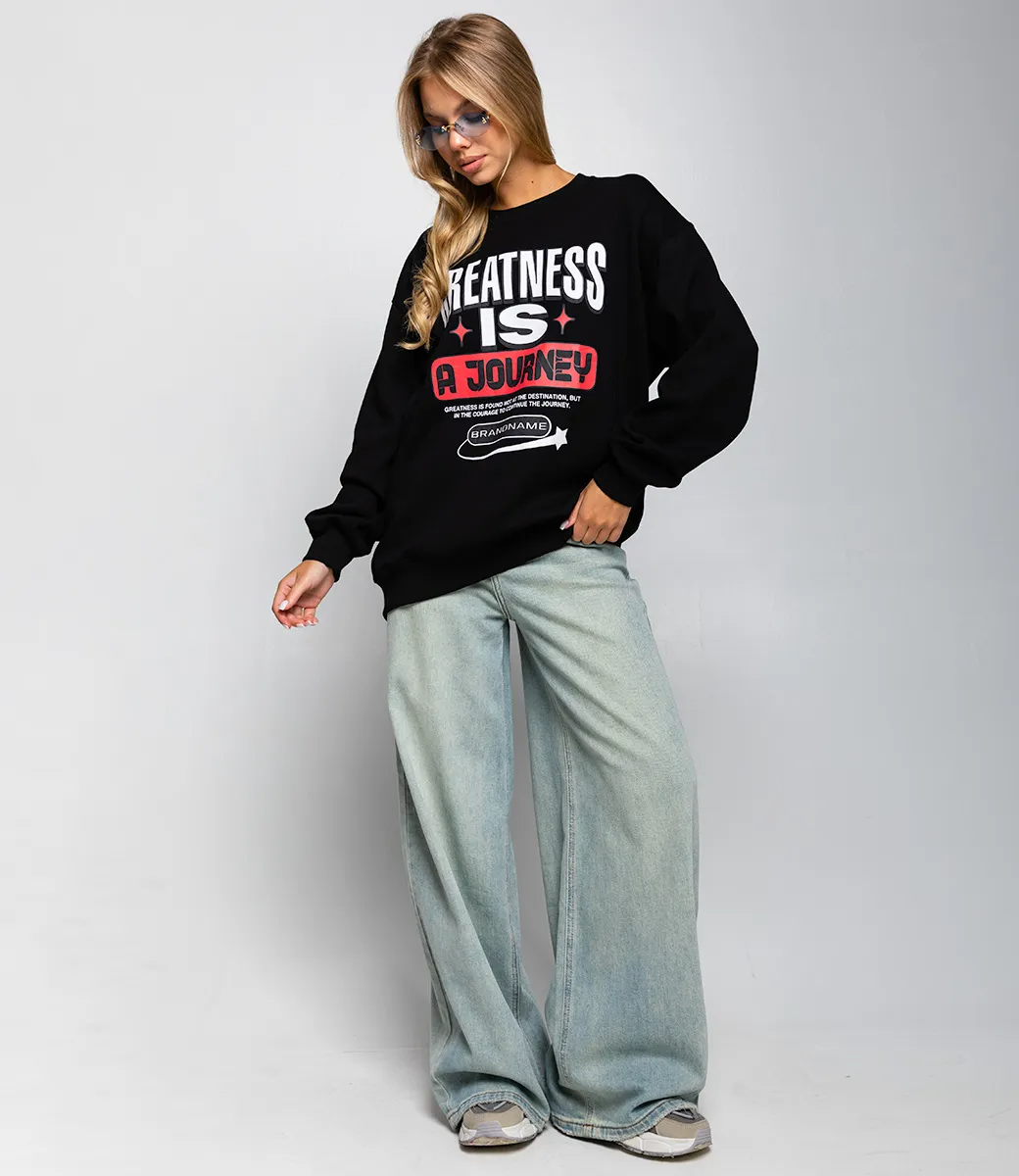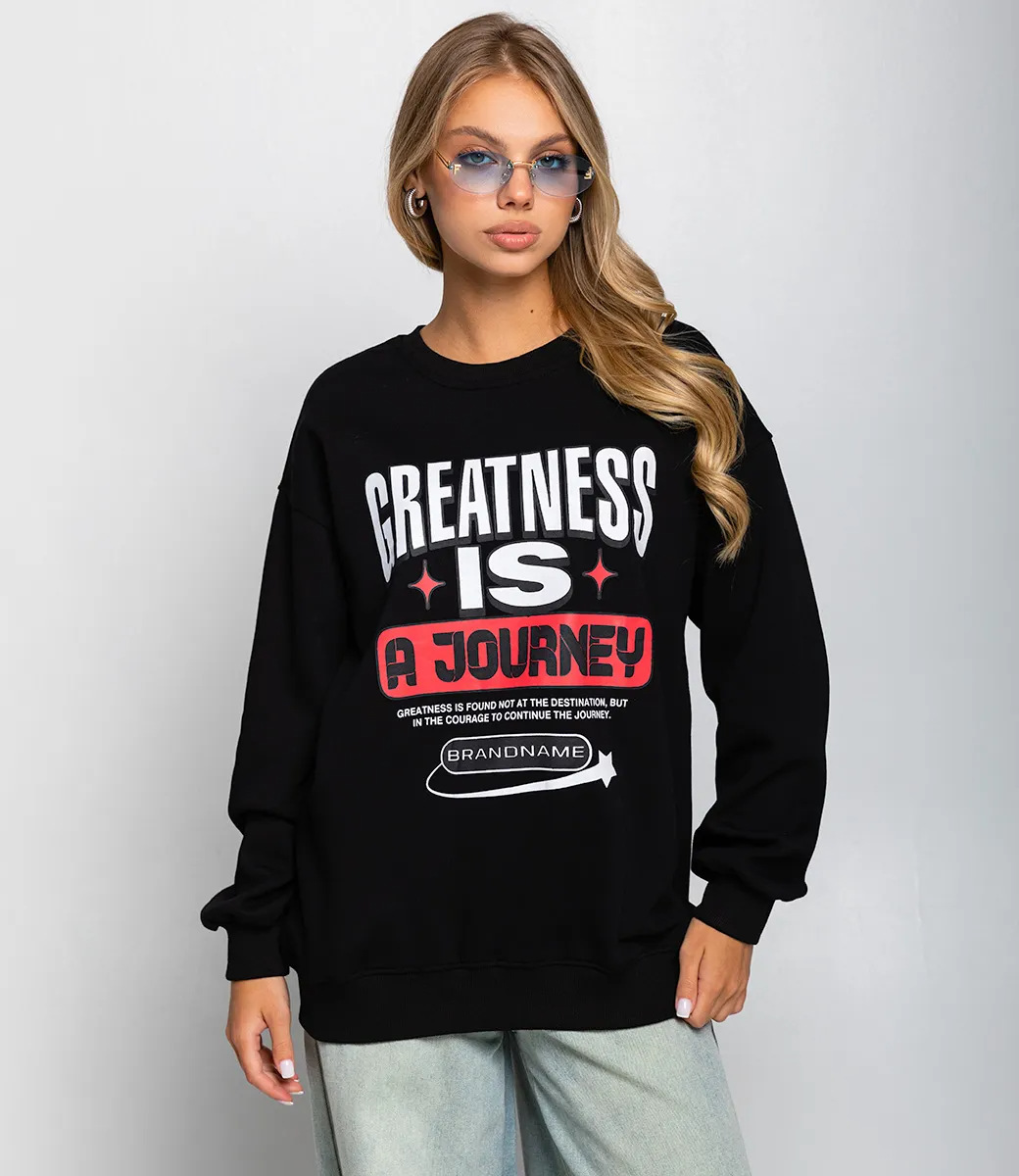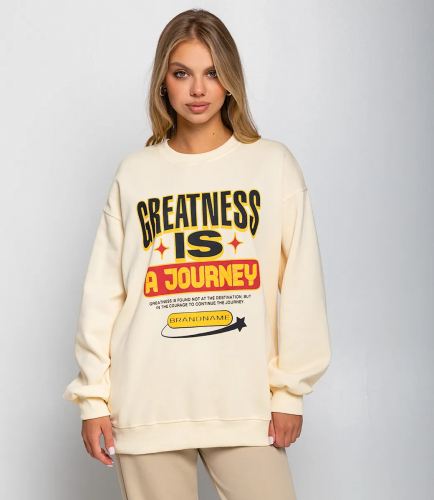 Свитшот — это обязательный элемент гардероба, который сочетает в себе комфорт и стиль, идеальный для активных и современных женщин. Эта модель выполнена в свободном, немного оверсайз стиле, что делает её идеальным выбором для создания непринужденных и модных образов. С долгими рукавами и трикотажными манжетами, свитшот обеспечивает отличную посадку и тепло, что делает его незаменимым в холодное время года. Круглая горловина с трикотажной резинкой добавляет нотку уюта и завершенности. На передней части свитшота располагается крупная яркая надпись с мотивирующим посылом, дополненная оригинальными графическими элементами. Это делает изделие не только стильным, но и придаёт ему особую энергетику, которая вдохновит на новые свершения. Изготовленный из 80% хлопка и 20% полиэстера, свитшот отличается плотным и приятным на ощупь материалом, который будет комфортен для повседневной носки, оставаясь при этом стильным. Такой свитшот идеально подходит для создания стильного и удобного образа, легко комбинируется с джинсами, спортивными брюками или юбками. Для уверенности в выборе размера мы предоставили на странице удобную таблицу размеров. Мы уверены, что предложенная цена является разумной и доступной, что делает этот свитшот блестящим выбором для оптовых покупателей. Подарите своим клиентам возможность быть стильными и уверенными в себе, выбрав наш уникальный свитшот! Рост модели 168 см., 89-63-90.