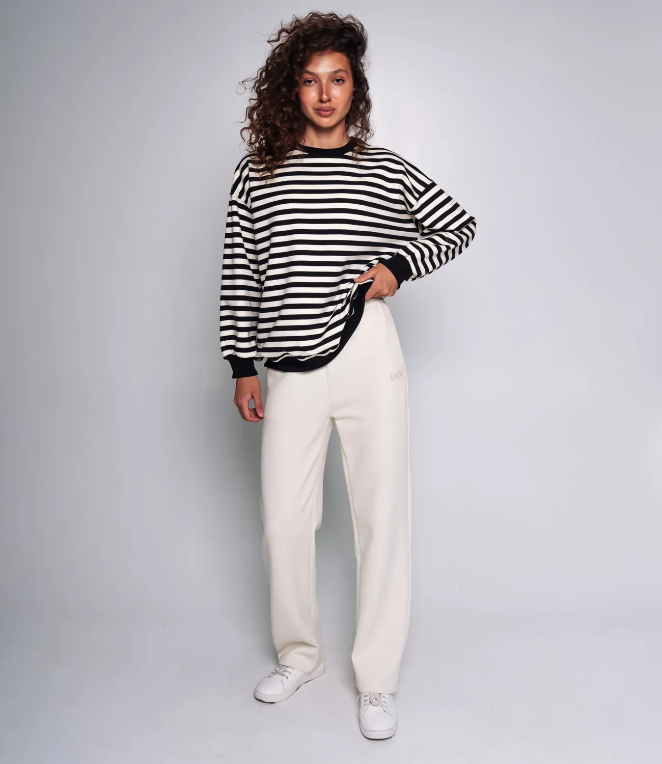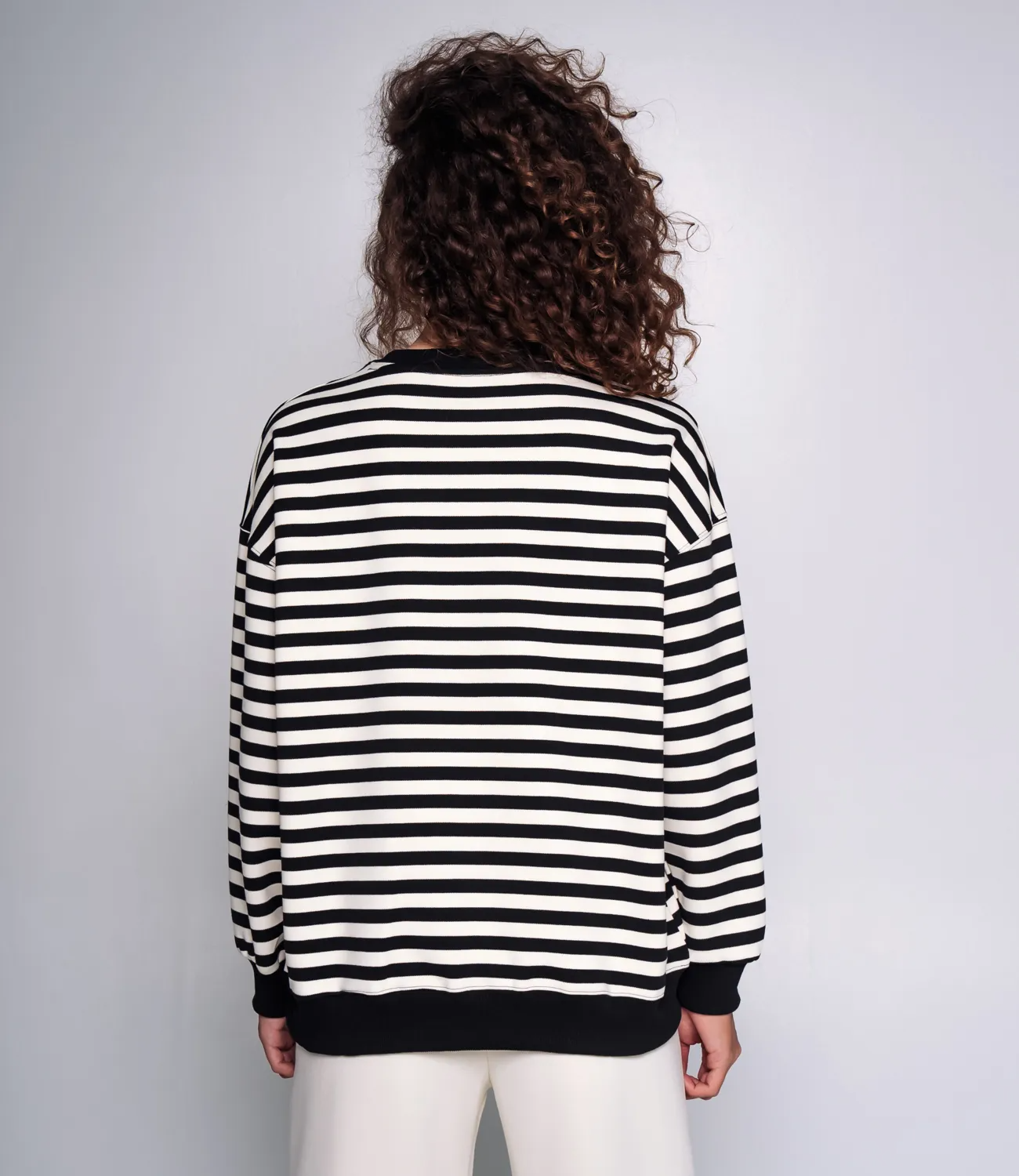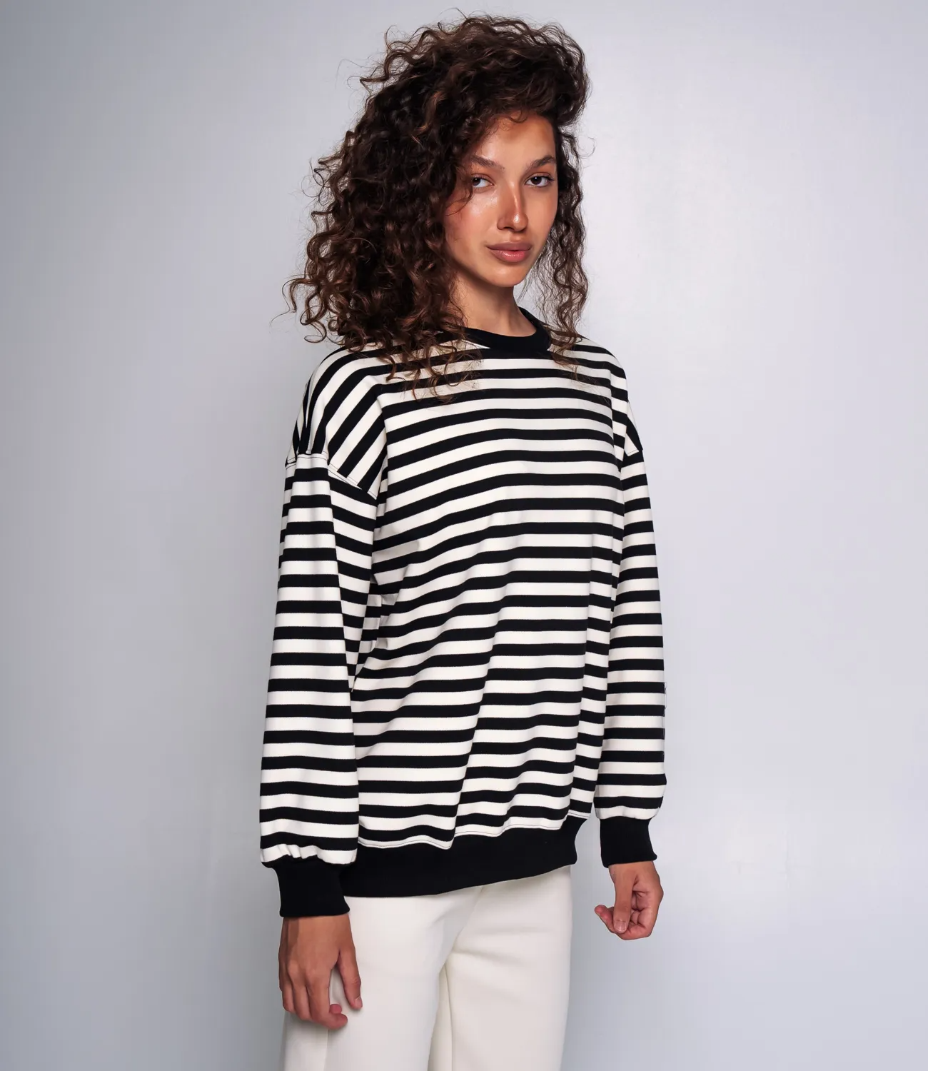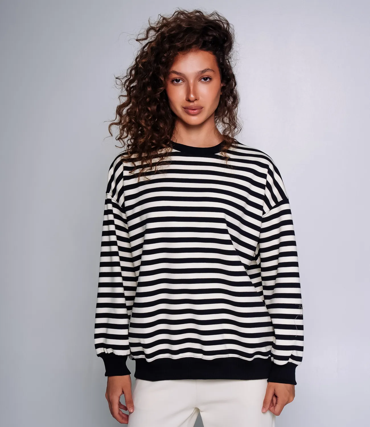 Свитшот – это новая классика, которая станет незаменимой частью гардероба для современных женщин. Его стильный дизайн и комфортное качество делают его идеальным выбором для демисезонного периода. Покупательницы выбирают этот свитшот за его универсальность и возможность легко сочетать его с различными элементами одежды. Свитшот выполнен в классическом черно-белом полосатом дизайне, где широкие полосы чередуются, придавая изделию динамичный и яркий вид. Изготовленный из мягкой и приятной на ощупь ткани, он обеспечивает максимальный комфорт при носке. Крой свитшота классический: длинные рукава и круглый вырез делают его подходящим для любого повода. Манжеты и нижняя часть выполнены в черном цвете, что создает стильный контраст с полосами и подчеркивает общую гармонию изделия. Материал свитшота состоит из 90% хлопка и 10% полиэстера, что гарантирует отличное качество и долговечность. Даже после многих стирок свитшот сохранит свою первоначальную привлекательность, радуя вас своим идеальным состоянием. Обратите внимание на детали – этот свитшот легко комбинируется с различными стилями одежды, что открывает широчайшие возможности для создания модных образов. Для уверенности в выборе размера мы представили на странице таблицу, благодаря которой покупательницы смогут самостоятельно обмерить себя и удостовериться в правильности выбора. Установленная нами цена является доступной и приемлемой.
