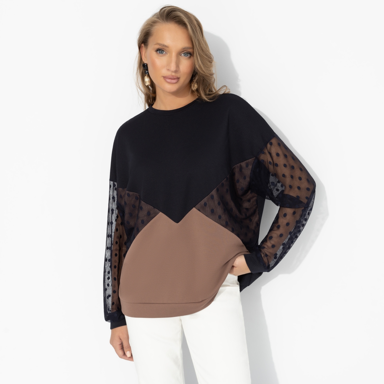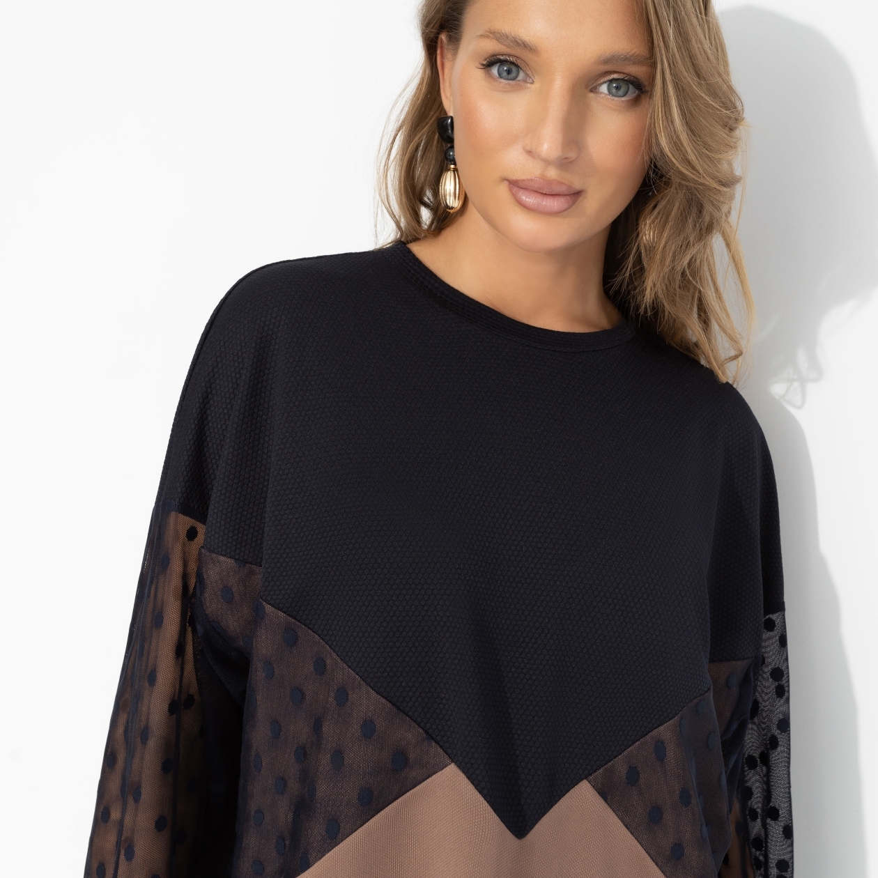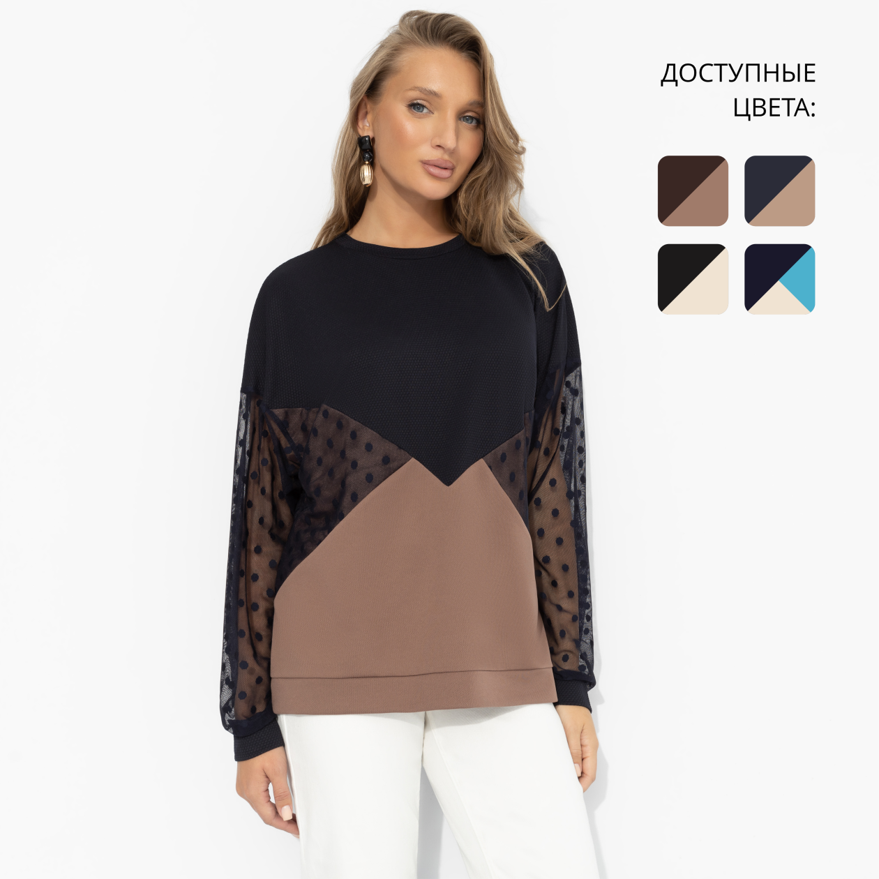 Женственность – не про каблуки и вечерние платья. Это про мягкость движений, уверенность в каждом взгляде и способность быть собой даже в повседневности. Свитшот словно создан для того, чтобы подчеркнуть природное обаяние и лёгкость. Свитшот прямого силуэта с игрой фактур: плотный трикотаж двух видов гармонично сочетается с полупрозрачной сеткой в горох. Комфортный, стильный вариант для образов на каждый день.