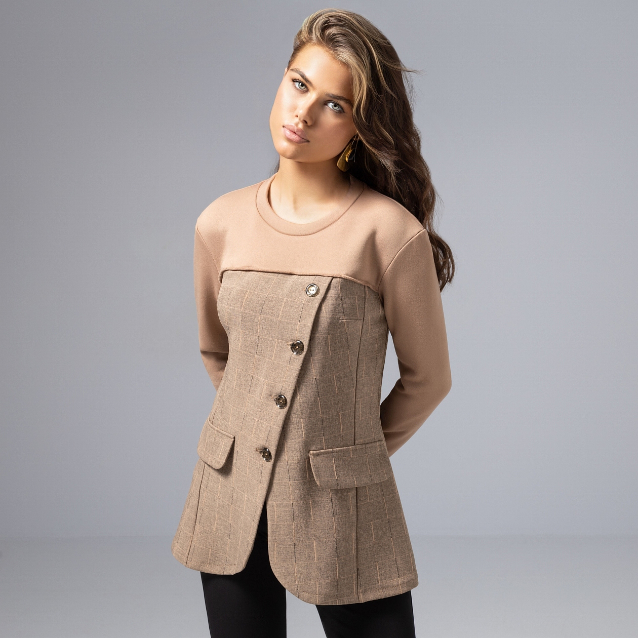 Состав: Трикотаж «футер», кост. ткань «ривьера жаккард» (65% п/э, 30% вискоза, 5% спандекс)