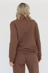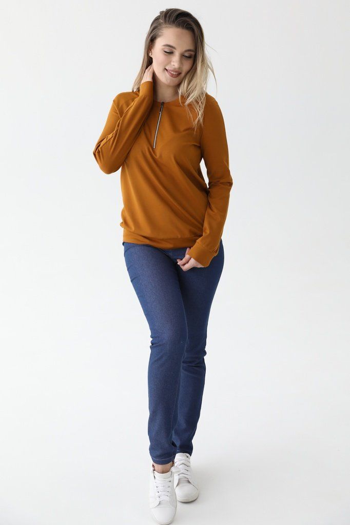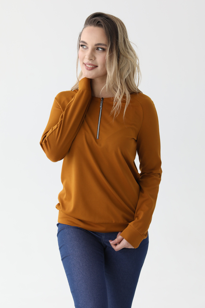 Свитшот с рукавами реглан и манжетами по низу, притачной пояс, круглая горловина и застежка на молнию по переду.