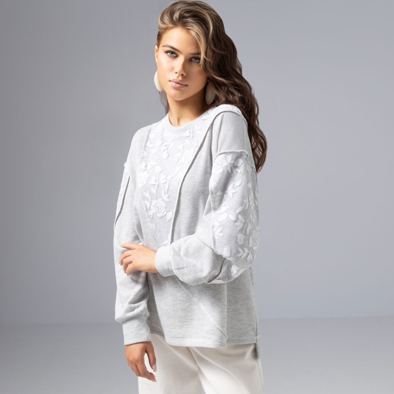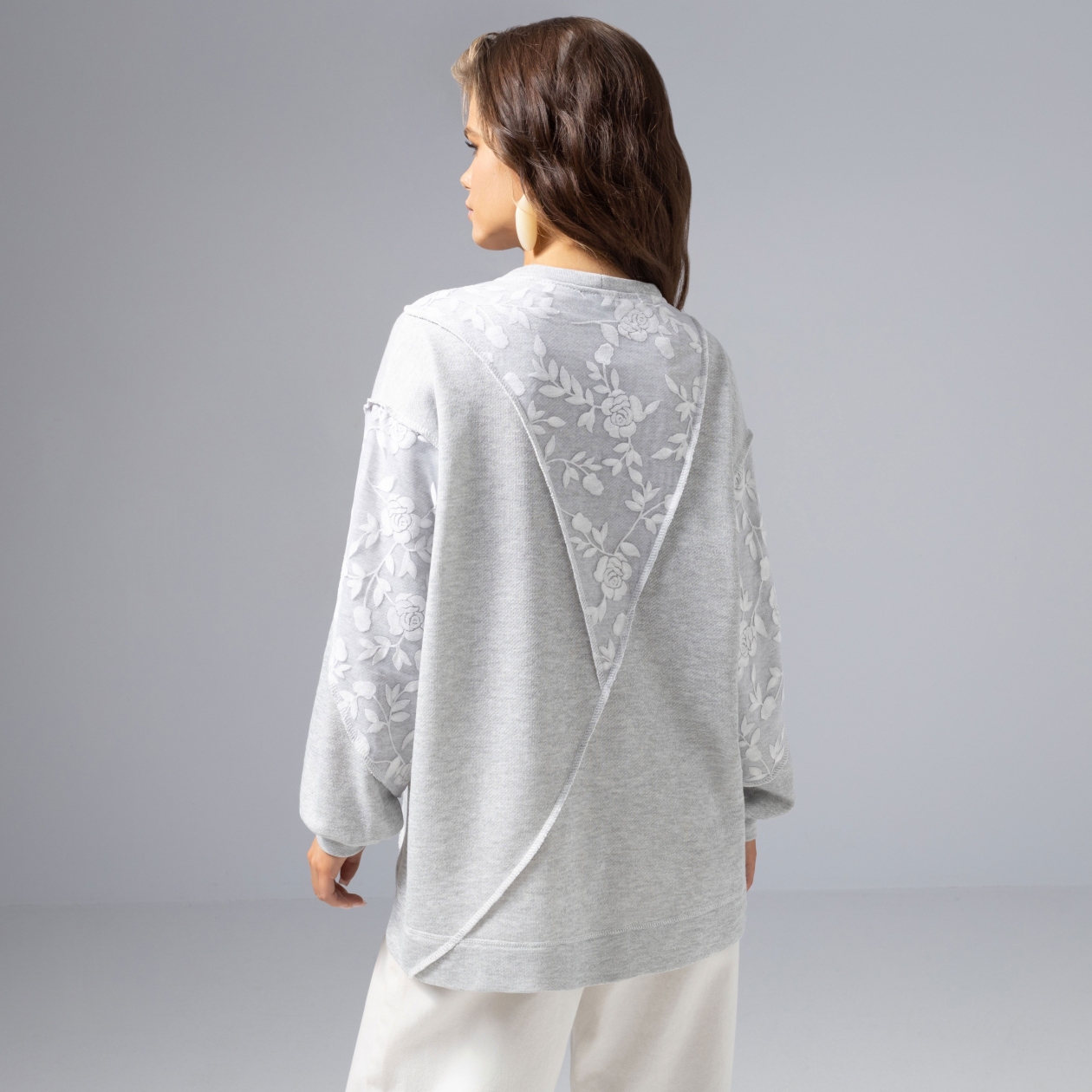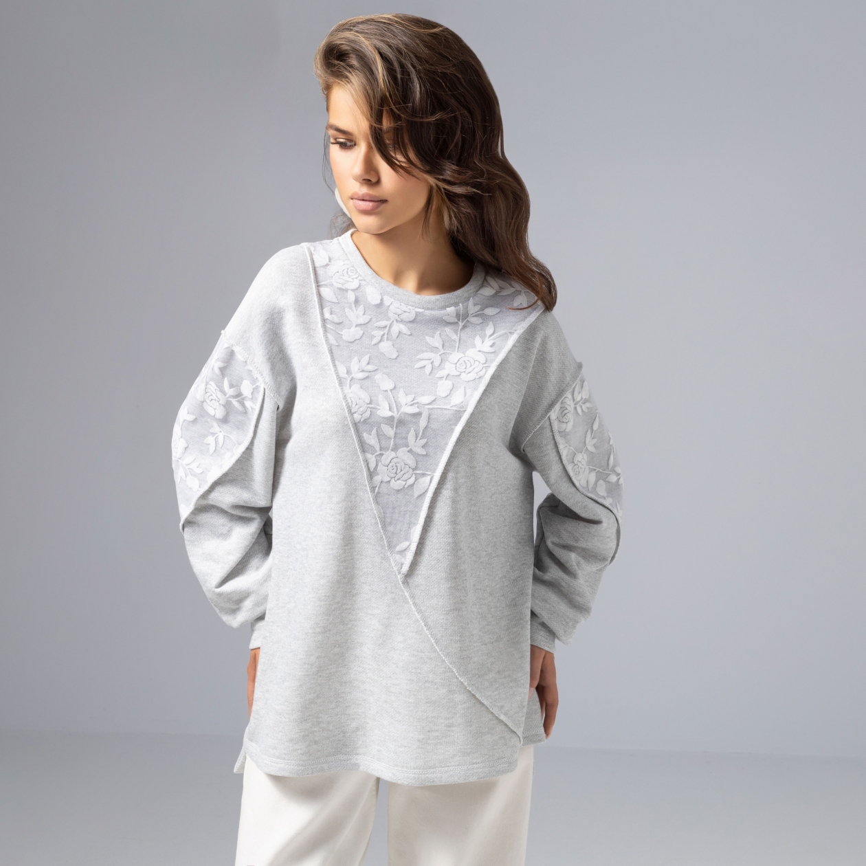 ЧАРУТТИ – когда роскошь проявляется в тактильных ощущениях и спокойном оттенке. Игра света на кружеве, мягкая ткань, акцентные швы наружу – этот свитшот не хочется снимать. Просто добавьте к своему расслабленному образу акцентный штрих. Свитшот из мягкого трикотажа с современной свободной посадкой. Универсальный вариант для ценительниц деликатной роскоши и мягкого минимализма.