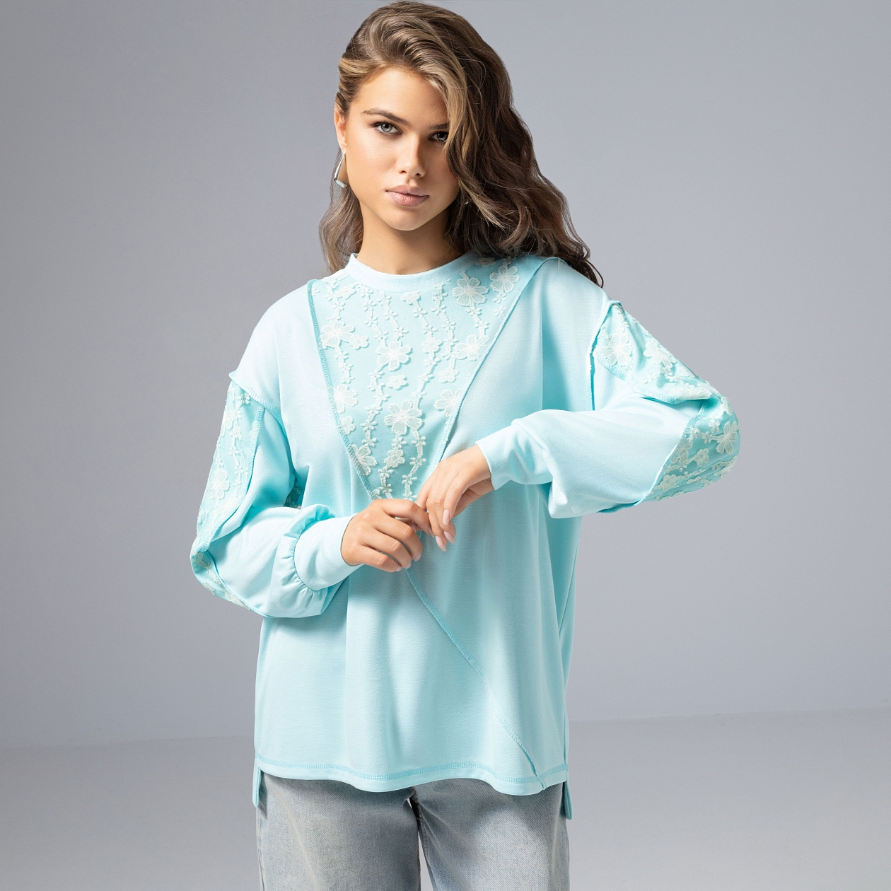Свитшот ЧАРУТТИ вдохновлён глобальными макротрендами: объём, пастель, деликатное кружево в кэжуал-формате. В мире, где ценят тактильные удовольствия, мода говорит: стирайте границы между домашней свободой и городской динамикой. Трикотаж «нейлон-рома» гарантирует легкость, пластичность и приятное ощущение на коже. Декор из ажурного кружева, акцентные швы, модный оверсайз-крой, спущенная линия плеча. Мягко тянется и не требует особого ухода.