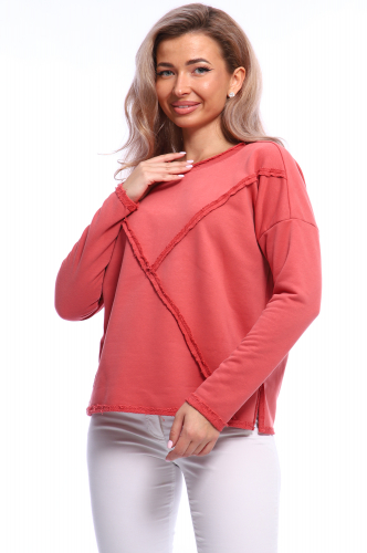 Стильный женский свитшот с длинным рукавом из футера без начеса. Особенность модели — швы наружу и разрезы по бокам  придают вещи оригинальный дизайнерский вид и подчеркивают ее уникальность. Ткань футер 3-х нитка петля-диагональ, качество пенье, плотность 300-320 г/м2. Ткань приятная к телу и практичная в носке.