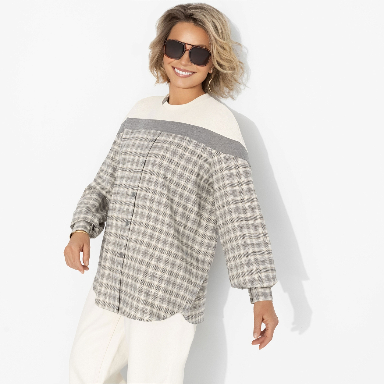 Мягкий свободный свитшот в благородную клетку с контрастной вставкой. Застёжка на пуговицы, длинные рукава с резинкой, ткань хорошо держит форму и дарит комфорт. Идеален для осеннего настроения!
