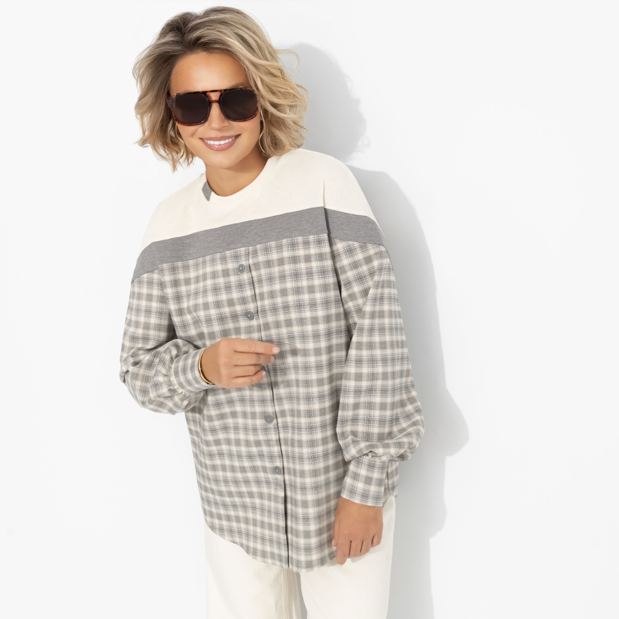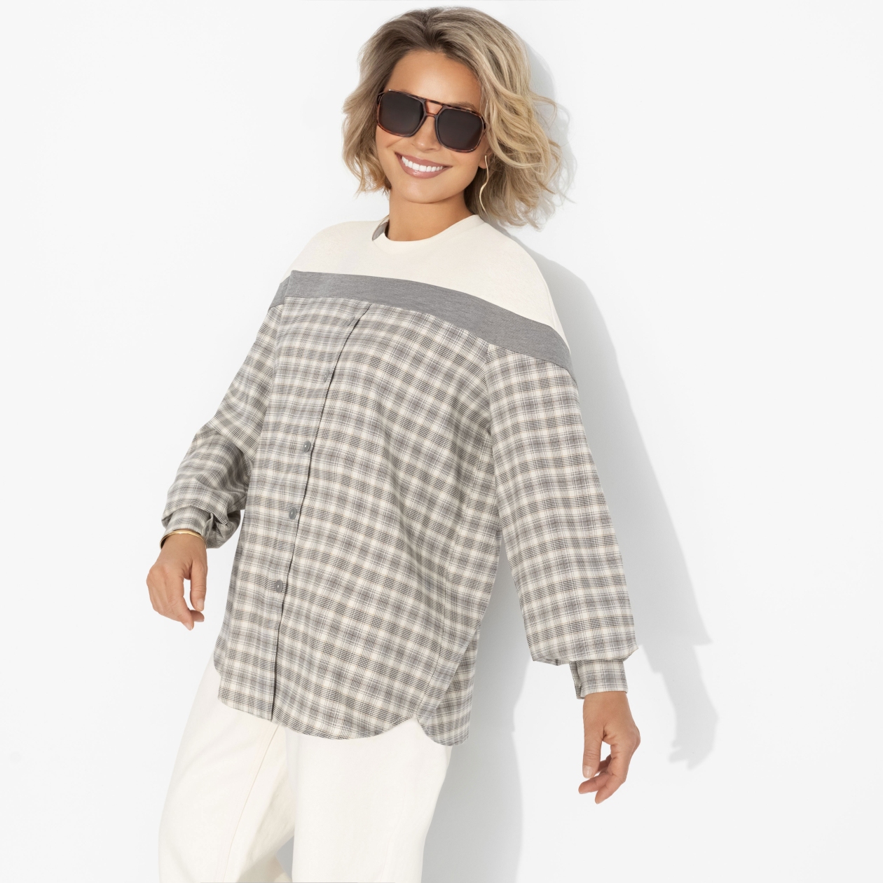 Мягкий свободный свитшот в благородную клетку с контрастной вставкой. Застёжка на пуговицы, длинные рукава с резинкой, ткань хорошо держит форму и дарит комфорт. Идеален для осеннего настроения!