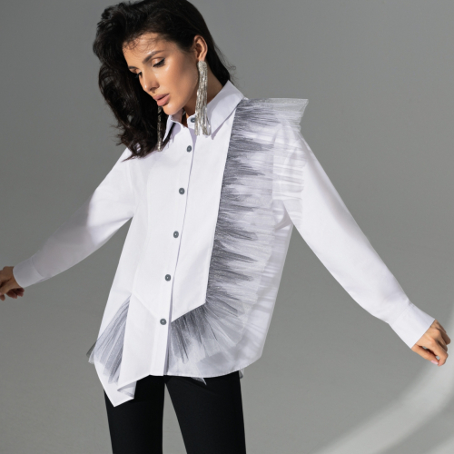 Шелковый акцентный принт, сложный крой рукавов и трендовые необработанные швы – всё сплелось в модный симбиоз для того, чтобы вы чувствовали себя особенной. Это качество для вас!