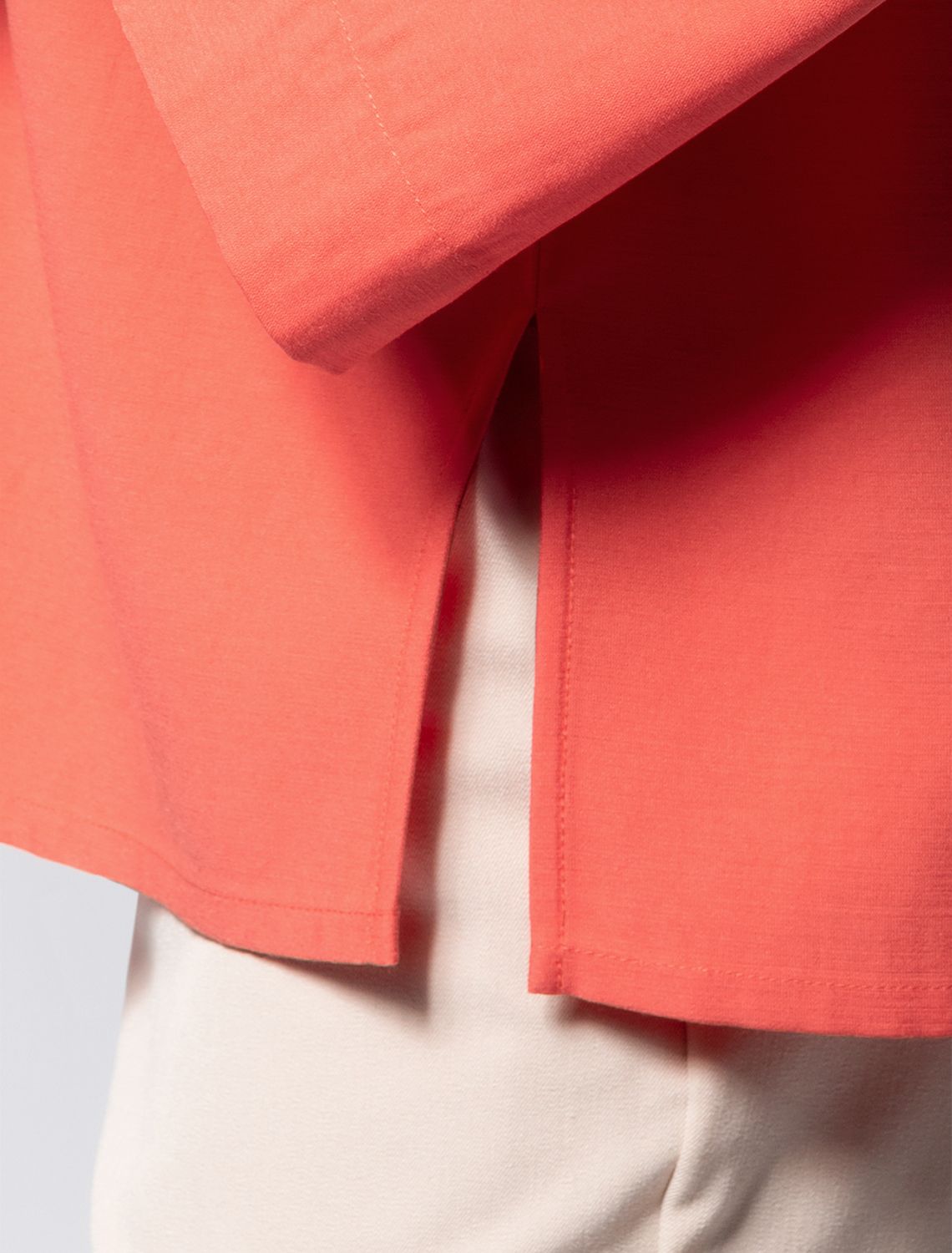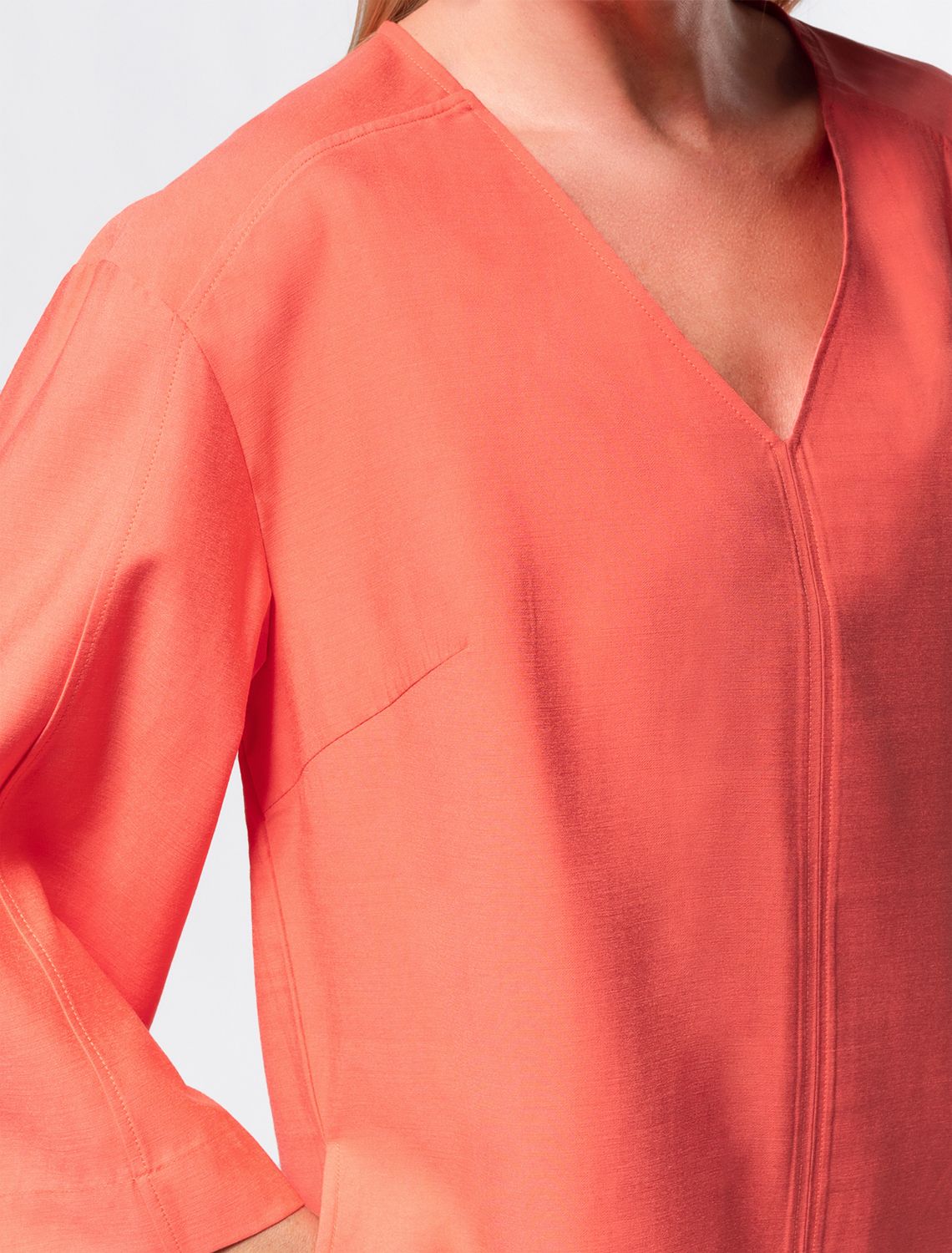 Свободная блузка со спущенным плечом выполнена из плотного лиоцелла. Добавление синтетических волокон в составе изделия предотвращает сминаемость. Модель с V-вырезом дополнена боковыми разрезами и декоративным швом спереди. Подходит для любой фигуры. Для создания расслабленного образа, сочетайте в костюме с брюками D24.214, D24.218, шортами D28.054 и юбкой D26.181
