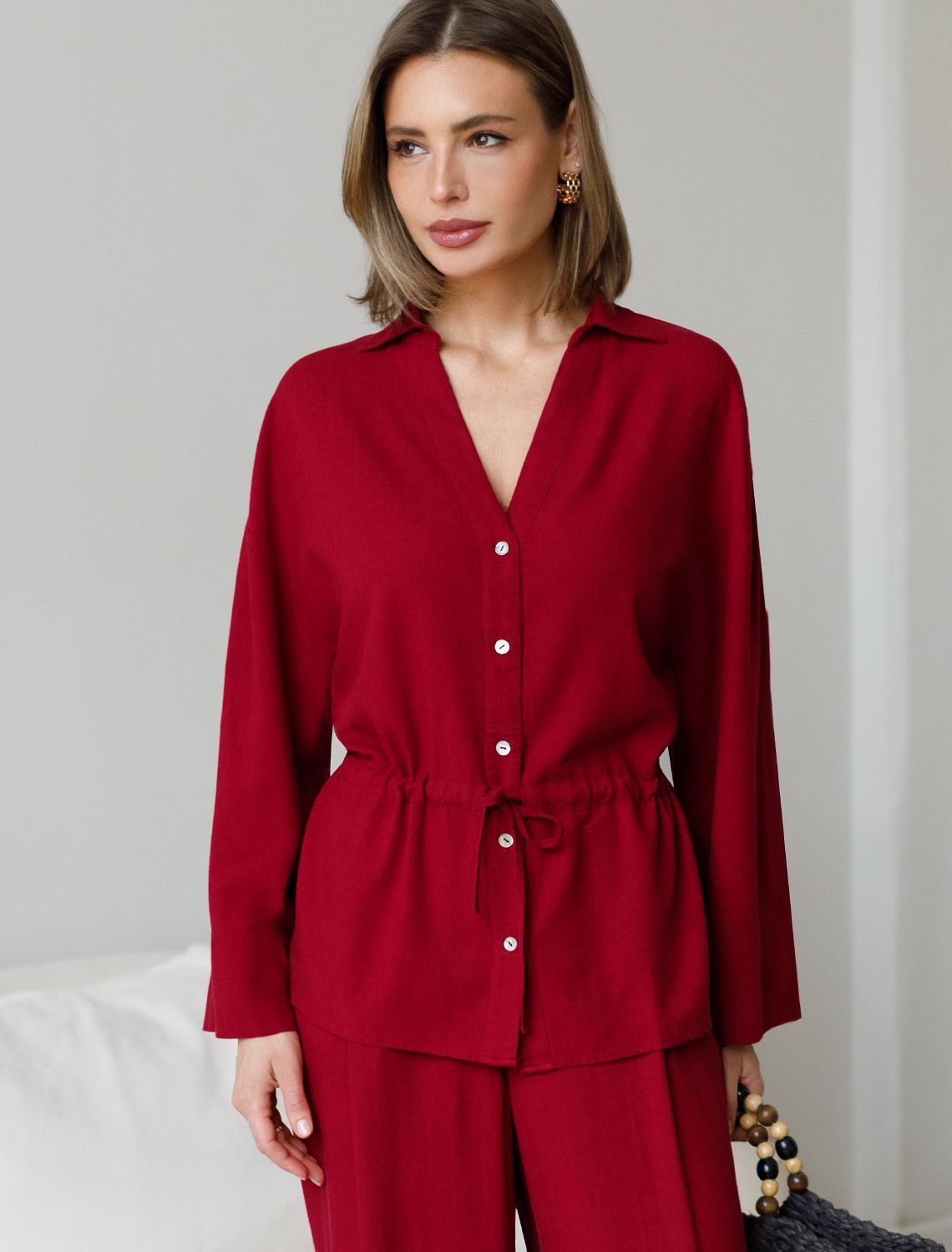 Свободная блузка гранатового цвета с кулиской на талии изо льна с вискозой, плотностью 200 Г/м2 - идеальный вариант для весны и лета. Сочетание льна и вискозы обеспечивает комфорт и прохладу в жаркие дни. Материал хорошо драпируется и мягко прилегает к фигуре, создавая струящиеся складки. Эта эффектная блузка сочетает в себе современный крой, удобство и стиль. Отложной воротник придает образу элегантность, спущенная линия плеча — модный и расслабленный акцент, а широкий рукав создает красивый и воздушный силуэт. Талия оформлена утягивающей кулиской, что позволяет регулировать посадку — создайте акцент на поясе для женственного силуэта или носите свободно для комфорта, отлично скроет возможные недостатки. Пуговицы по всей длине делают льняную рубашку особенно практичной, вы можете носить ее растегнутой, как верхний слой. Эта легкая блузка подходит для повседневного гардероба, смотрится красиво и стильно, обеспечивая максимальное удобство, подойдет и на большие размеры.