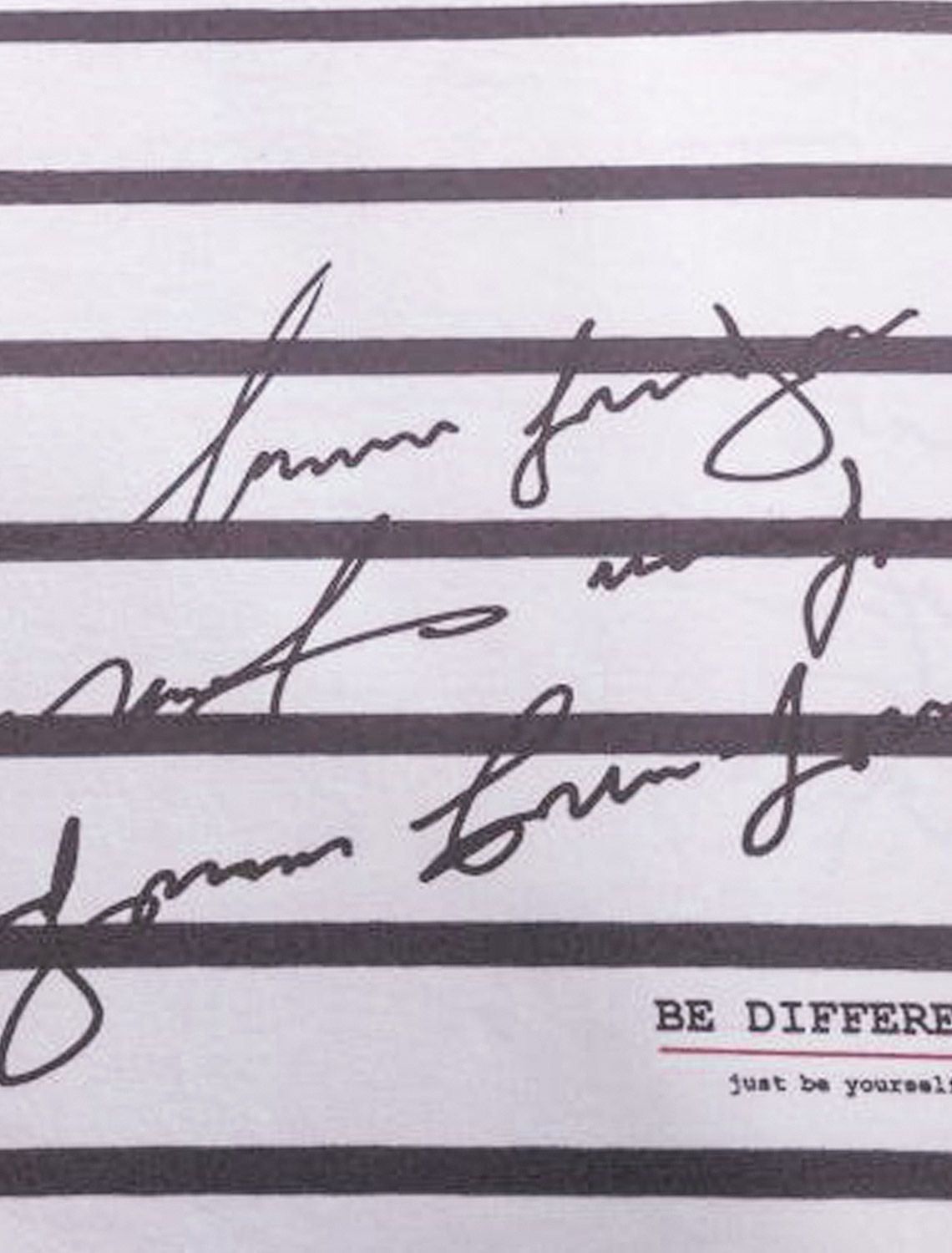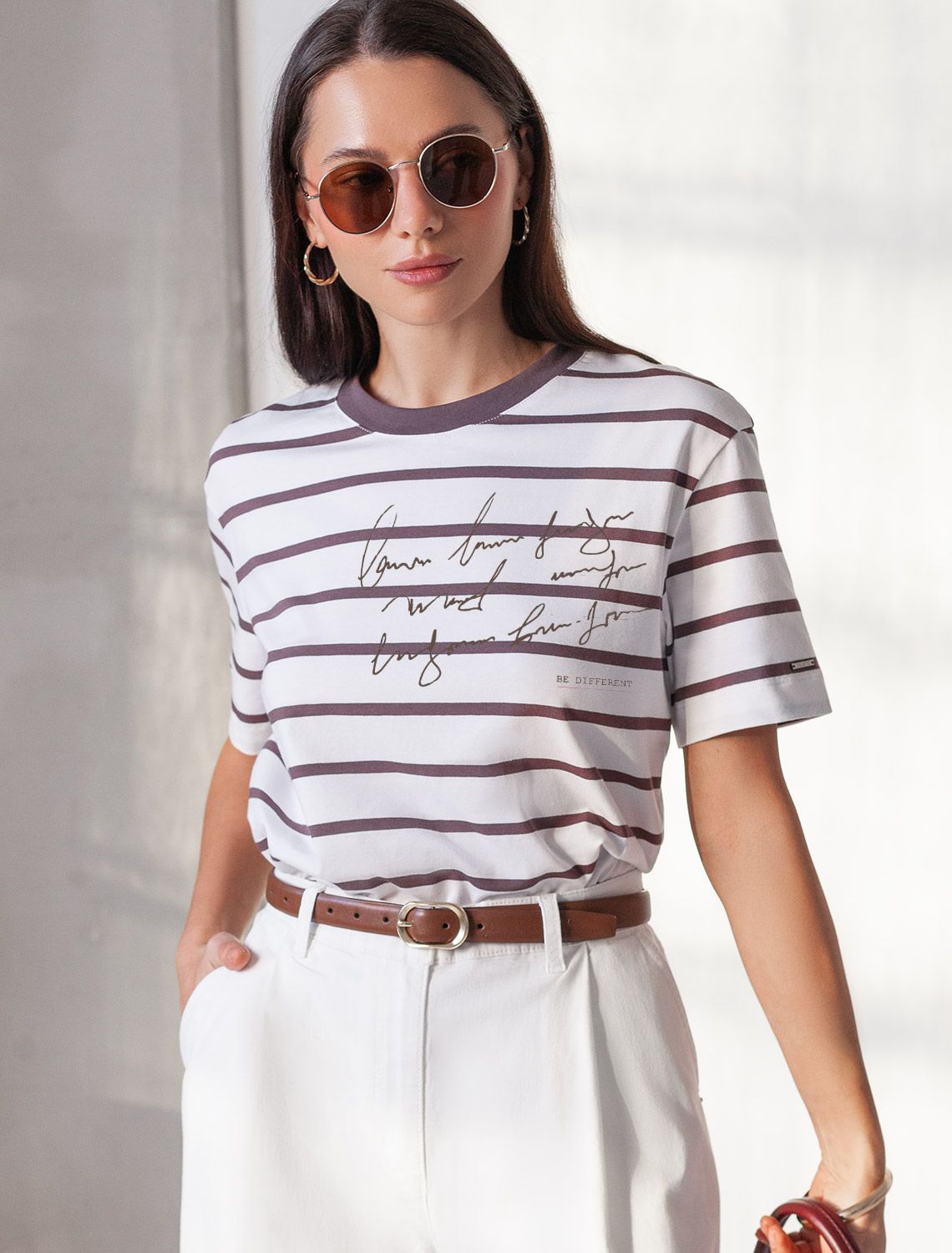 Модная футболка белого цвета в широкую горизонтальную полоску кофейного цвета привлекает внимание своим интересным дизайном и ярким принтом. Благодаря прямому крою изделие комфортно садится на любую фигуру, в том числе на большие размеры, и не сковывает движений. Круглый вырез подчеркивает современный стиль, а натуральный материал плотностью 170 Г/м2 из хлопка с добавлением эластана обеспечивает удобство в повседневной носке и приятные тактильные ощущения. Прочность и износостойкая структура позволяют сохранять свежий внешний вид после множества стирок. Принт в виде надписи нанесен красками с устойчивым покрытием, перевод надписи: Be different. Jast be yourself - Будь другим. Просто будь собой. Стильная футболка гармонично вписывается в любой гардероб и подойдет для прогулок, отдыха или неформальных встреч. Благодаря особенностям кроя модель хорошо сидит, скрывая недостатки и подчеркивая достоинства. Яркая футболка идеально сочетается с базовыми вещами, позволяя создавать новые интересные образы каждый день.