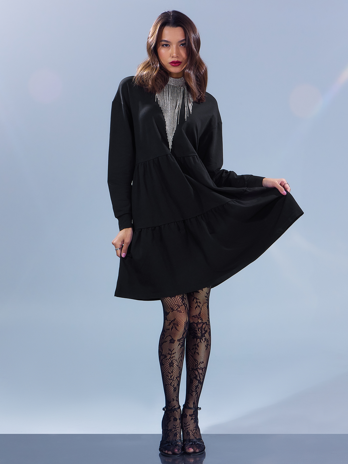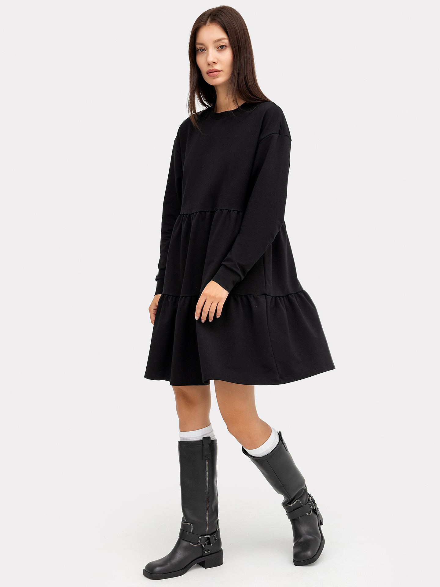 Ультрамодное женское платье А-силуэта из легкого трикотажного футера станет вашим фаворитом. Его длина мини, что придает образу стильную и современную нотку. Вырез классический и круглый, не глубокий, что делает образ изысканным и женственным. Спущенная линия плеча и углубленные проймы добавляют свободу движений, делая платье удобным и практичным. Рукава длинные, на манжетах, что подчеркивает модный и элегантный стиль данной модели. Нижняя часть платья состоит из двух ярусов со сборками, что придает образу романтичности и изысканности. Это платье хорошо сядет на любую фигуру, благодаря своему свободному силуэту и качественному материалу. Стильный, элегантный и модный наряд отлично подойдет для различных мероприятий — вечерних прогулок, свиданий, встреч с друзьями и даже для офиса. Вы сможете создать множество ярких и модных образов в сочетании с различными аксессуарами, сумками и обувью. Платье доступно в классических популярных цветах, что позволит вам выбрать оптимальный вариант длявашего гардероба!