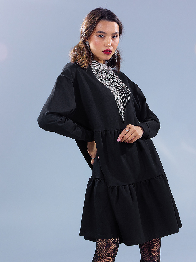 Свободное многоярусное платье мини черного цвета