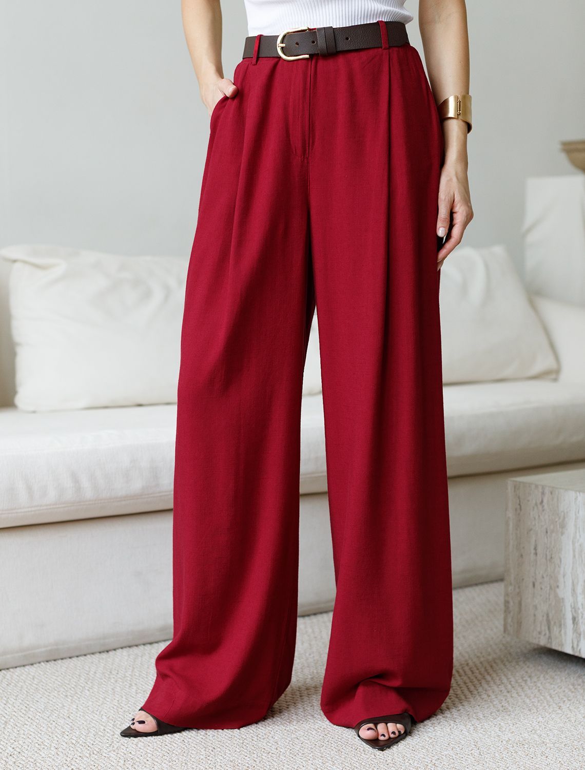 Свободные брюки палаццо гранатового цвета изо льна с вискозой, плотностью 200 Г/м2 — выбор, который легко выделит в любой обстановке. Свободные длинные брюки с высокой посадкой создают идеальный силуэт, визуально вытягивают и стройнят фигуру. Натуральный состав ткани обладает высокой воздухопроницаемостью, хорошо драпируется и мягко прилегает к фигуре, создавая струящиеся складки. Мягкая эластичная резинка, встроенная в пояс брюк, обеспечивает идеальную посадку по фигуре, не сдавливая талию и гарантируя максимальный комфорт при движении. В повседневных брюках будет очень комфортно, благодаря правильной регуляции температуры тела. Брюки подходят на маленький и высокий рост, а так же на любую фигуру, позволяя подчеркнуть достоинства и скрыть возможные недостатки. Летние льняные брюки отлично сочетаются с монохромным верхом для вытягивания силуэта, с ними можно создавать эффектные наряды как на выход, так и для ежедневных рабочих дел или простых прогулок, от делового шика до повседневного кэжуал.